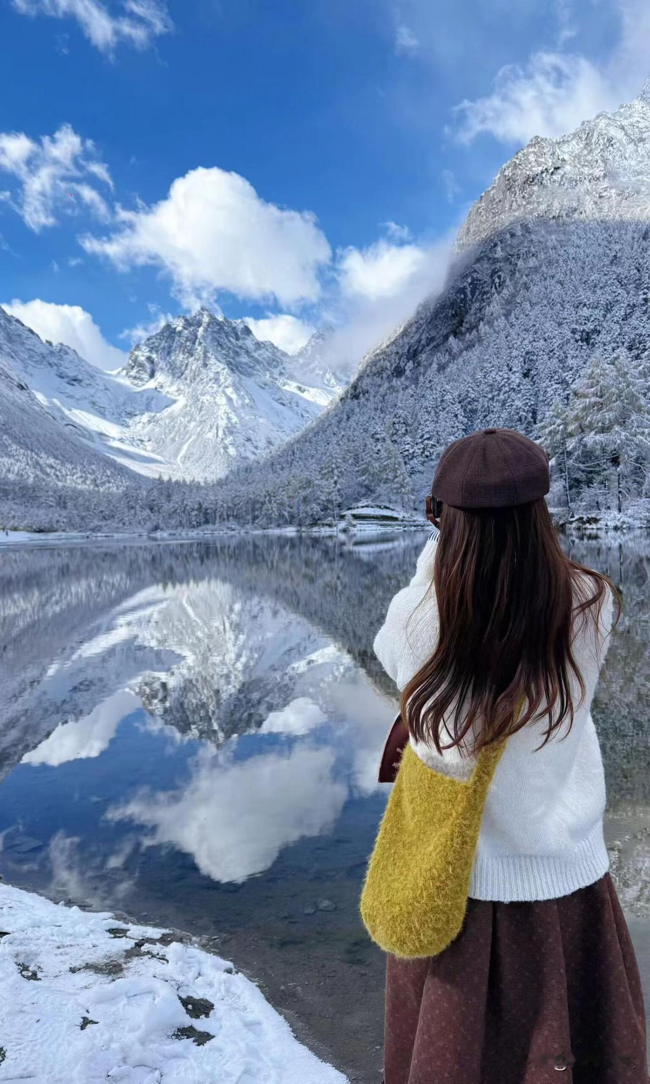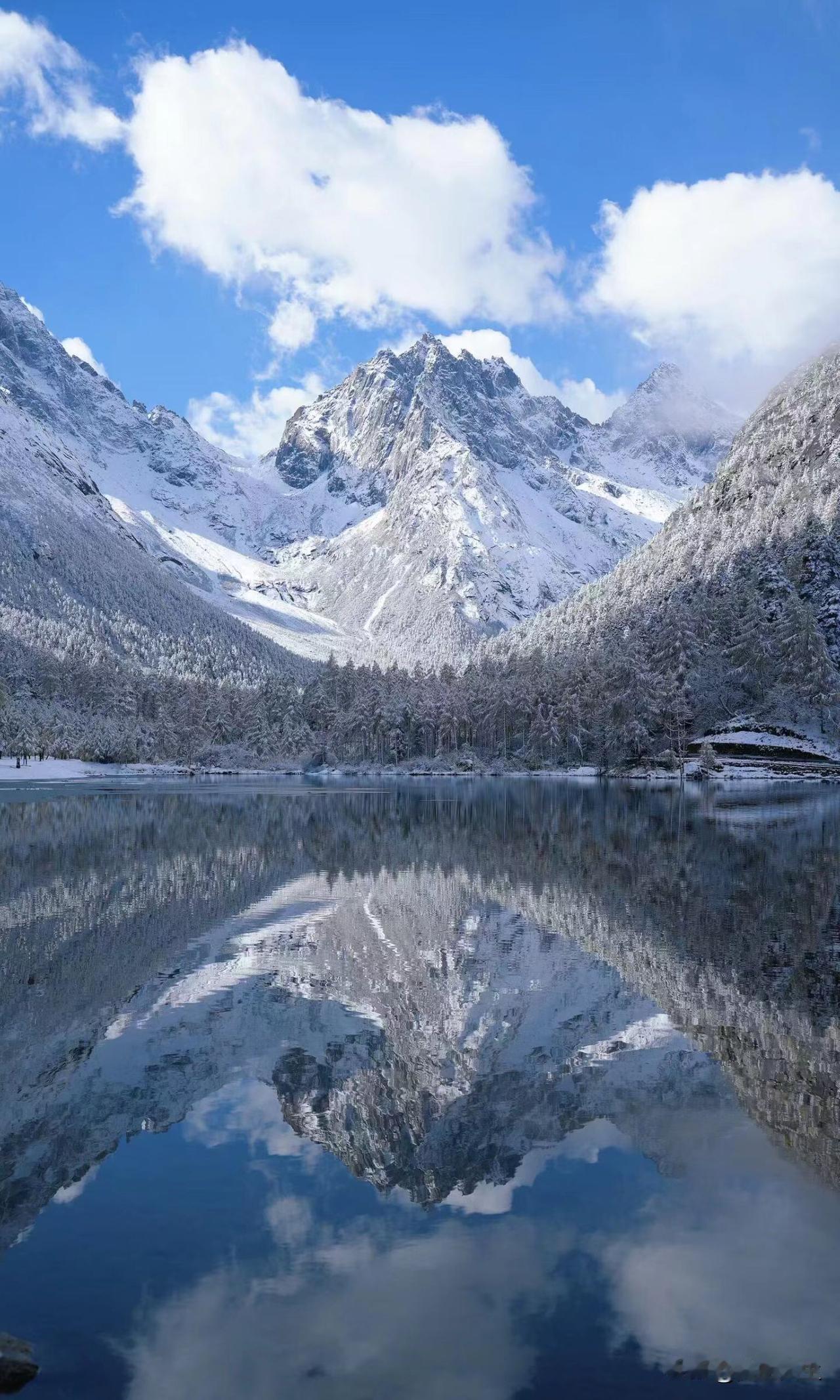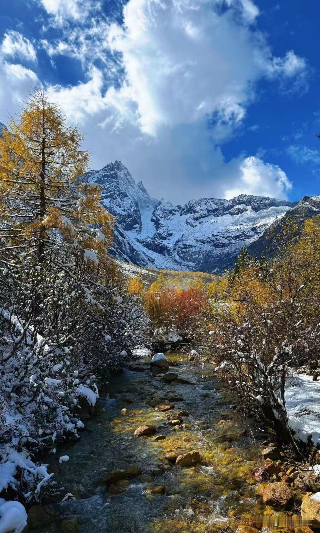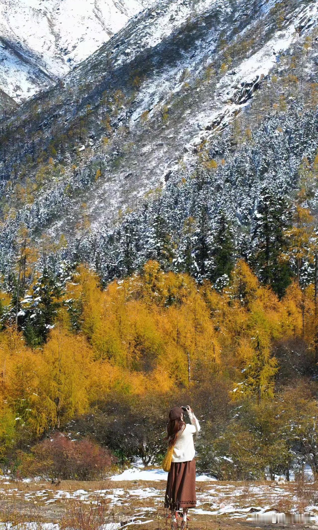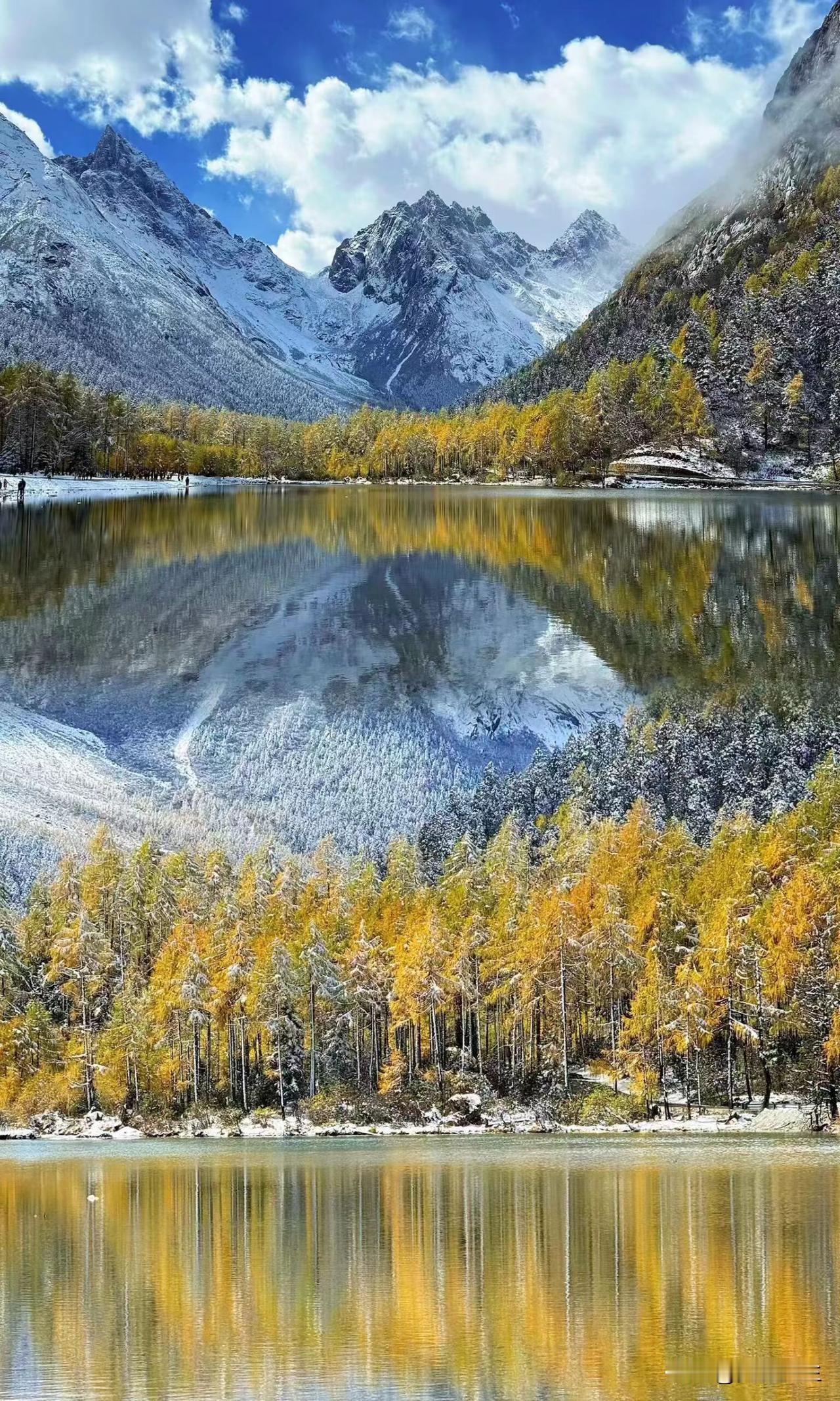彩林、雪山、湖泊~ 秋色与初雪撞了个满怀 像个童话世界不要太浪漫了🏔️