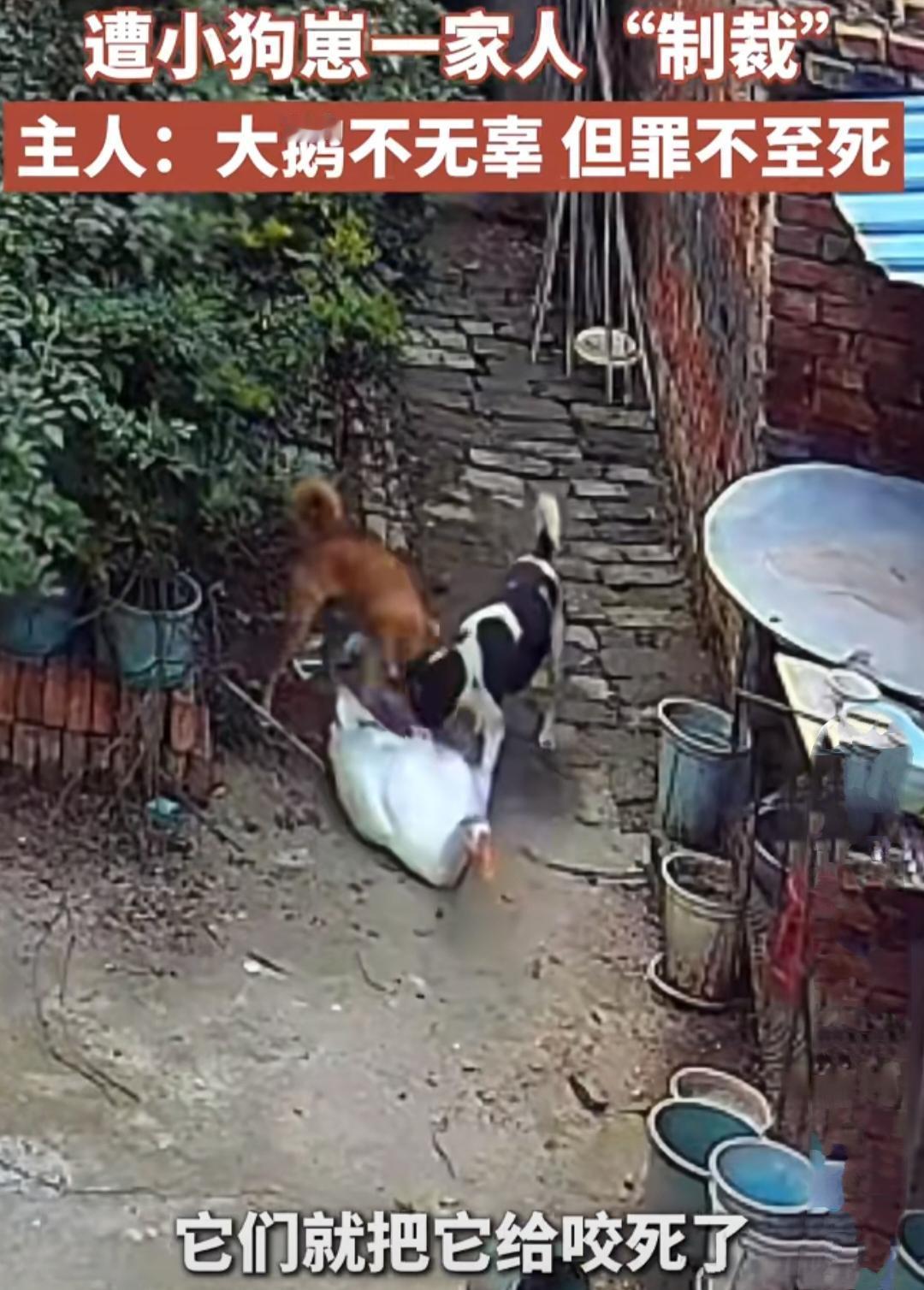 家里大鹅霸凌小狗,没曾想转身被小狗一家反杀 近日周女士发的一个视频引起了大家的热议:自己家的大鹅欺负小狗,咬了以下,结果被小狗一家围攻给咬死了。 鹅其实不无辜,但就是咬了一下小狗,罪不至死吧,这小狗一家是真真切切的给我们展示了什么叫团结。 狗亦如此,何况人呢?