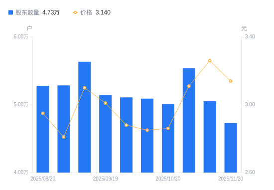 近一年(2024年11月20日至2025年11月20日),南山控股A股股东户数从4.61万户,增加至4.73万户,增幅2.58%,区间股价上涨22.66%。