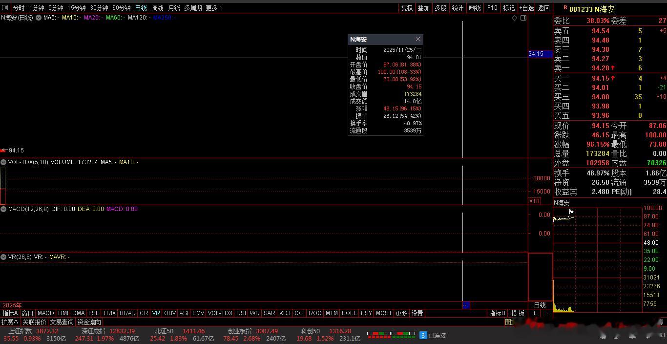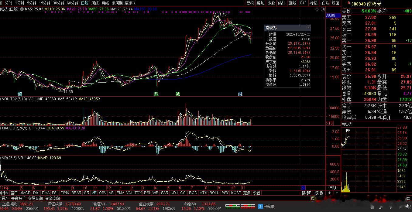 【财富晚茶】午盘透析(11.25):北证涨幅1.65%:游戏反弹渔业回调导语:作者系《网易号》优质财经领域创作者。曾经原创作者和知名网易号旅游领域创作者。大跨度行业等的写作,颇受网友喜爱。作品发表于2025.11.25.12:18 优雅端庄晚风。【内容概述】今日股市午评:截止11:30:沪指:贡献1根阳线1阴线。深指:贡献1根阳线1阴线。沪指突破:阻力位:03854点。沪指突破:支撑位:03816点。深指突破:阻力位:12655点。 深指突破:支撑位:12448点。追寻盘面:沪深高开主力拉升,尾盘空头打压徒劳。一、透析市场:风口公司,上下起伏300940 南极光 盘中02涨1、突破五年箱顶视野盘面:前期双顶:触底反弹。2025-11-24截至11:30:股价报收:26.96元。该股上涨:5.03%。成交总量:43098手,成交金额:1.14亿元。总换手率2.74%,观总市值:59.91亿元。流通市值:42.35亿元。2、零售终端翘楚主营业务:背光源研产和销售。公司品牌:深圳市自主创新百强中小企业。3、营收净利优秀财报透视:2025-09-30 三季度报:公司营收:6.1533亿 同比增158.18%。公司净利:1.1014亿 同比增7228.28%。二、沪深红盘:多方强势,喜剧股市今天目击:沪深北市:早盘:高开一跌,一涨六跌。尾盘:一涨一跌,次低绿盘。看点之一:股盘高开:盘中震荡:瞬间回落。看点之二:一黑天鹅:创指虚弱:盘中跌约1%,失守2900点。看点之三:沪深北市:半日成交:10326亿元。盘面追踪:3201股飘红。三、沪深阳棒:个股强势,赚钱效应沪深追踪:截至午间:市场收盘:沪指跌0.34%报3821.68点,深指跌0.59%,创指跌0.77%,北证50指跌0.12%,沪深北市:10326亿元。四、盘面观察:游戏脉冲,渔业回落1、板块扫描透析沪深板块:板块走强:游戏、半导体、有色、保险、医药、汽车等。板块回调:渔业、航空等。概念活跃:CPO概念、消费电子、存储芯片等。2、个股涨跌起伏沪深北市:多空遭遇。4891股票上涨,90涨停板。460股票下跌,5股跌停板。沪深北市:合计成交:11832亿元。午盘视野:沪深高开收复失地,尾盘杀跌化险为夷。五、沪深涨跌:三甲前茅,安不忘危1、今日涨幅谁家主旋律:天经地义:风口股票涨停板001233 N海安 688205 德科立 688227 品高股份 第一、涨幅榜眼排行榜-1:001233 N海安主营业务:巨型全钢工程机械子午线轮胎-矿用轮胎研产和销售。公司品牌:国内全钢巨胎行业的龙头企业。排行榜-2:688205 德科立主营业务:光电子器件研产和销售。公司品牌:国内领先国际一流光电子行业领军企业。排行榜-3:688227 品高股份主营业务:云计算业务-行业信息化的研产和销售。公司品牌:垂直领域全栈自主可控解决方案领先者。第二、综评榜技术看盘-1:001233 N海安。潜力股票-1:001233 N海安:国内全钢巨胎行业的龙头企业。风险股票-1:暂时没有:即无301092 争光股份。2、今日跌幅谁家主旋律:摇摇欲坠:弱势股票涨停板920091 大鹏工业300094 国联水产300379 *ST东通跌幅榜-1:920091 大鹏工业主营业务:工业精密清洗装备-装备升级改造-工业清洗剂备件服务等的研产和销售。公司品牌:国内领先精密工业清洗系统配套服务的供应商。跌幅榜-2:300094 国联水产主营业务:对虾罗非鱼等水产种苗研产和销售。公司品牌:国内水产食品-水产预制菜领军企业。跌幅榜-3:300379 *ST东通主营业务:技术推广软件服务-计算机软件辅助设备的研产和销售。公司品牌:国内领先的大安全及行业信息化解决方案提供商。六、创作不易:优质网易,财经作者投资投机迷茫之中:给予尽可能有帮助:资本市场风险自负。(优雅端庄晚风《网易号》财经领域创作者和原创作者 违者必究)