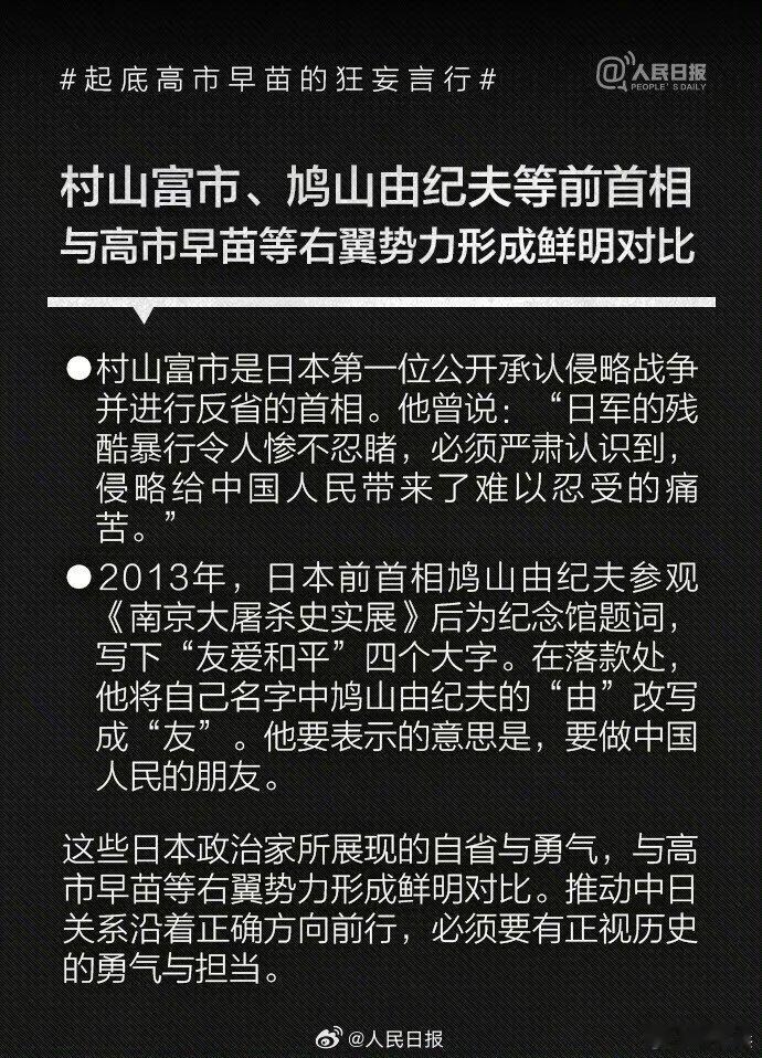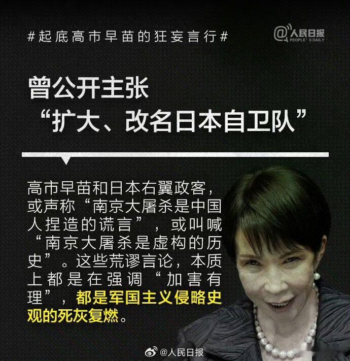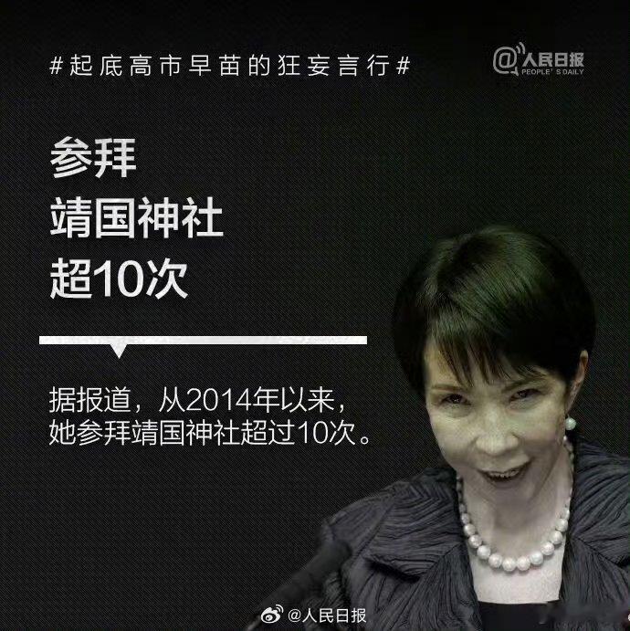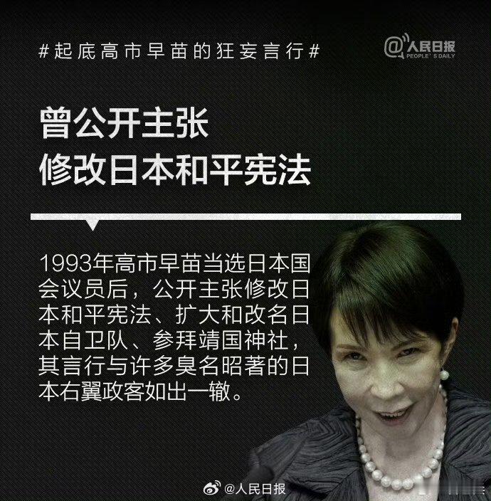 【】1993年高市早苗当选日本国会议员后,公开主张修改日本和平宪法、扩大和改名日本自卫队、参拜靖国神社,其言行与许多臭名昭著的日本右翼政客如出一辙。。历史的教训岂敢忘却!我们