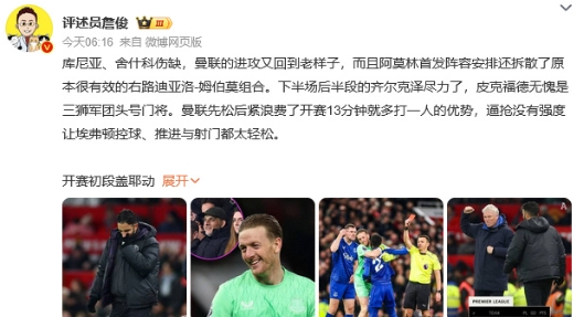曼联本轮0-1不敌十人埃弗顿,赛后@评述员詹俊 发文点评: