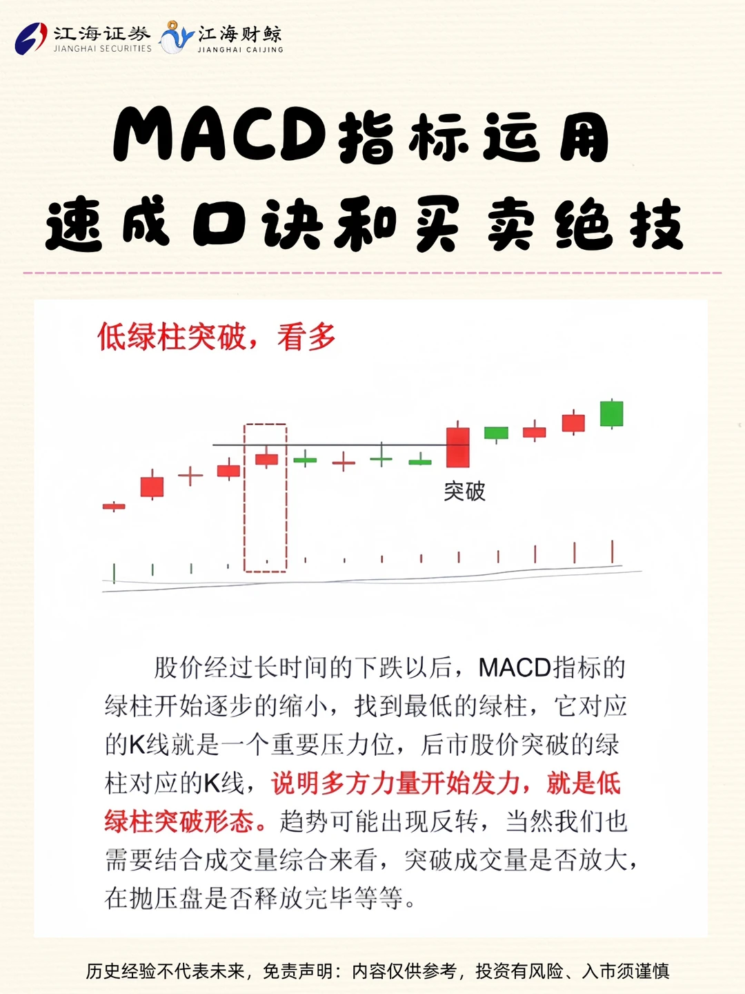 [拔草R]绝四:日线MACD最后一根绿柱买入法则股票下跌一轮后,做空动能逐渐衰竭,做多动能进一步增强,当做空动能衰竭到极限时,随后做多力量喷薄爆发!(前提条件是60分钟图必须出现1-2根红柱线),尤其是圆弧底的形态更为可靠)