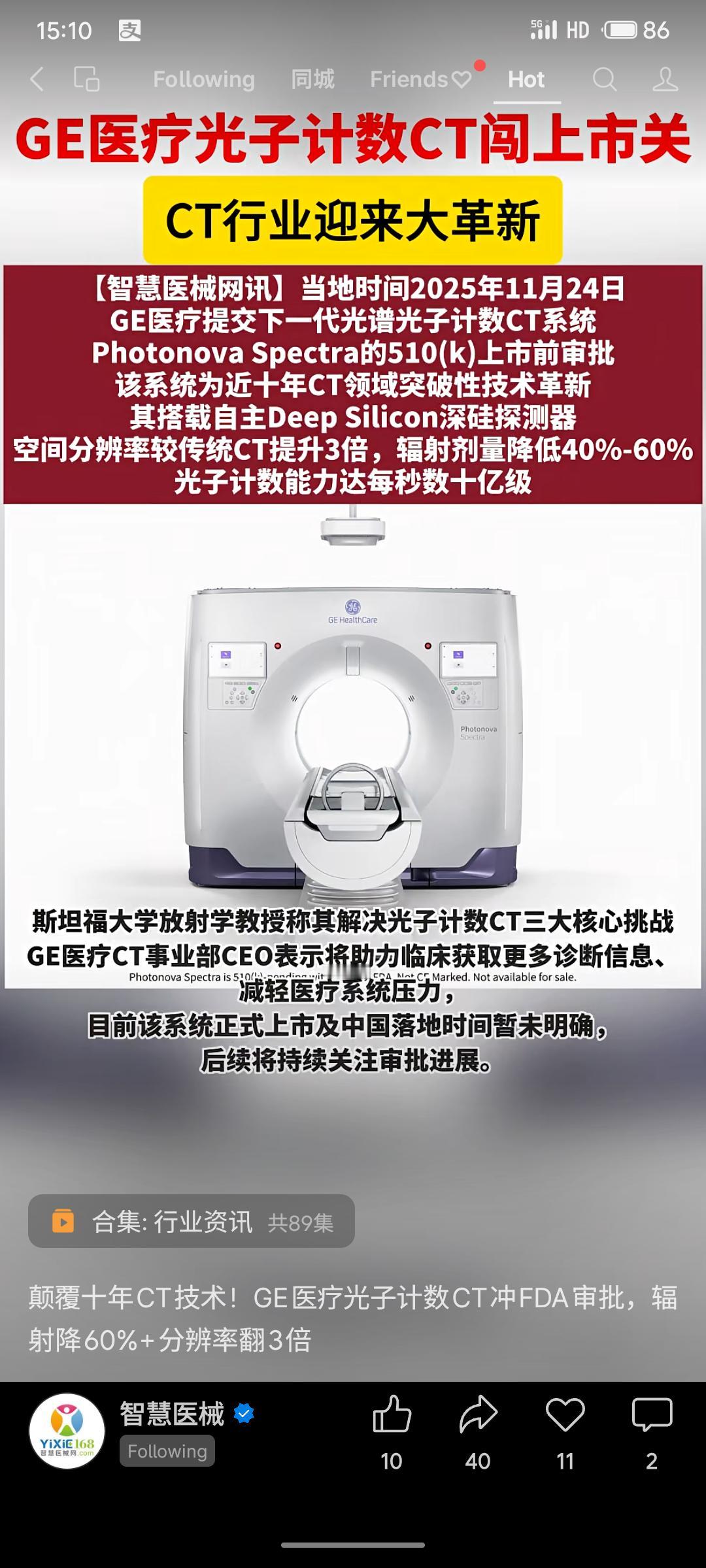 GE医疗近日向FDA提交了革命性的Photonova Spectra光子计数CT系统。该技术采用深硅探测器,能将空间分辨率提升3倍,同时降低40%-60%辐射剂量,实现更精准、安全的医学成像,标志着近十年CT领域的重大技术突破。