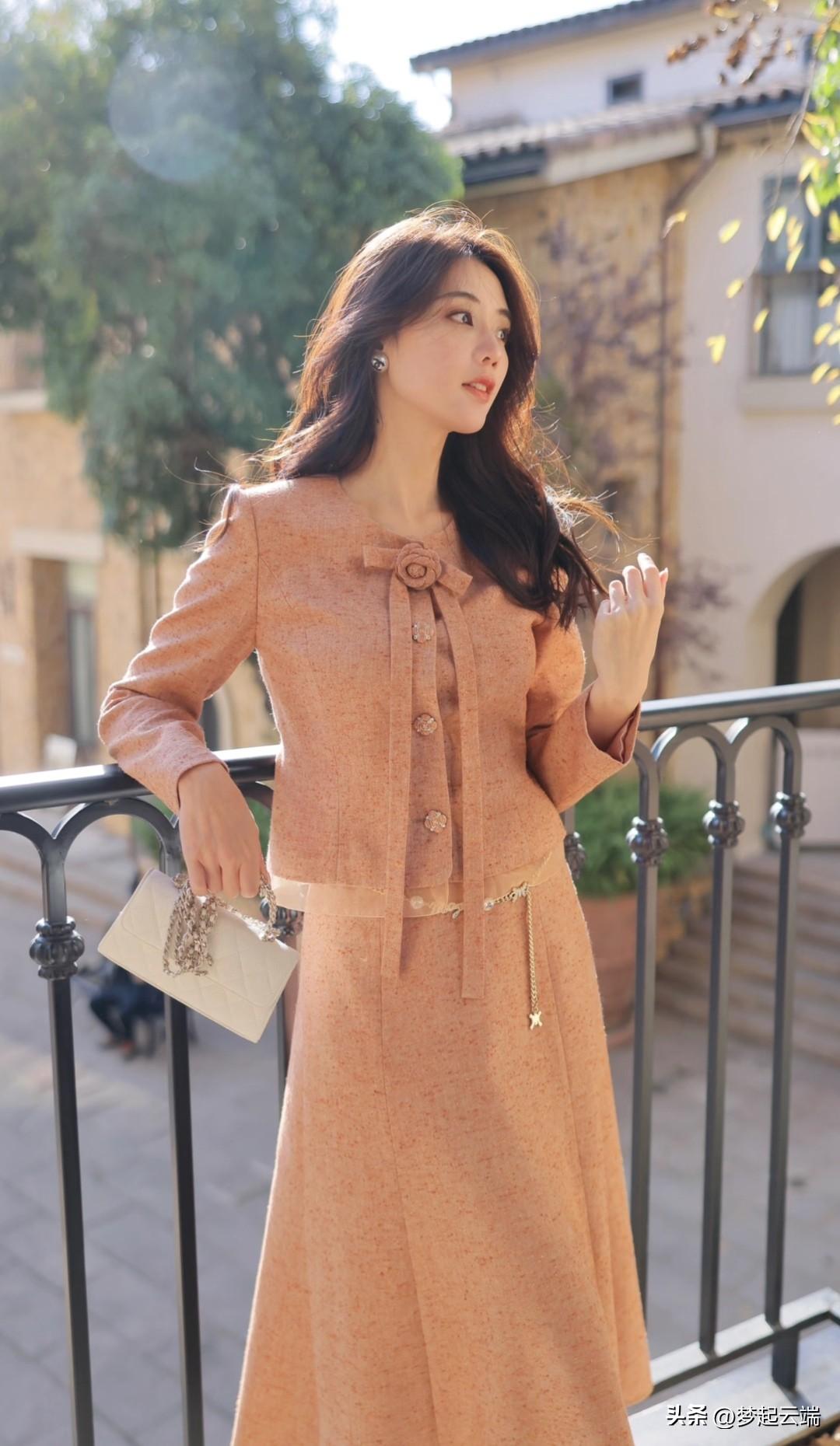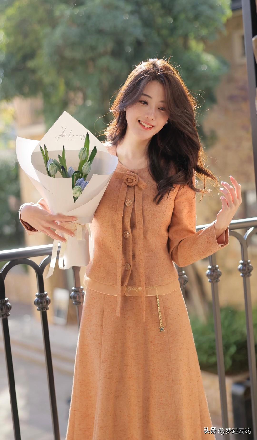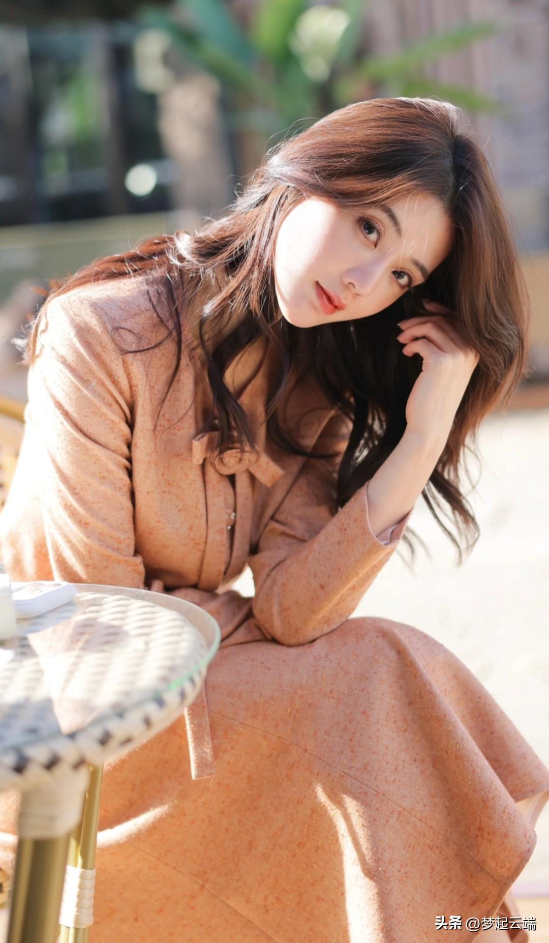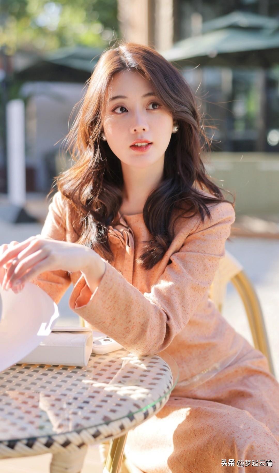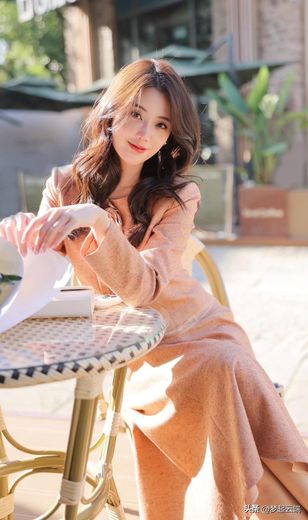 阳光下的优雅时光,浅棕色连衣裙,咖啡馆的悠闲午后。