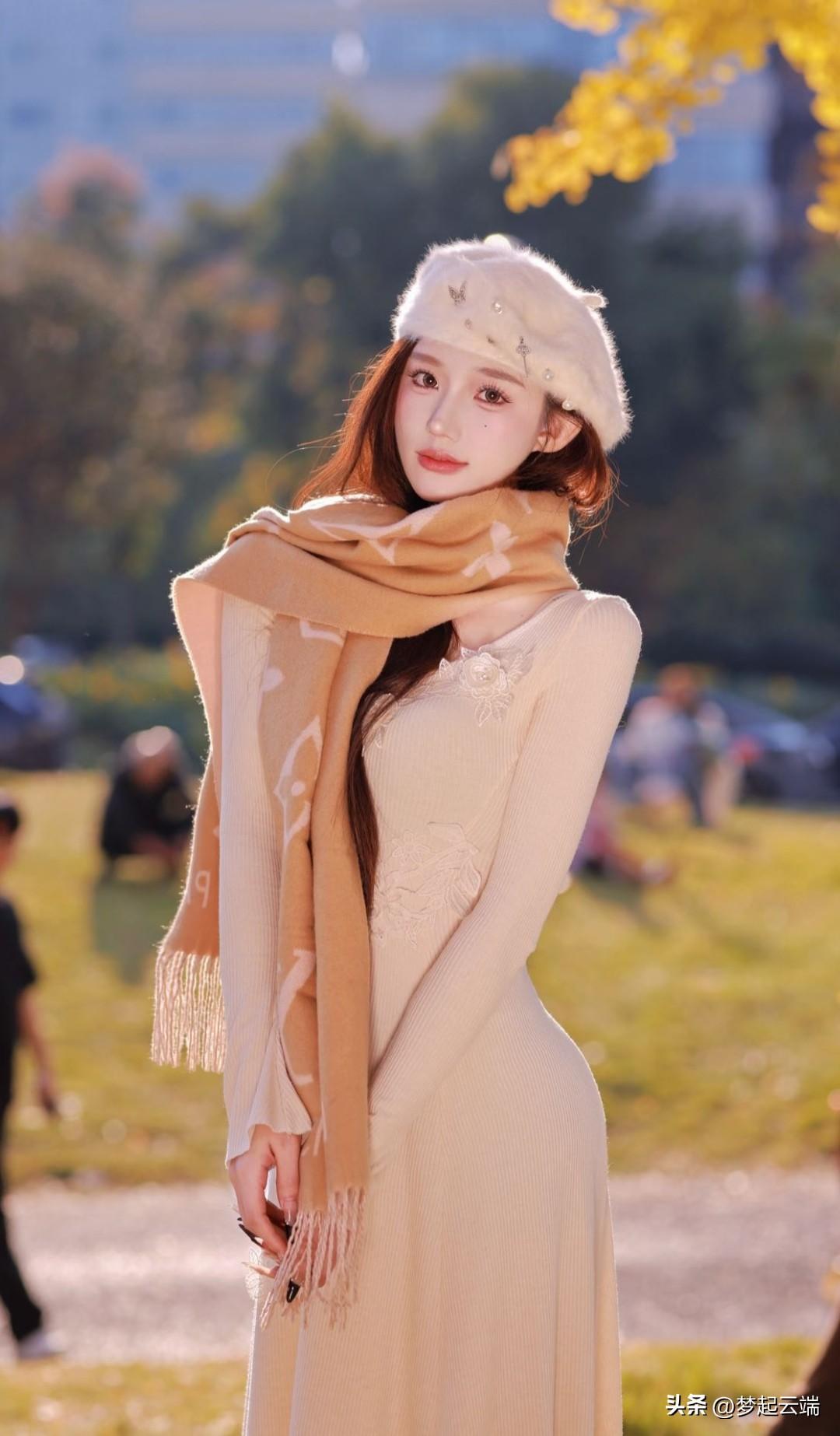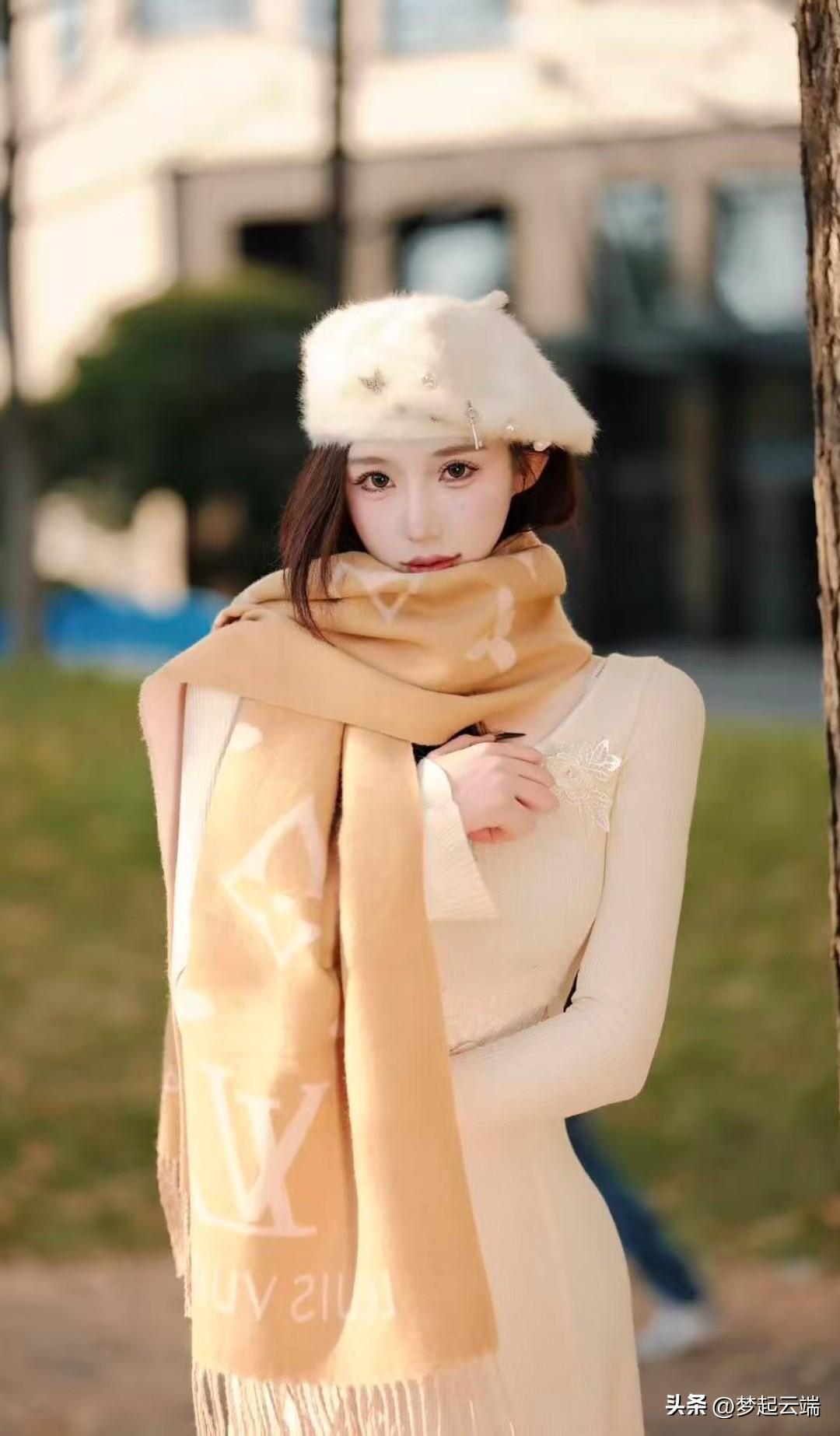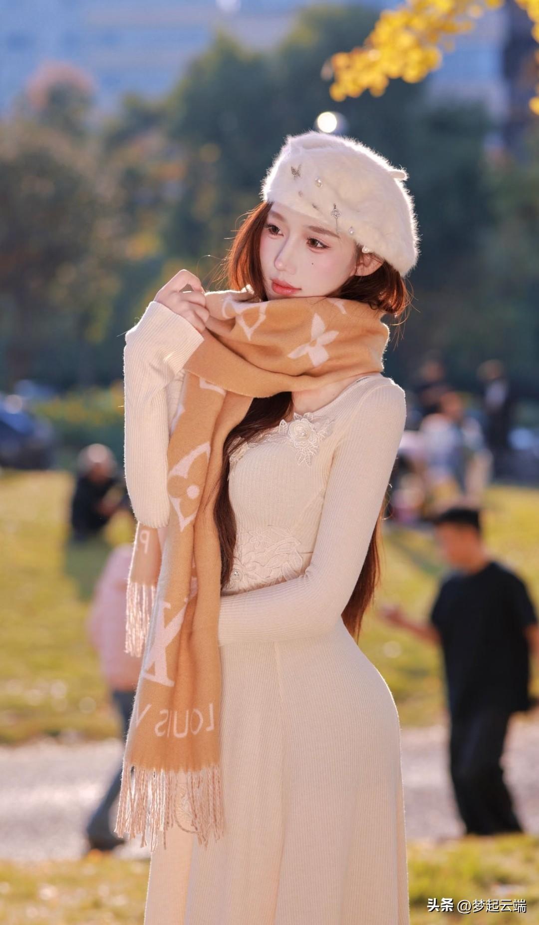 秋日暖阳下,少女轻抚围巾,唯美动人。