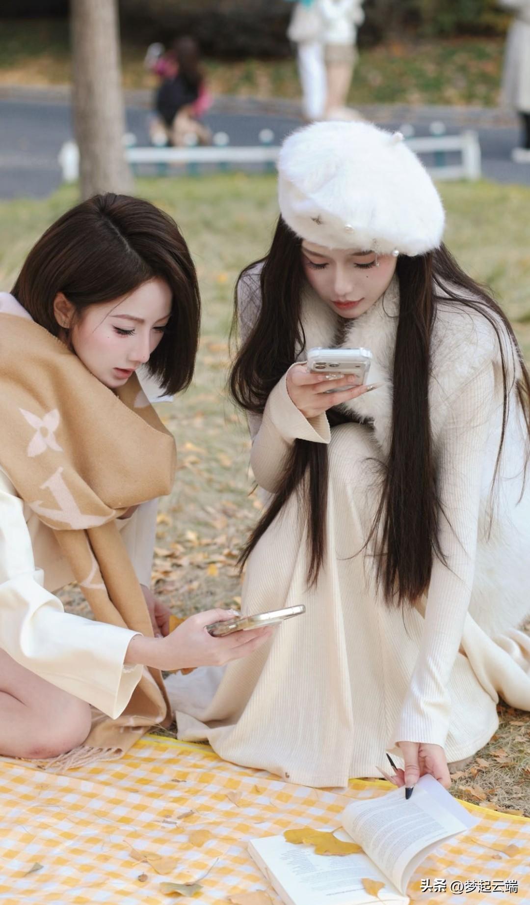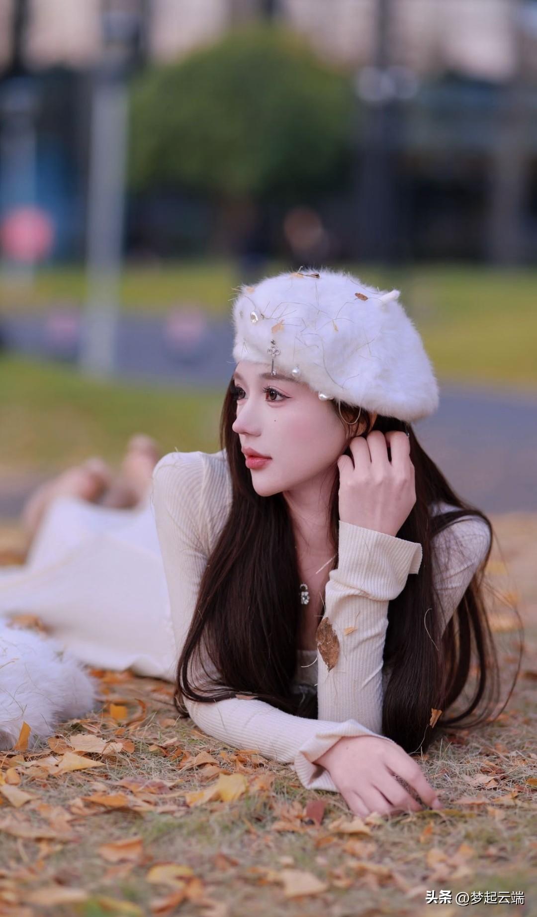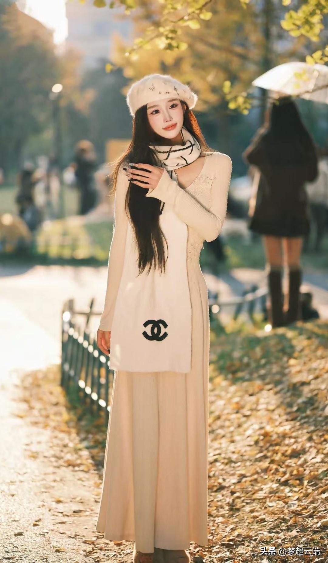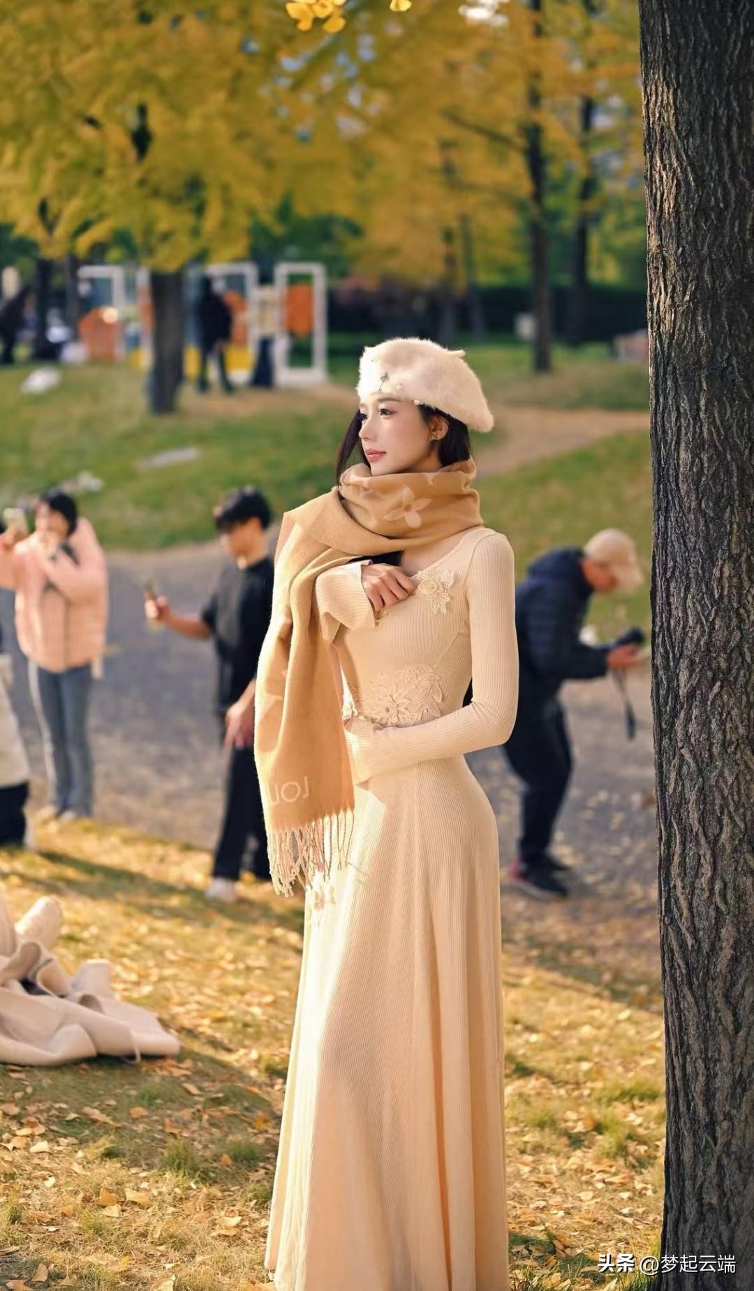秋日暖阳下,少女轻抚围巾,唯美动人。