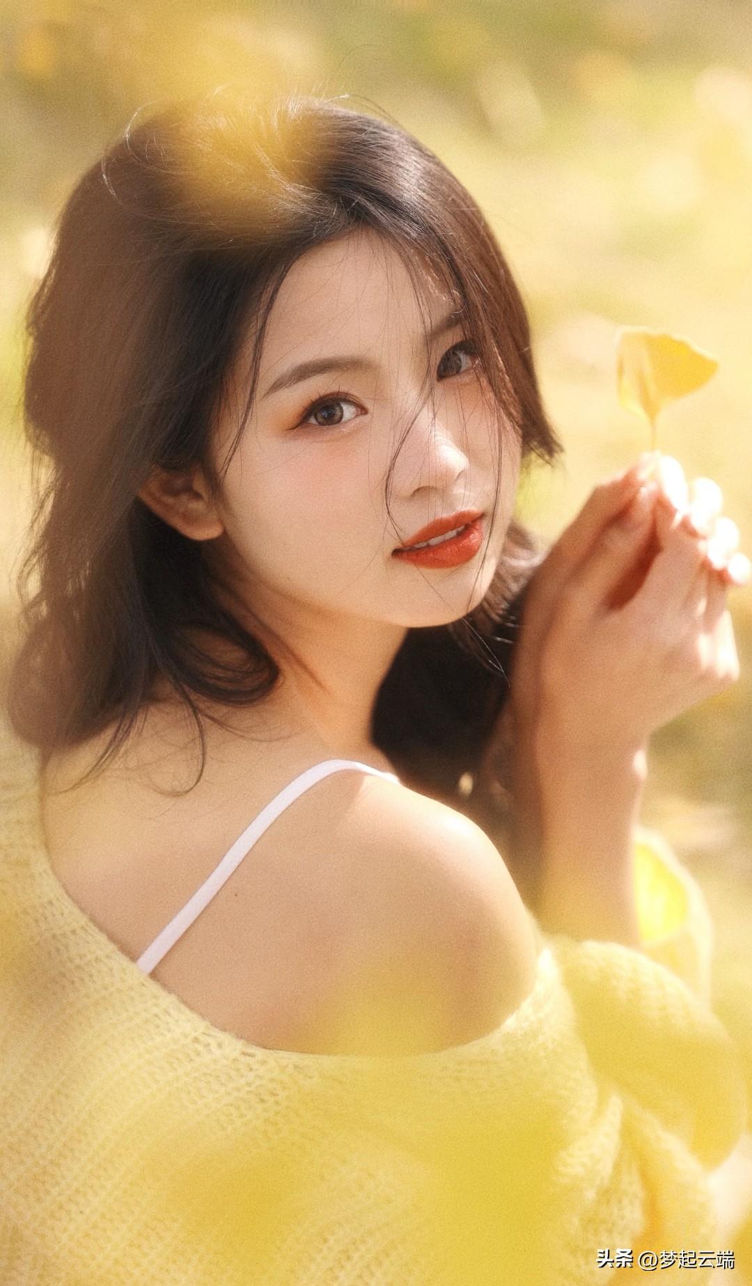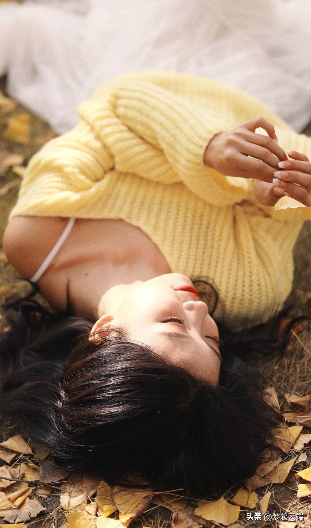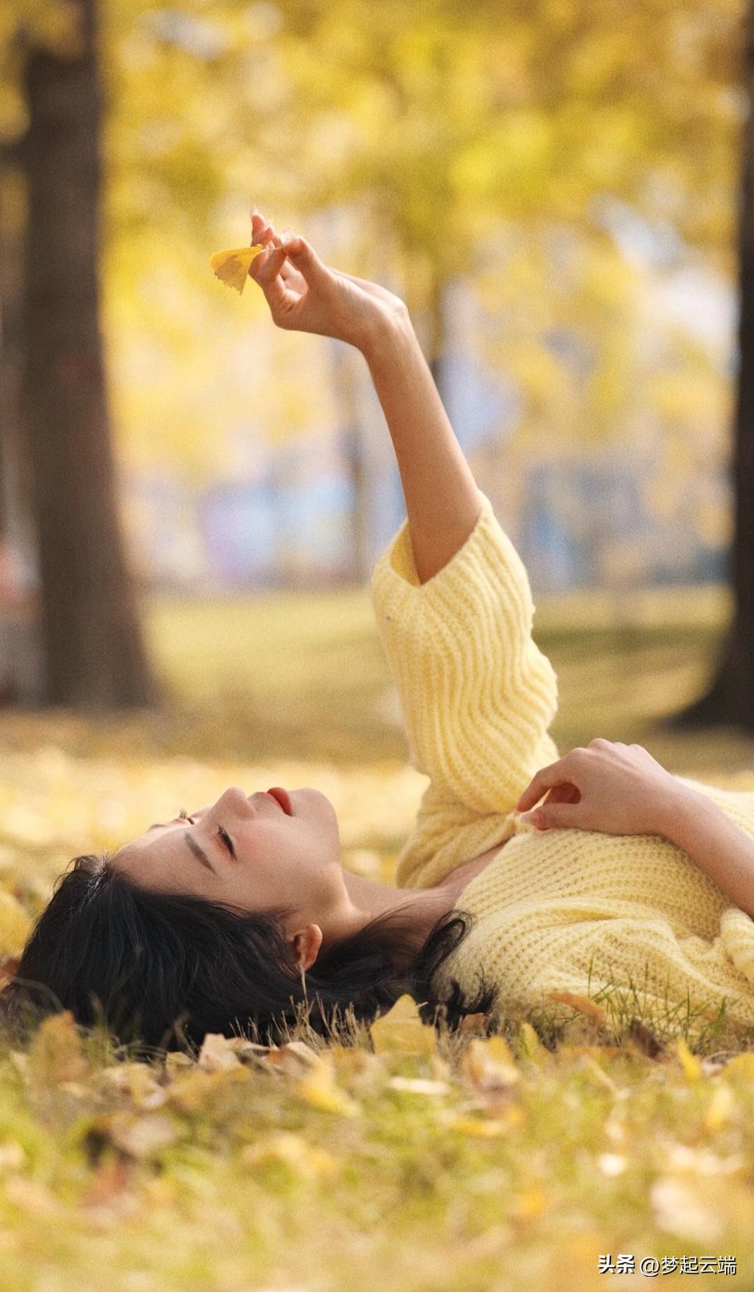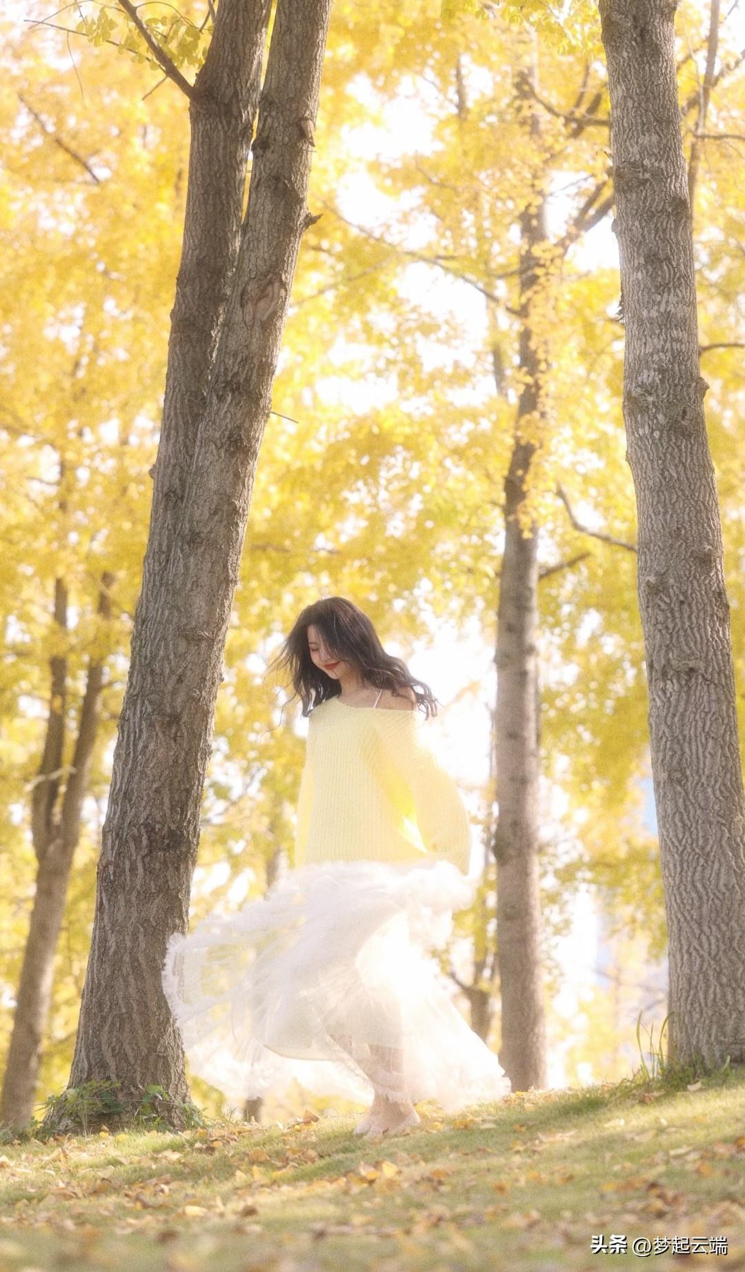 秋日暖阳下,少女倚树轻笑,温暖如阳光。