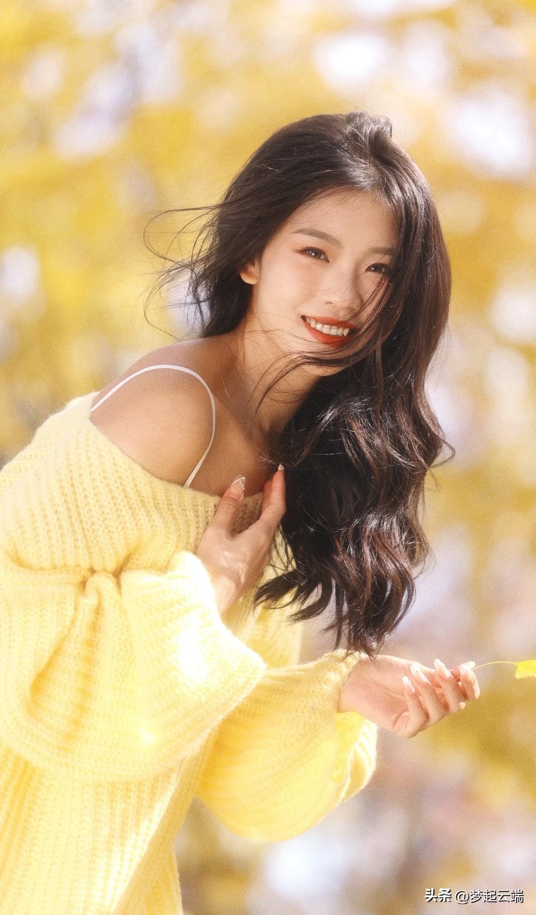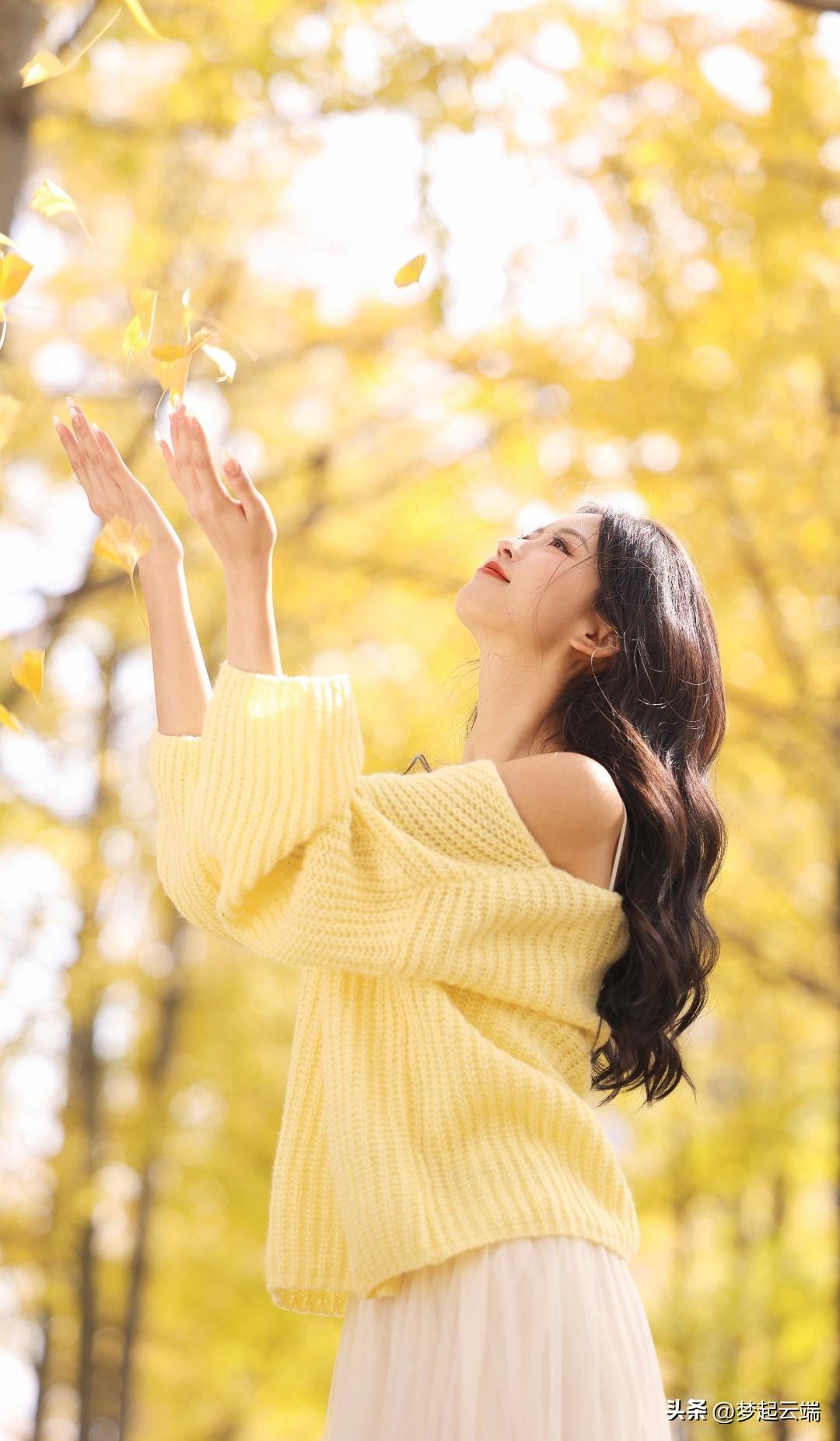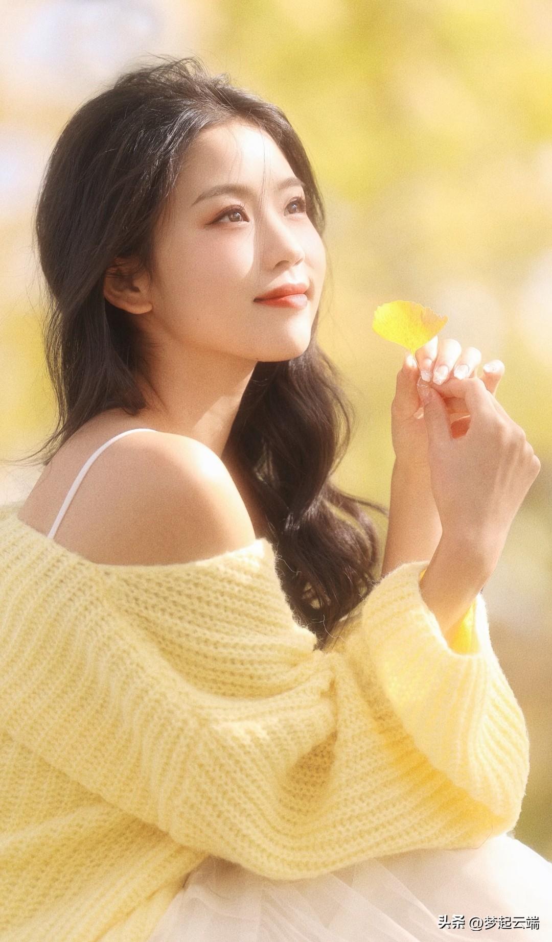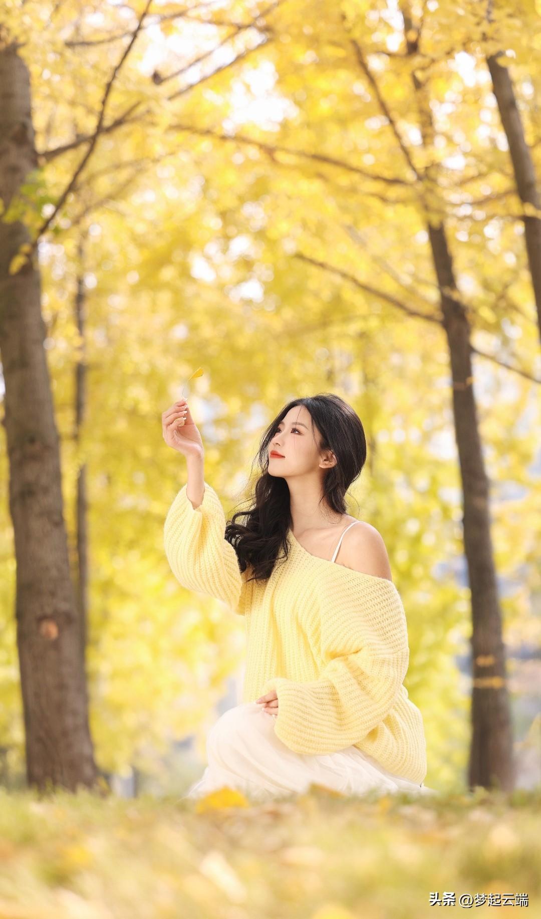 秋日暖阳下,少女倚树轻笑,温暖如阳光。