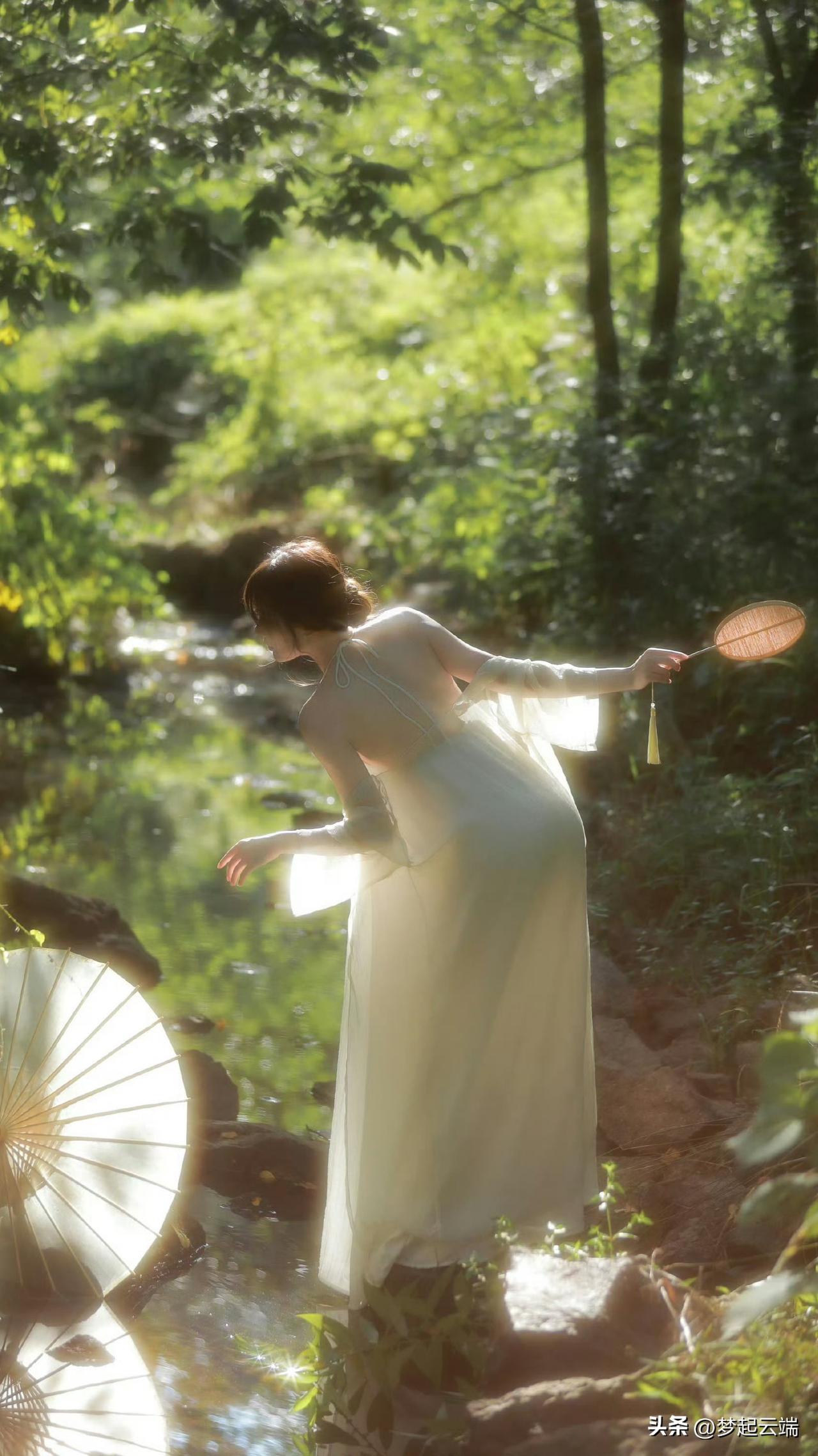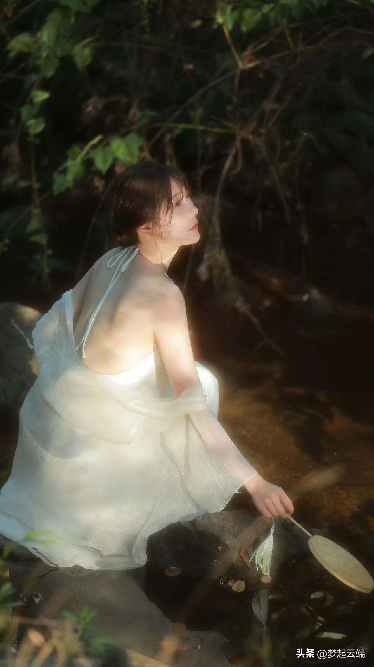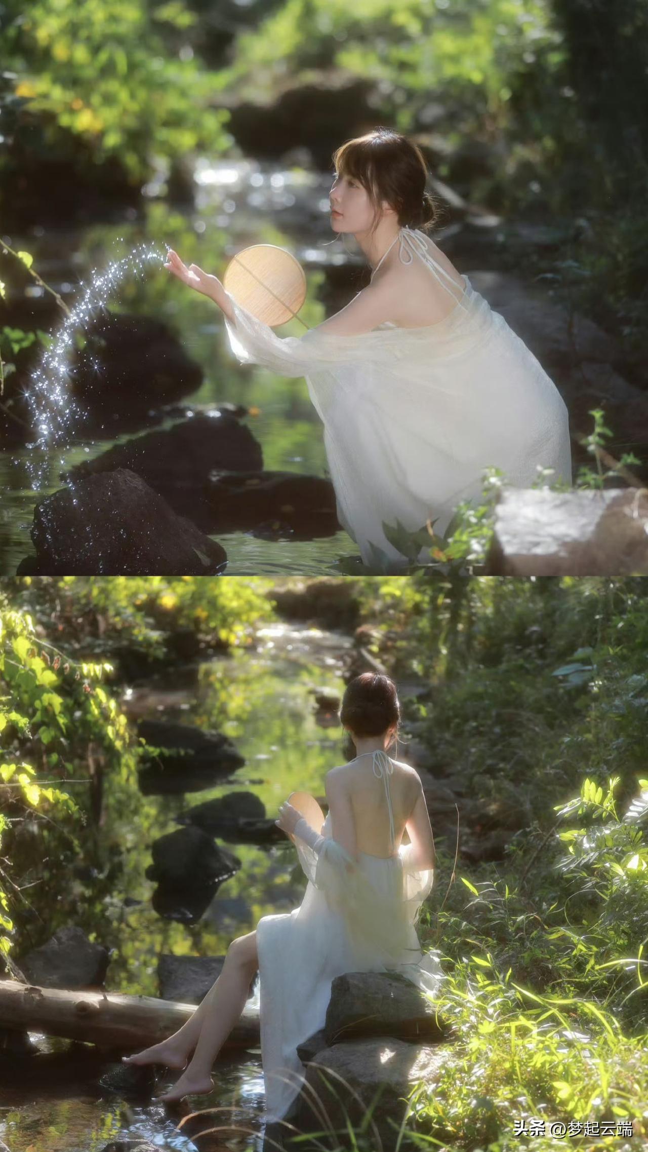 在阳光洒满的溪流边,她轻抚水面,仿佛与自然融为一体。