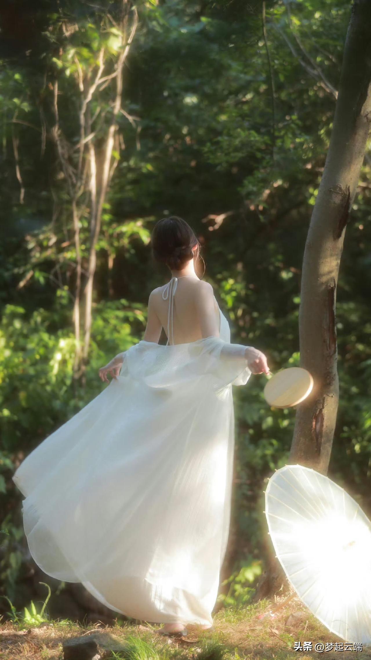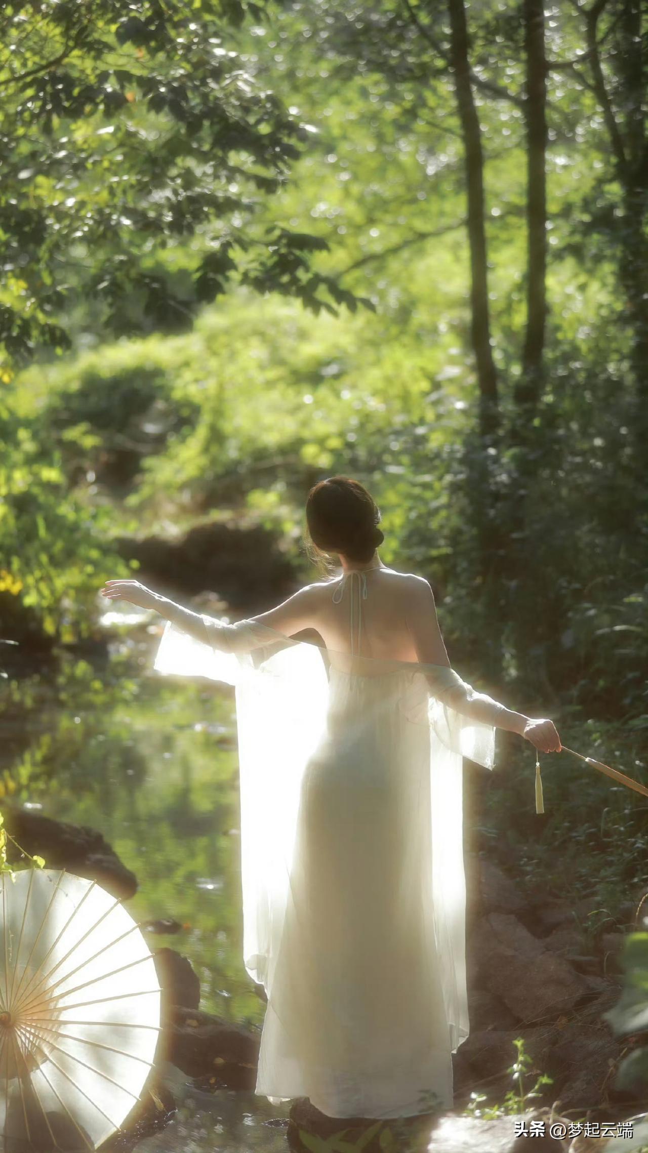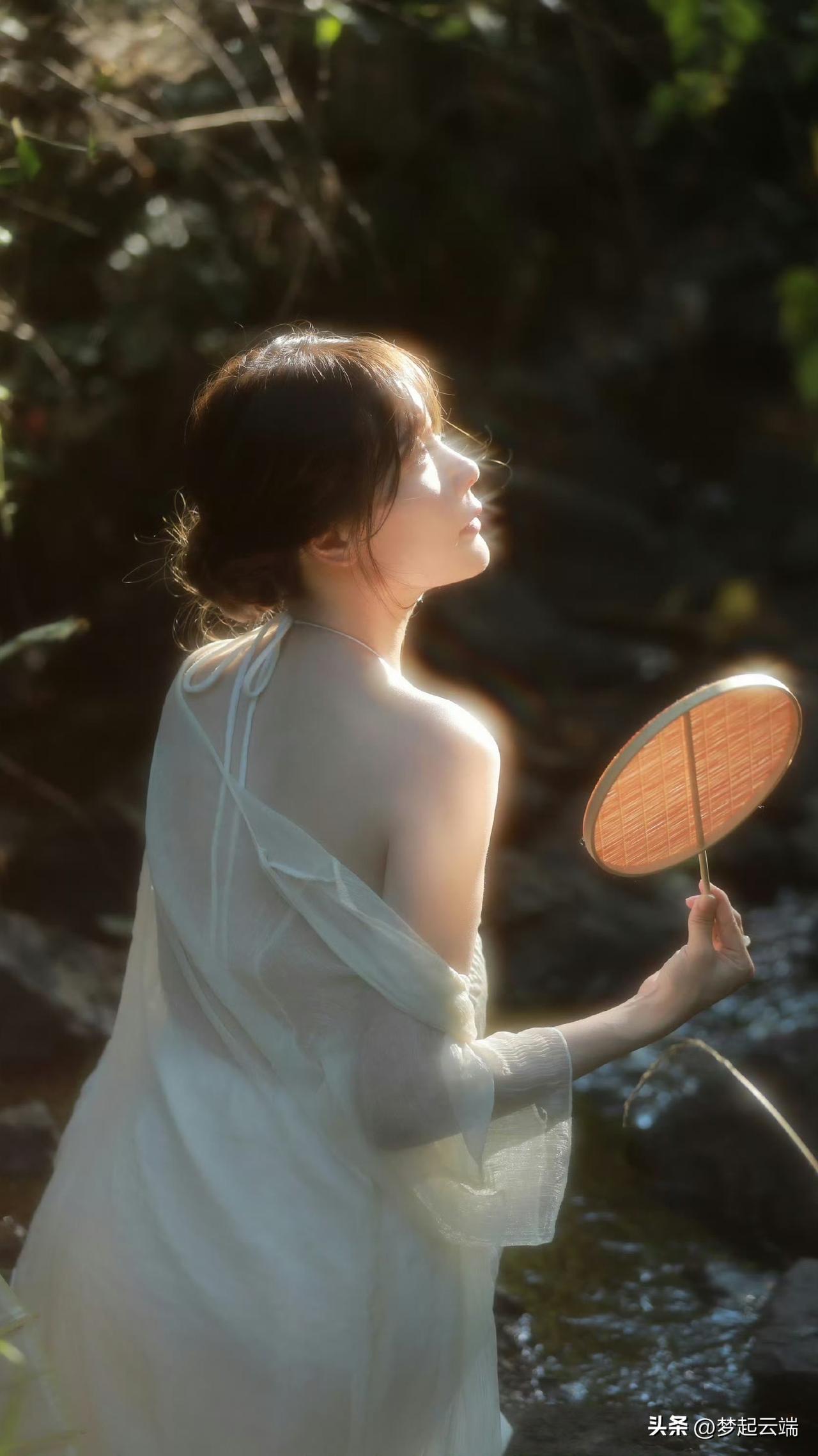 在阳光洒满的溪流边,她轻抚水面,仿佛与自然融为一体。