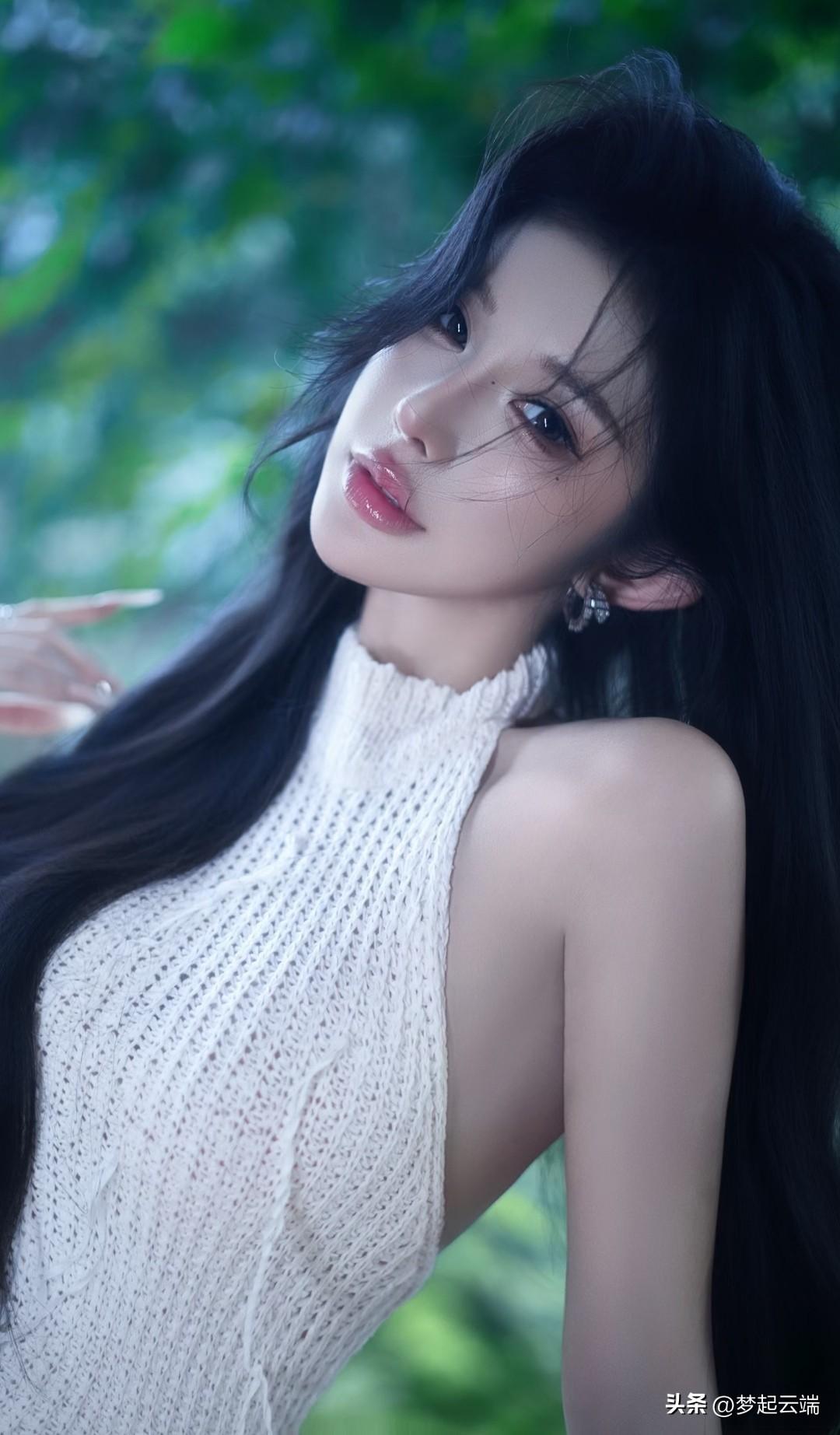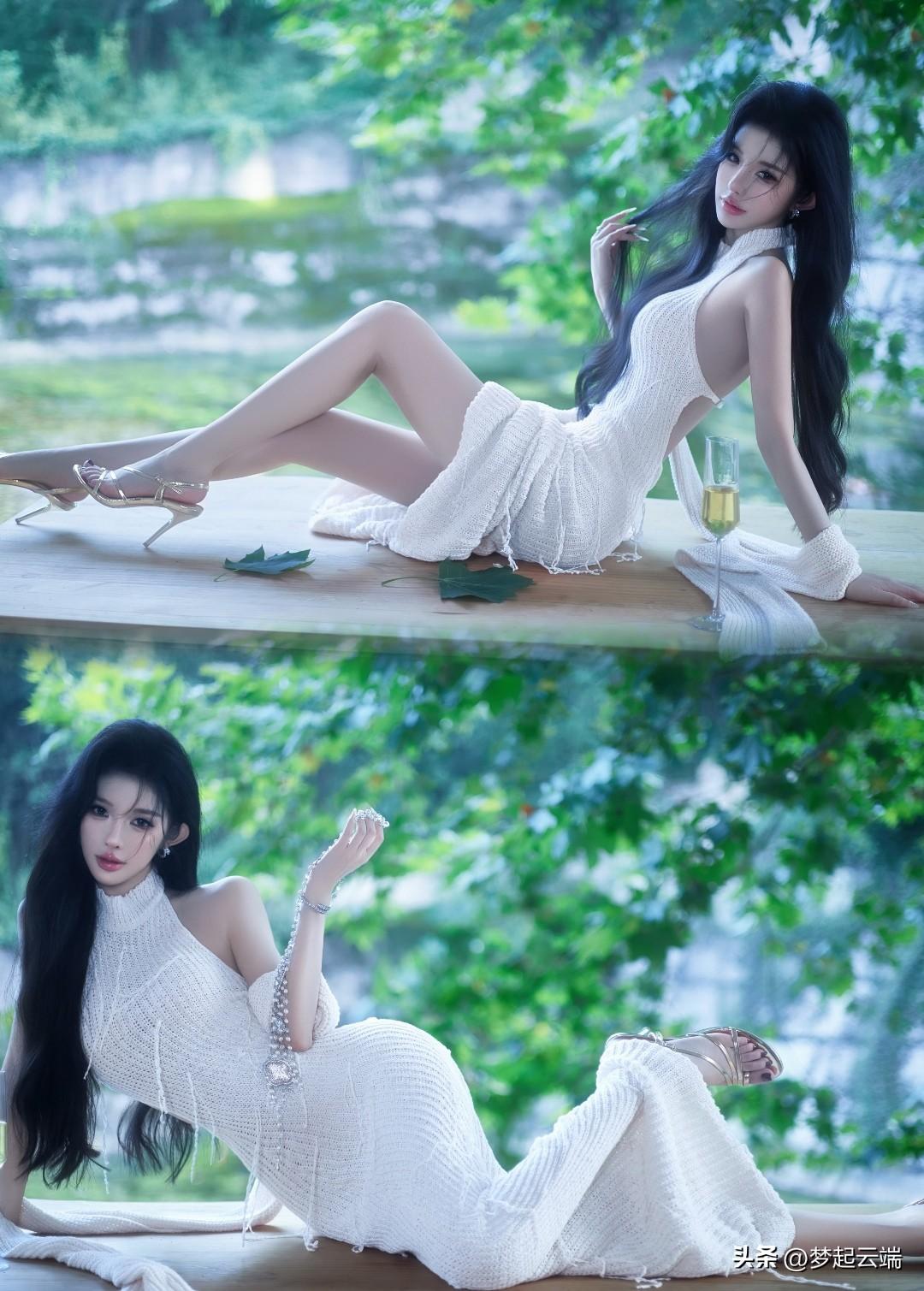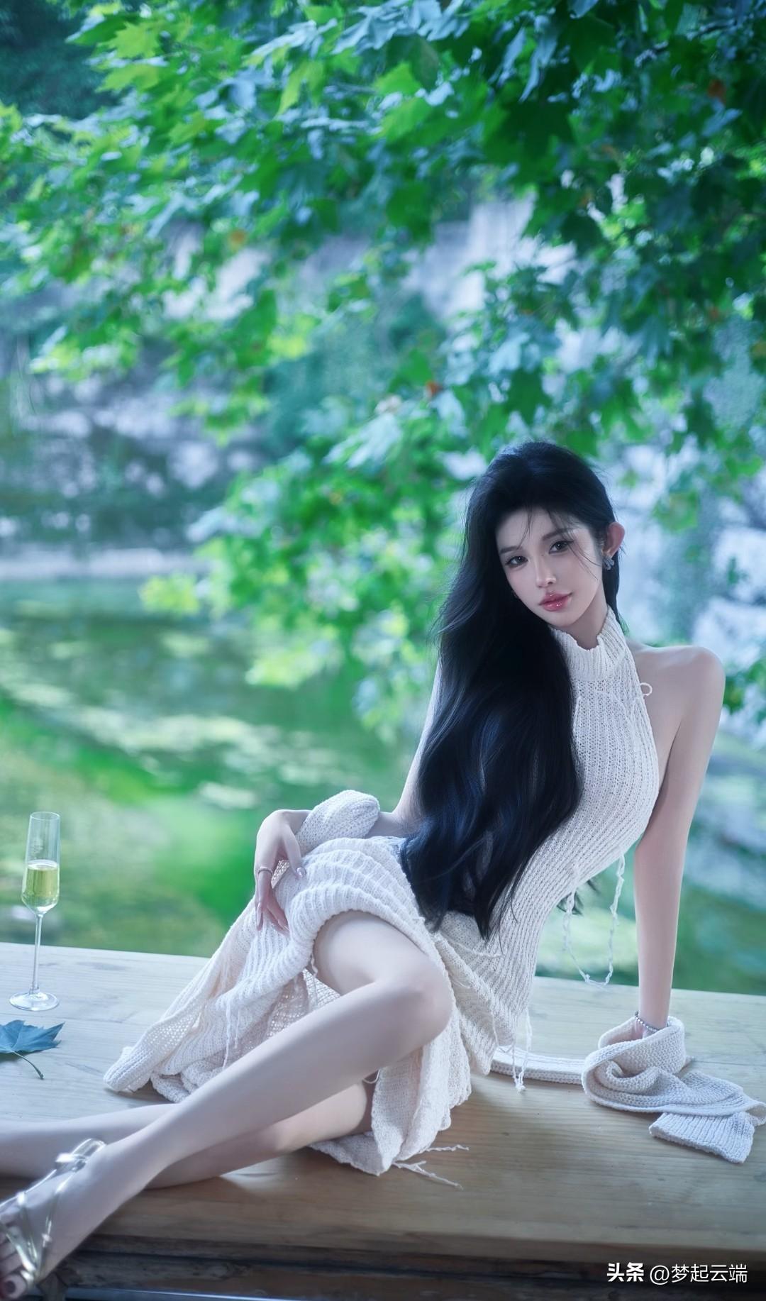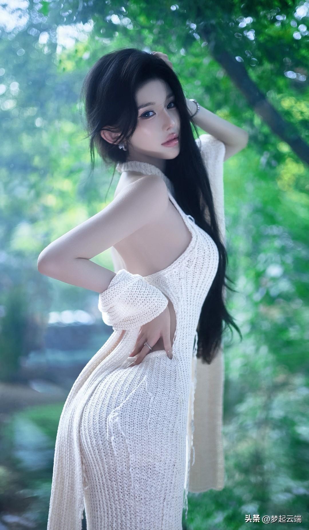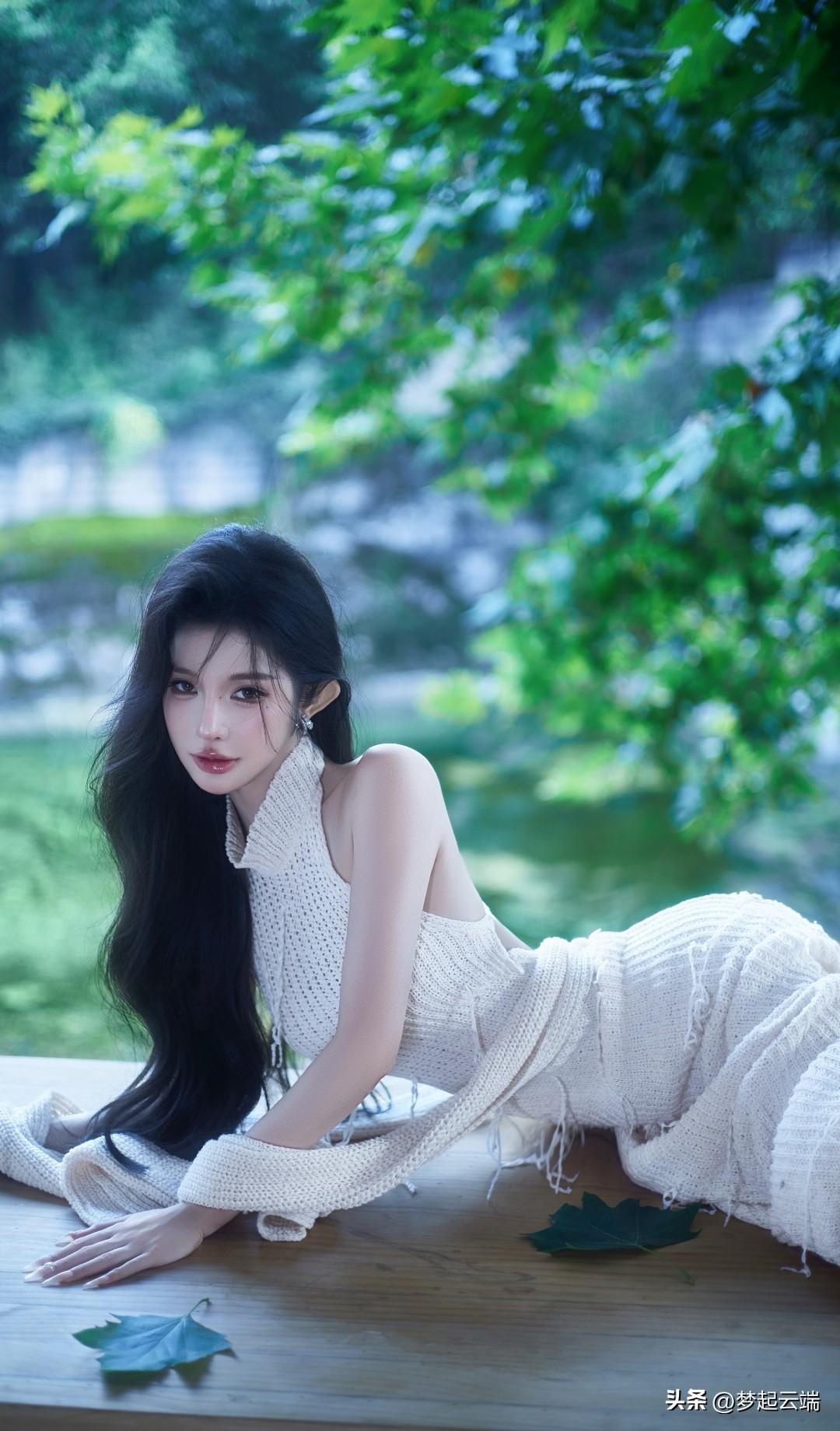 夏日清新,绿意盎然,优雅黑发,白裙飘逸,静享时光。