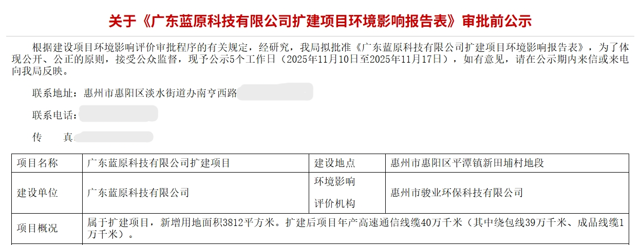 记者注意到,成立仅三年半的蓝原科技目前正在推进产能扩建。惠州市惠阳区人民政府11月10日发布的公告显示,蓝原科技近期正在持续推进扩建项目,本次扩建项目将新增用地面积3812平方米。扩建后项目将年产高速通信线缆40万千米,其中绕包线39万千米、成品线缆1万千米。