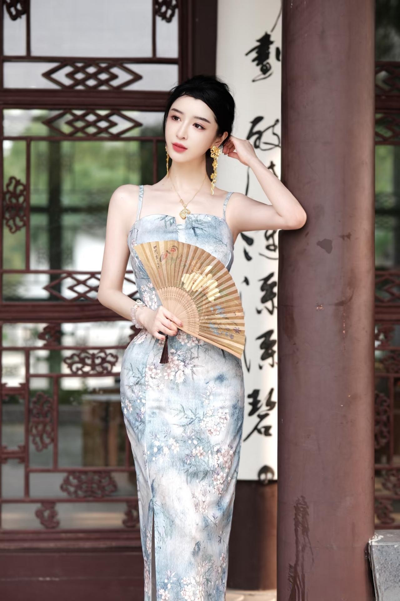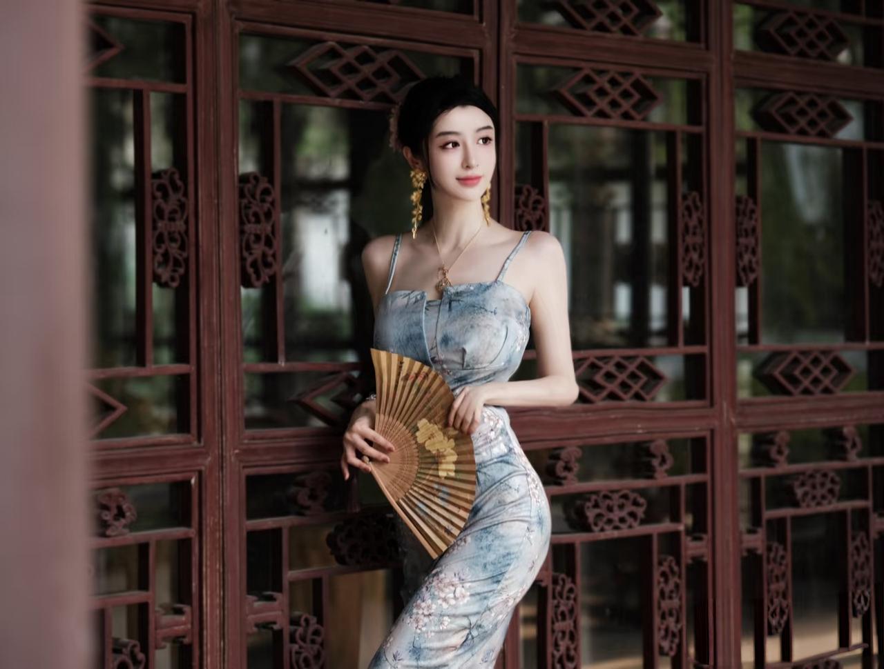 青砖黛瓦下,她着一袭蓝底印花旗袍立于庭院。立领盘扣间是东方骨相的端庄,高开叉裙摆