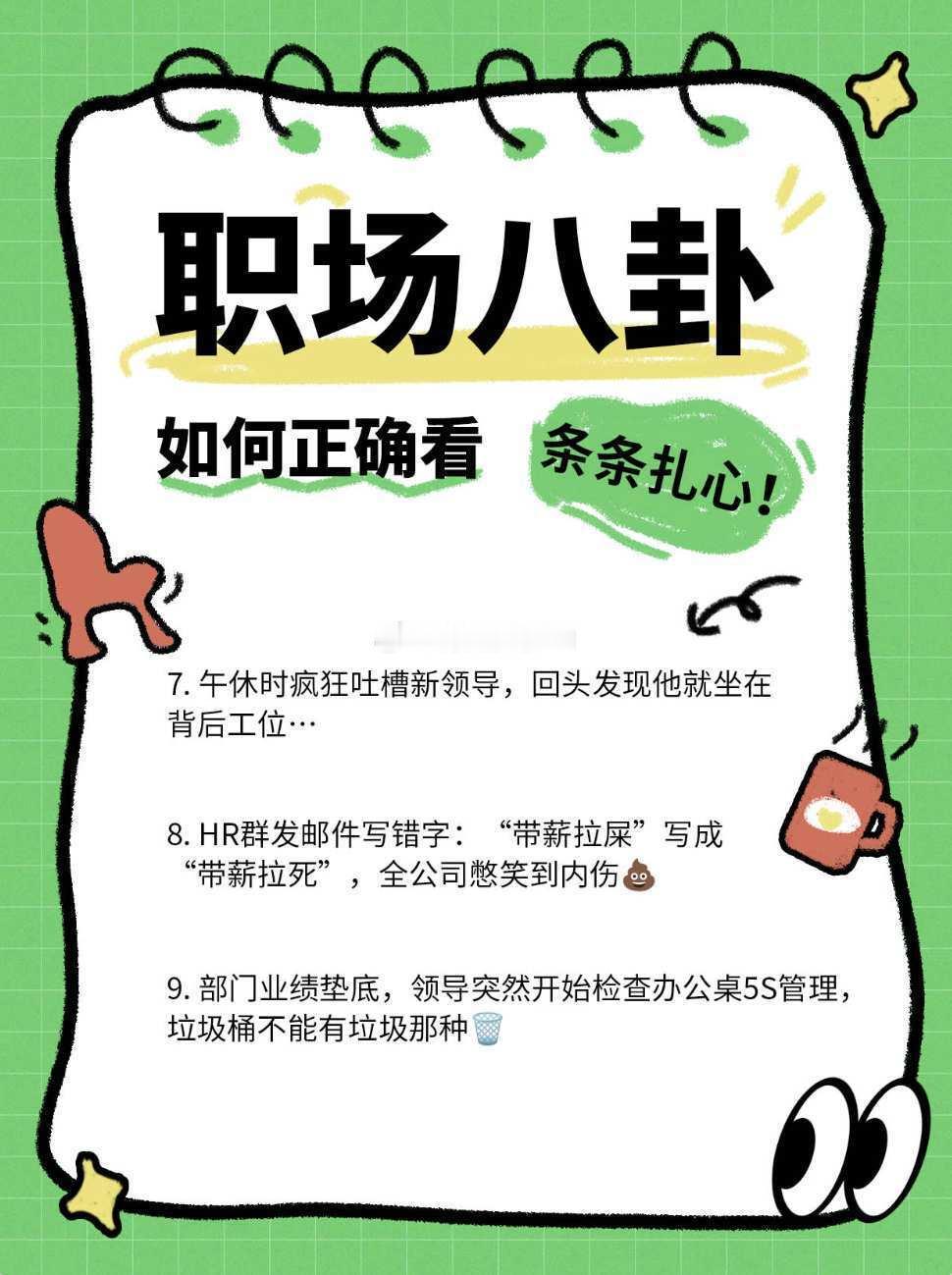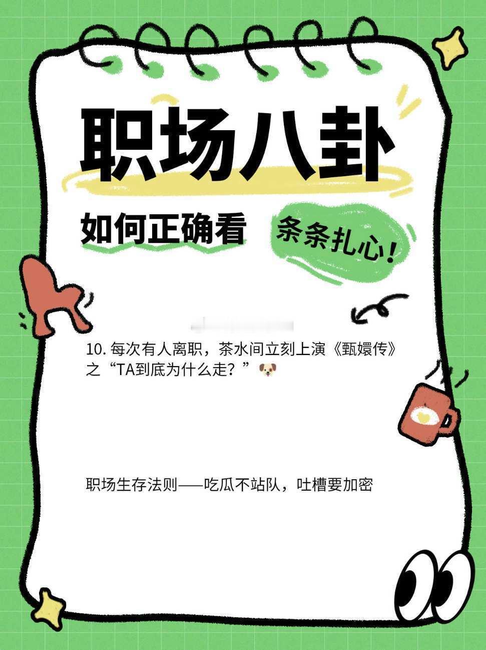 如何正确看待职场八卦!!10条职场八卦,条条扎心!1. 同事A和同事B表面和气,私下在群里互相吐槽,结果不小心发错群…大型社死现场🆘2. 老板说“不鼓励加班”,但下班后总在办公室晃悠,谁走最早谁就成“工作不饱和”典型💼3. 财务部小姐姐吐槽报销流程像闯关,结果第二天系统突然“优化”了…懂的都懂👛4. 实习生把老板的“PPT美化一下”理解成全网找模板,交稿后被要求重做20遍…5. 部门团建投票,90%选“放假一天”,最后变成“周末农家乐强制参加”🍗6. 两个同事用公司WiFi改名互骂,IT小哥默默截屏发全员…《关于吃瓜吃到自己头上这件事》🍉7. 午休时疯狂吐槽新领导,回头发现他就坐在背后工位…8. HR群发邮件写错字:“带薪拉屎”写成“带薪拉死”,全公司憋笑到内伤💩9. 部门业绩垫底,领导突然开始检查办公桌5S管理,垃圾桶不能有垃圾那种🗑️10. 每次有人离职,茶水间立刻上演《甄嬛传》之“TA到底为什么走?”🐶职场生存法则——吃瓜不站队,吐槽要加密