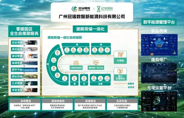 金冠股份旗下广州冠瑞数智推出的零碳园区源网荷储整体解决方案,深度融合公司在智慧电力、新能源数字化与集成服务的产业链优势,通过自主研发的零碳园区数字管理平台,提供覆盖规划咨询、清洁能源建设、智慧电网升级、负荷调控、碳资产运营的全生命周期服务,助力园区构建"绿色供能-高效用能-智慧储能"的可持续发展闭环。