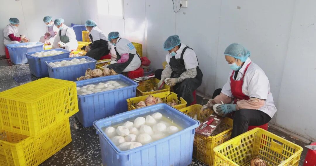 图为贺州市华彩现代农业有限公司的工人在对芋头进行初加工