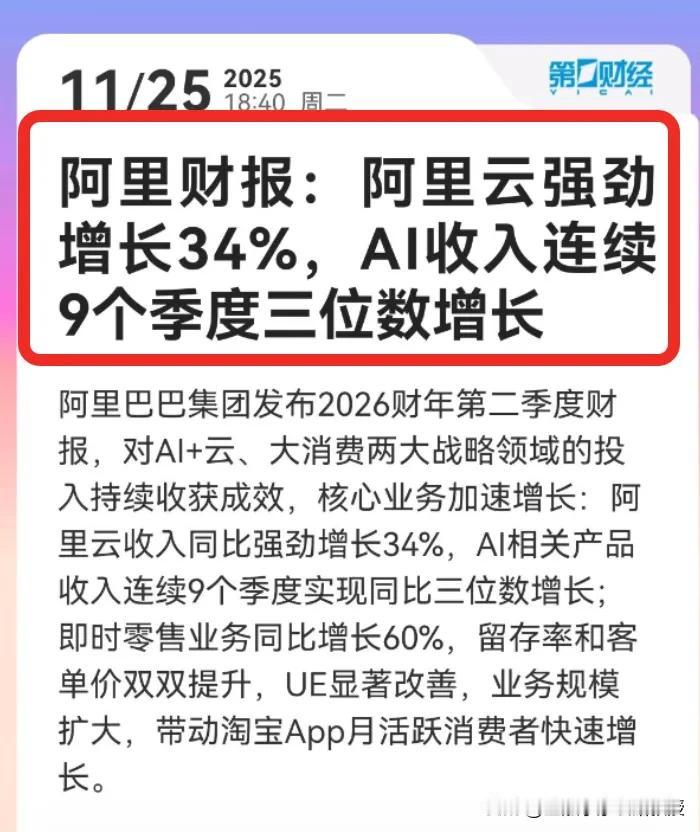 阿里财报发布,其中有一个细节,很多人估计还没发现! 刚刚看到一个消息,阿里发布了2026财年第二季度财报,财报显示阿里在AI+云、消费两大战略领域的投入持续收获成效,核心业务加速增长。 具体来看,阿里的AI能力持续升级,阿里云强劲增长34%,AI收入连续9个季度三位数增长;大消费平台协同效应显著,即时零售带动淘宝App月活跃消费者快速增长。 能在互联网行业红海中拼出这样的成绩,仔细想想,和阿里敢拼敢闯,今年打赢三场硬仗有着密切的关系。 这三场硬战分别是淘宝闪购、高德扫街榜、以及上周开始公测的AI to C 的应用——阿里千问APP。 逻辑很简单,这三场硬仗重塑了各自行业的生态,为行业发展注入了新的活力,更让普通人看到了新的机会。 就拿高德扫街榜来说,上线不到一个月用户规模就突破了4亿。大家为啥这么支持它?主要还是因为它是基于用户“行为+信用”,构建了一套真实的线下服务信用体系。 这个评价体系既能带给消费者真实有价值的参考,又能为优质的商家带来生意增长,消费者和商家都受益,形成正反馈之后,自然阿里的业务也会跟着增长了。 从时间线来看,阿里作为一家20多年的互联网公司,其实不算那么年轻了,但阿里从不缺乏大胆干,勇敢闯的勇气,也正是这种精气神,让阿里各大业务线的发展势头雄起! 也相信在这种趋势下,阿里的未来会越来越好,带给普通人的惊喜也会越来越多!