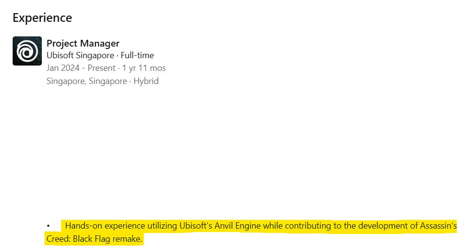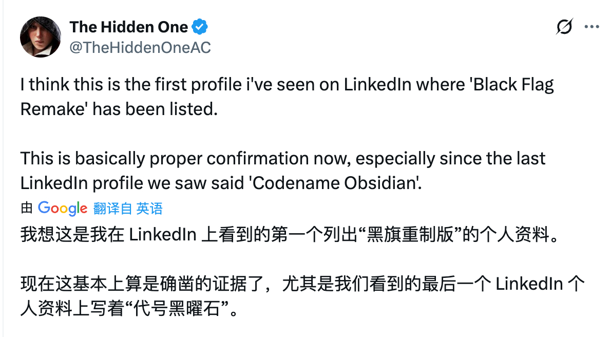 【育碧员工信息佐证《刺客信条4:黑旗》重制版开发中】据游戏推主The Hidden One消息,他发现《刺客信条4:黑旗》重制版出现在育碧新加坡一名员工的个人领英资料上。该推主称《黑旗》的重制基本上证据确凿,并且此前资料上写的是“代号Obsidian”。育碧在财报中表明有一款未公开的作品,外媒InsiderGaming称《刺客信条4:黑旗》重制版将于2026年3月23日,但一切有待官方公布。