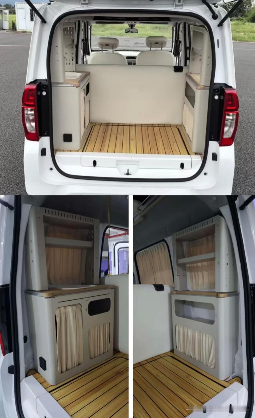 五菱之光EV露营车正式申报! 由vala公司与五菱合作,基于五菱之光ev改装而来,与现款五菱之光ev相比主要变化点如下: 1.新车尺寸为3685mm×1530mm×1900mm 比现款在高度上增加了150mm 原因是车顶设计斜升顶以及侧边天幕 2.斜升顶 后高前低的设计,增加了头部空间,保证人躺在里面不会感到压抑,上面一张床,下面还可以拼一张床 3.侧边天幕 设计在车顶右侧,大大增加了车外拓展性。 4.内饰 内饰颜色为白色,座椅升级为皮质座椅。 5.后舱 铺设了木地板,是可以向外拓展的。两侧设计了储物柜,其中一侧设计了水槽。