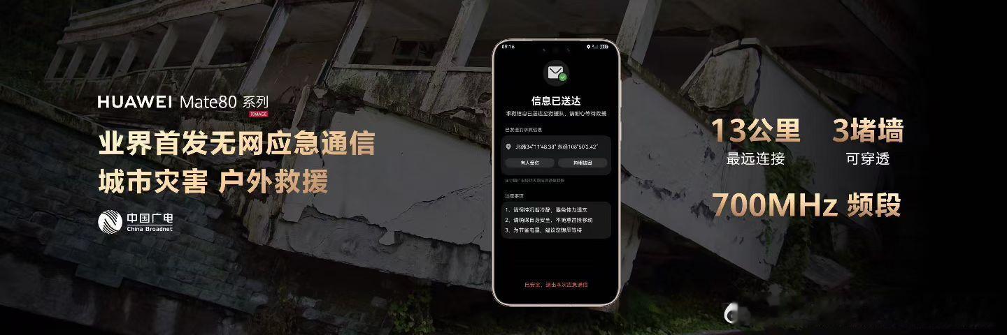 华为官宣 ,该功能为业界首发700MHz无网通信,在地震、洪水或是野外失联等断网险情下搭建生命通道,打通用户与救援队最后一公里的沟通链路。700MHz应急频段救援信号,可以穿透3层楼的深度,覆盖超过13公里的通信距离。