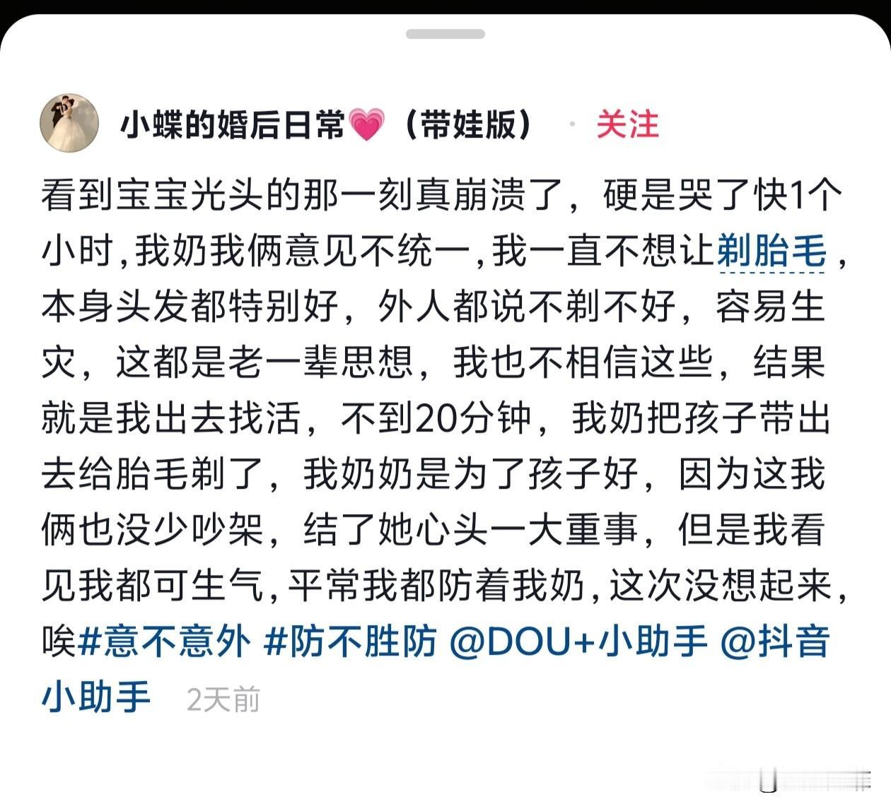 河南,妈妈出门不到20分钟,回家却发现宝宝的胎发被奶奶偷偷剃光了,宝宝只有50多天大,发质很好,妈妈崩溃大哭1个小时。 当天妈妈刚出门找活,奶奶就马上进屋把宝宝抱了出来,随后骑上三轮车带着宝宝到理发店剃了胎发,全程只用了9分钟。 剃完胎发回来,奶奶还高兴的和邻居分享了这个消息。 又过了十几分钟,妈妈回来了,一进门就看见宝宝头上光溜溜的,胎发全没了,她又委屈又无奈,哭了快一个小时。 妈妈和奶奶对这件事的意见一直不统一,奶奶认为孩子不剃胎发,会体弱,容易生病,剃了还能让头发长得更黑更密。 而妈妈觉得这是老一辈的思想,不科学,孩子头发本身就特别好,根本没必要剃。 后来妈妈也想通了,觉得奶奶是一片好心,是真的心疼宝宝,就原谅她了。 有网友认为,奶奶不尊重晚辈的育儿想法,偷偷做事确实不太妥当。 也有网友理解奶奶,觉得老一辈的观念很难改变,终归是一片爱子之心。 育儿这件事,家人之间要好好沟通,妈妈可以多给奶奶科普,奶奶也主动问问晚辈的想法,既照顾传统又兼顾科学。