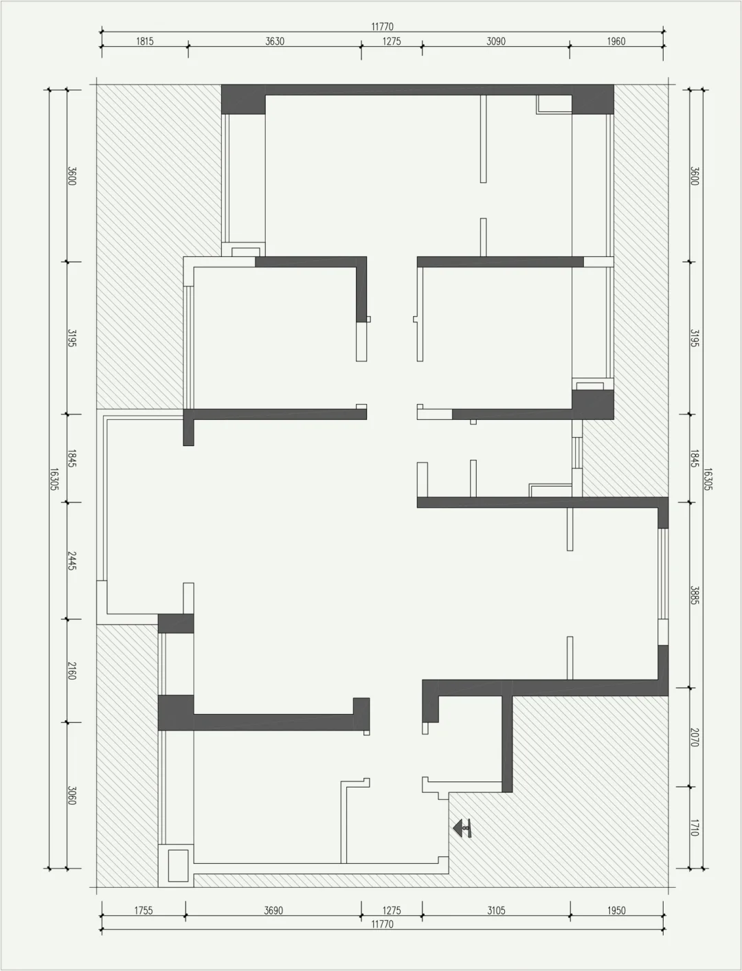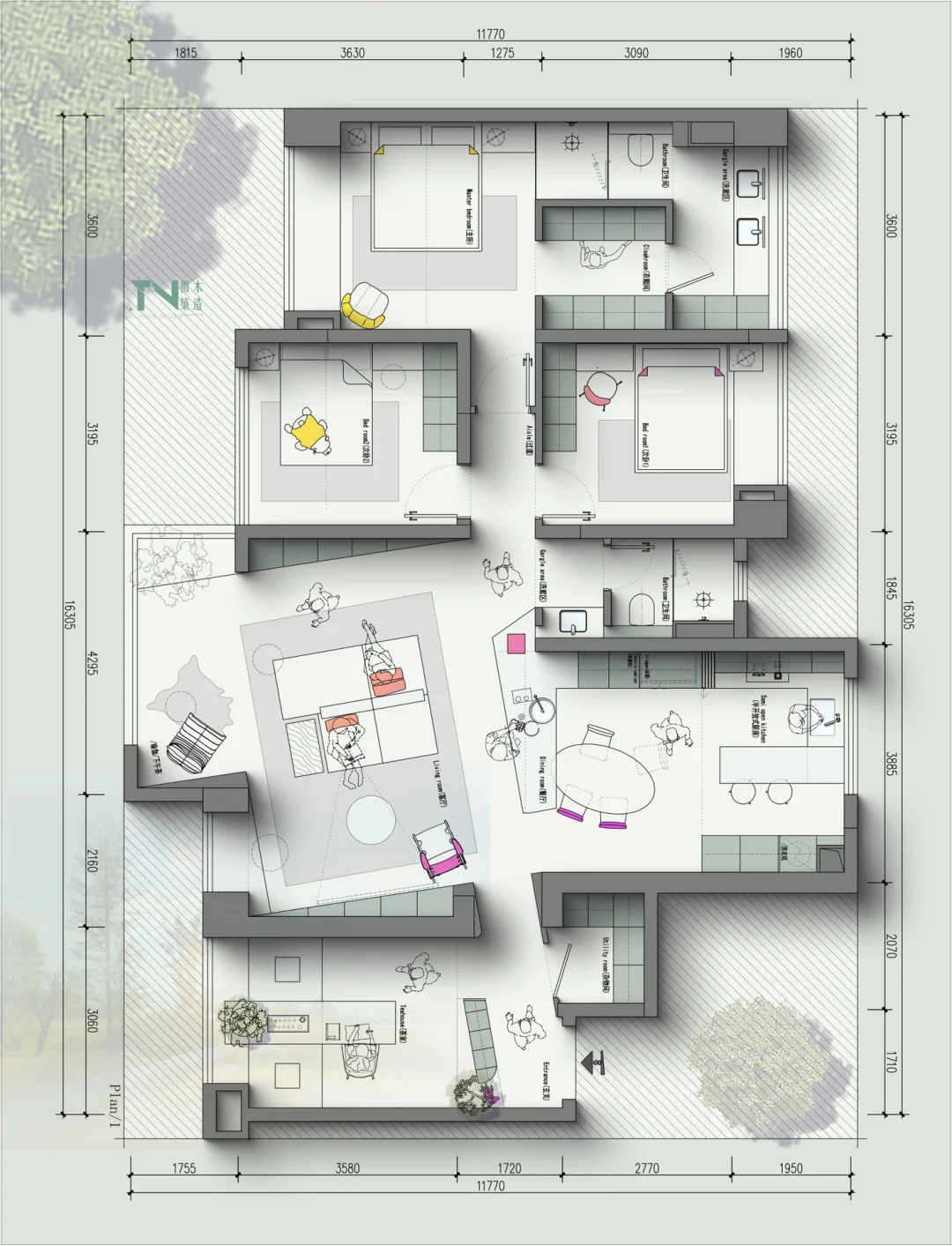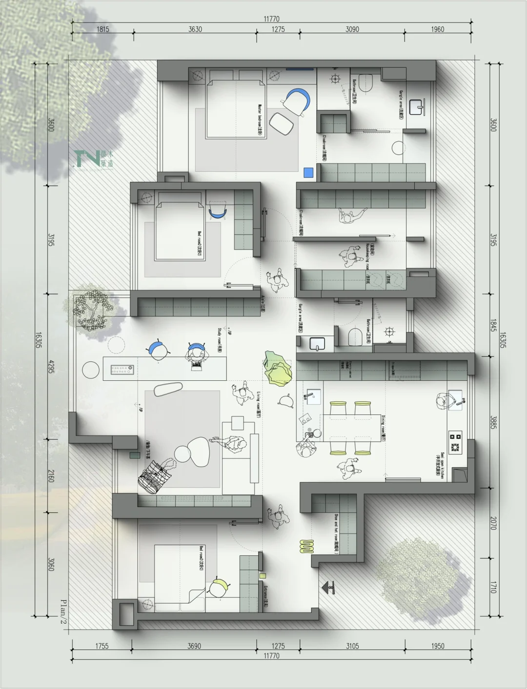 有多少小可爱不喜欢进门看到主卧门! 设计要求: 1、四口之家,需要三个卧室,不需要客房。 2、男主需要独立茶室兼并书房或开放式都可(有饭后一起喝茶聊天得空间), 3、家政区 4、两个小孩,男孩15岁,女孩9岁,小孩房都需要配备书桌。 5、家庭聚会在厨房需要大空间操作,想要半开放厨房尽量做到最大视野宽敞。 6、想有衣帽间尽量多点收纳储存,大阳台可以通铺77、希望可以看到跟邻居家不一样的设计。