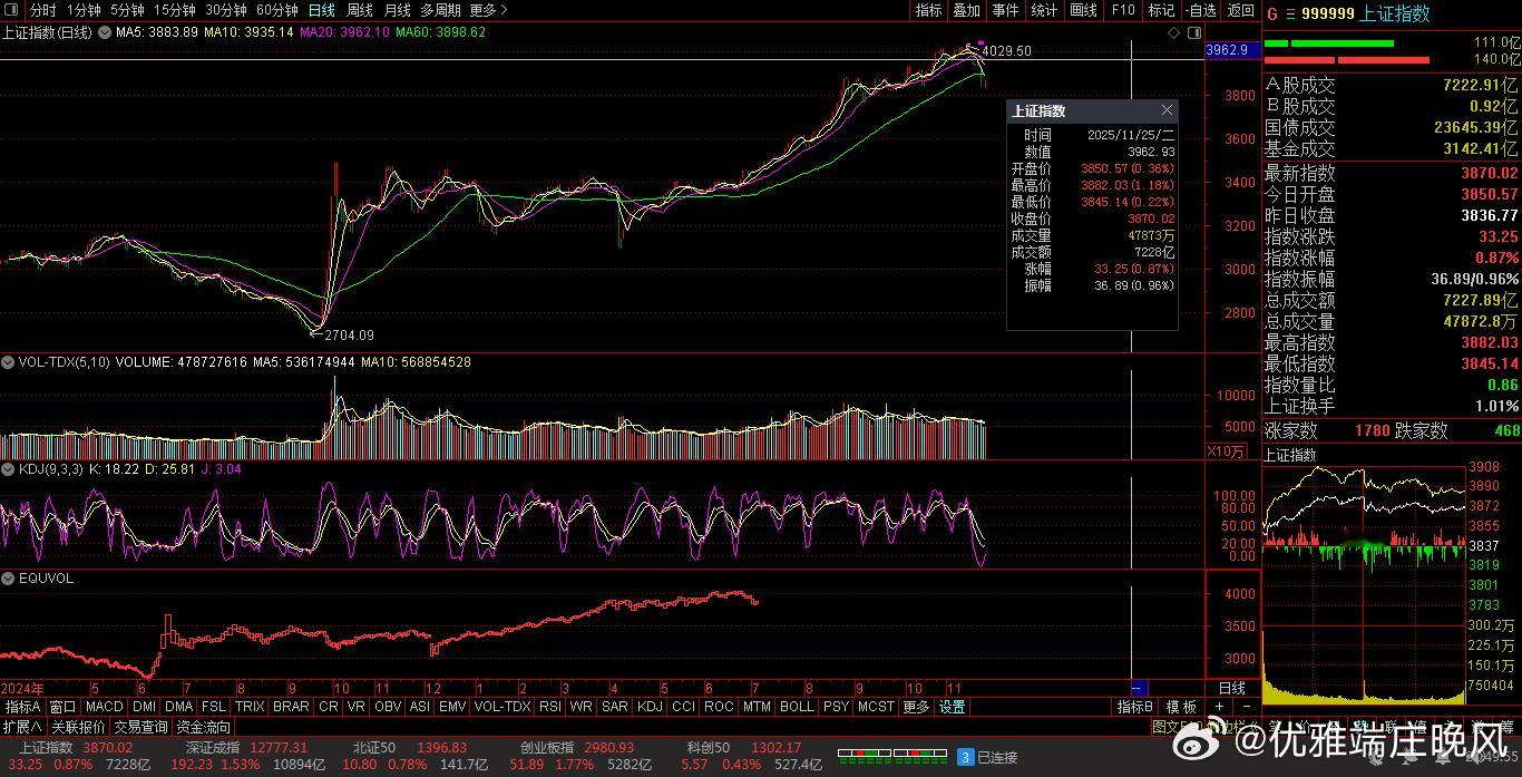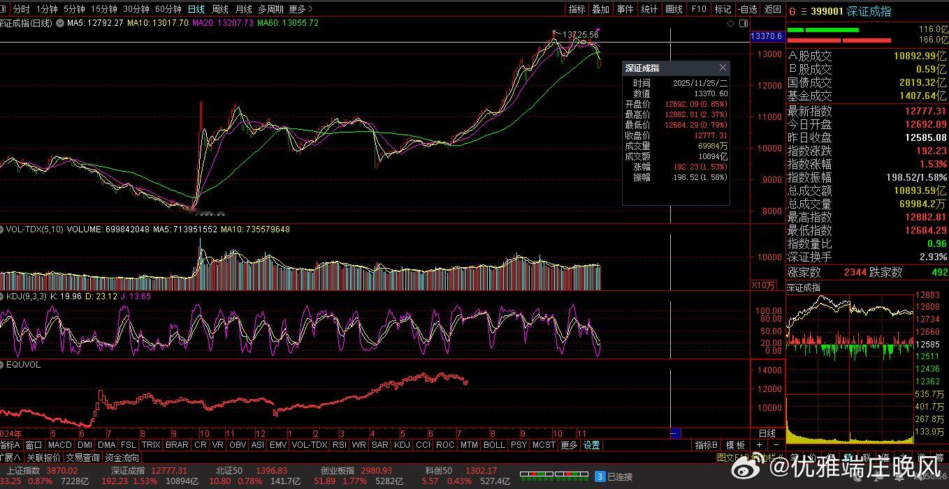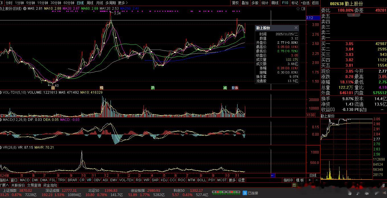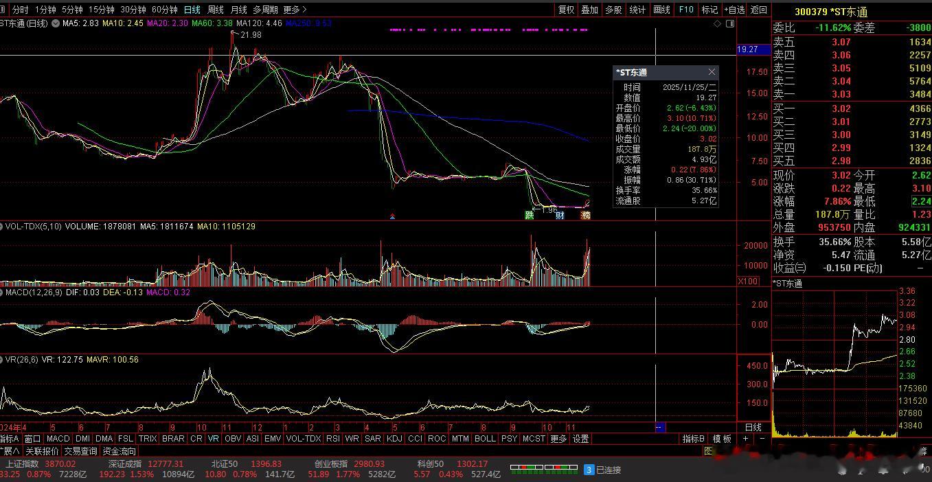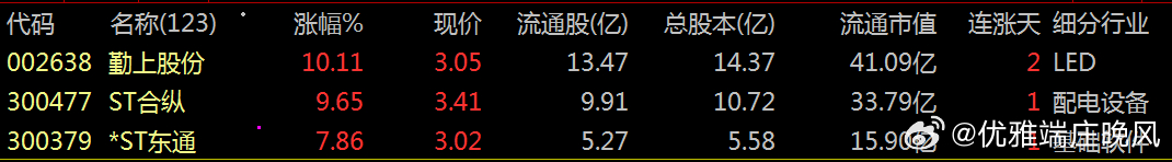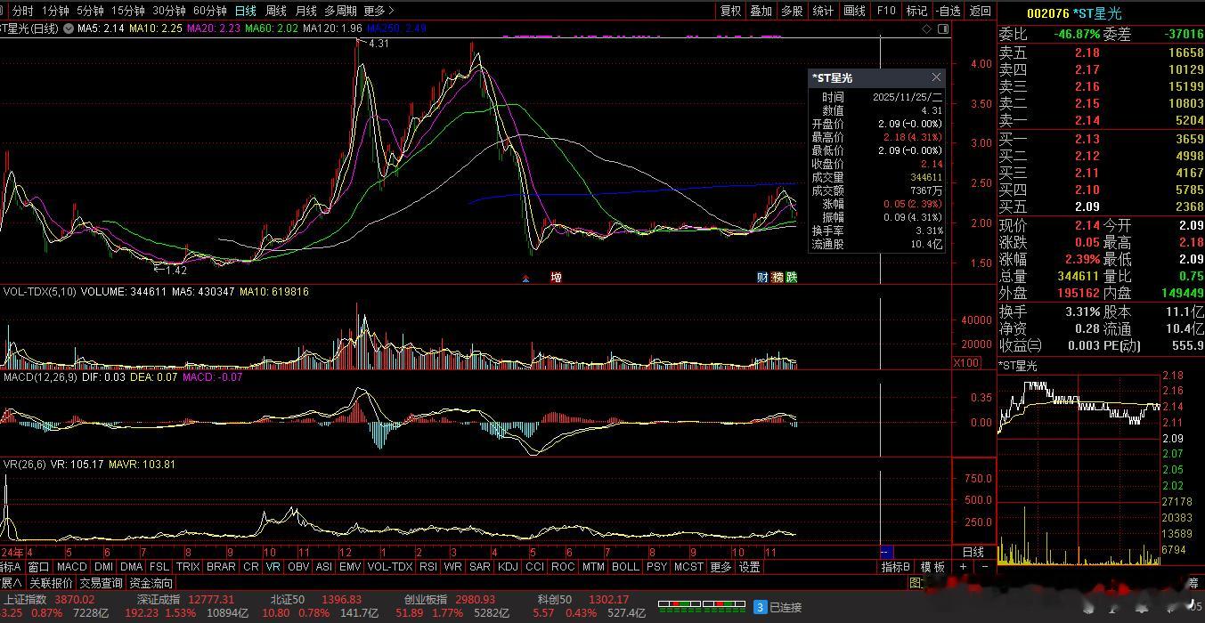 【财富晚茶】三元股市收评:沪指涨0.87%:通讯强势上扬航空探底导语:作者系《网易号》优质财经领域创作者。曾经原创作者和知名网易号旅游领域创作者。大跨度行业等的写作,颇受网友喜爱。作品发表于2025.11.25.15:18优雅端庄晚风。一、*ST星光:八年筑底002076 *ST星光 盘中02涨1、八年筑底:底部突破今日视野:前期双底:逐级抬高。2025-11-24 截止15:00:收盘股价:2.14元,上涨2.39%。成交总量:344611手。成交金额:7367万元。总换手率:3.31%。总市值达:21.76亿元,流通市值:21.76亿元。2、汽车照明:锂电设备主营业务:LED照明-紫外消杀-汽车照明-锂电池生产设备研产和销售。公司品牌:光科技应用-锂电池头部企业。3、营收良好:净利减亏业绩盈亏:2025-09-30 三季度报:公司营收:1.6865亿 同比增36.04%,实现净利润320.2526万 同比增256.29%。二、多空搏杀:沪深红盘1、追踪盘面:蛛丝马迹。沪深场景:早盘:高开三涨,一跌五涨。午盘:三跌三涨,二跌二涨。尾盘:一跌一涨,次高红盘。看点之一:沪深股指:股指高开:盘中强势,瞬间上扬。沪指强势:一度涨超1%。看点之二:市场黑马:创指超强:盘涨超3%。看点之三:沪深北市:合计成交:18264亿元。场内个股:4300股飘红。2、板块涨跌:风口依然涨跌观察:板块见证。板块拉升:通讯、有色、医药、半导体、化工、银行、保险等。板块回调:航空、航海、渔业等。概念活跃:CPO、PCB、消费电子等。3、技术看盘:涨跌位置观K线提示:精彩多空博弈。沪深两指预测:11月26日:沪指突破阻力:03882点看涨,前程似锦;跌破支撑位:03845点看跌,日暮途穷。深指突破阻力:12882点看涨,鹏程万里;跌破支撑位:12684点看跌,不堪造就。三、三元板块:风口潜水1、追踪盘面:视角视野三元强势,沪深打压。93股上涨,涨幅5%以上:9股涨停板。14股下跌,跌幅5%以上:3股跌停板。涨幅0%:0股16停板。涨幅0.00%+上涨个股:16+93=106股票赚钱。沪深两市:合计成交18264亿元。总体归纳:三元股票:盘口强势。2、追踪盘面:主力进退换位思考:沪深强势,尾盘兑现。沪指距9:31-15:00:前1小时放量盘升,中1小时略量盘升,后2小时略量盘跌。深指距9:31-15:00:前1小时放量盘升,中2小时略量盘跌,后1小时略量盘跌。沪深两市:合计成交:18264亿元。四、透析个股:聚焦涨跌1、涨幅榜眼:处排查摸主旋律:涨幅榜之中:寻找启动002638 勤上股份涨幅榜-1:002638 勤上股份主营业务:智慧户外景观户外庭院照明产品研产和销售。公司品牌:中国领先的半导体照明产品和综合解决方案供应商。涨幅榜-2:300477 ST合纵主营业务:配电变电控制设备-锂电池正极前驱体研造和销售。公司品牌:一流配电智慧能源领域系统解决方案服务商和先进锂电池材料前驱体供应商。涨幅榜-3:300379 *ST东通主营业务:基础软件中间件产品的研造和销售。公司品牌:中国中间件领导者大安全信息提供商。2、跌幅榜眼:处排查摸主旋律:跌幅榜之中:寻找金子002285 世联行 600467 好当家 600340 华夏幸福 跌幅榜-1:002285 世联行主营业务:房地产营销顾问代理机构。公司品牌:中国城市空间集成服务商。跌幅榜-2:600467 好当家主营业务:牙鲆鱼鲍鱼海参大菱鲆等海产品-面肉类蔬菜等冷冻食品销售。公司品牌:名优特水产生态化养殖头部企业。跌幅榜-3:600340 华夏幸福主营业务:产业新城-商业地产。公司品牌:中国产业新城服务商。3、潜力榜眼:处排查摸主旋律:潜力榜之中:寻找估值002496 *ST辉丰 300301 *ST长方 000669 ST金鸿潜力榜-1:002496 *ST辉丰主营业务:生物农资-农资电商-石化仓储供应链-项目投资。公司品牌:中国领先亚临界小分子高温裂解工艺高科技专利产品和头部企业。潜力榜-2:300301 *ST长方主营业务:LED照明光源器件。公司品牌:LED照明光源器件头部企业。潜力榜-3:000669 ST金鸿主营业务:天然气。公司品牌:国内最具实力的综合性清洁能源服务商。五、本创作者:优质网易投资投机迷茫之中:给予尽可能有帮助:资本市场风险自负。(优雅端庄晚风《网易号》优质财经领域创作者和原创作者; 违者必究)