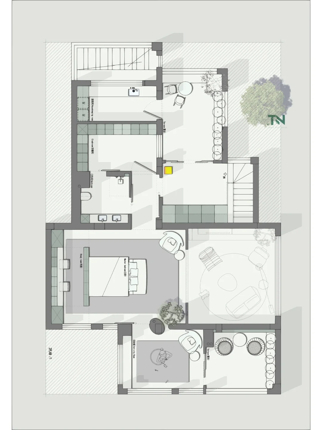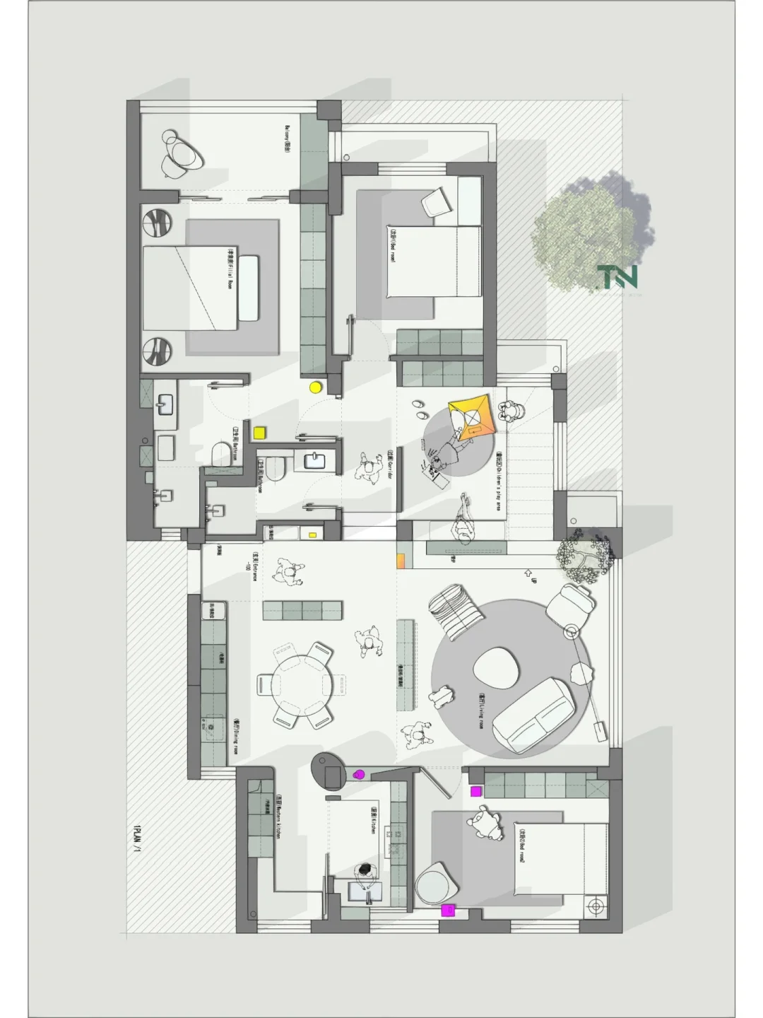 设计需求: 1、家庭成员:夫妻倆,一个长辈,妹妹,六岁女儿 2、 一层主要功能需求: 三个卧室、长辈房间、妹妹房间、女儿房间。 厨房中西厨、储物功能大的鞋柜、下沉式玄关 孩子玩耍区 3、 二层功能需求: 大衣帽间、书房、瑜伽绘面区、主卫需要两个台 盆、最好能有浴缸🛁!