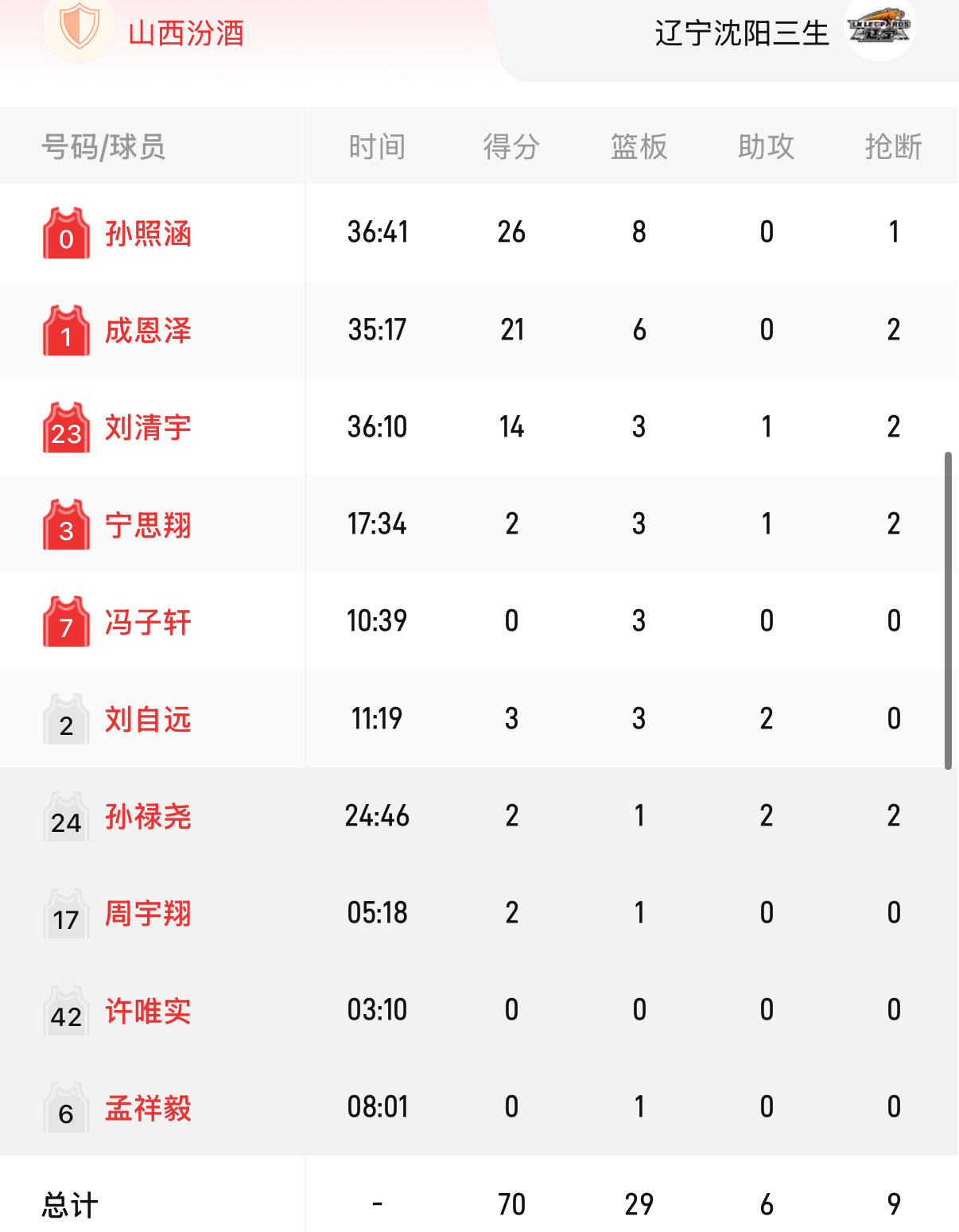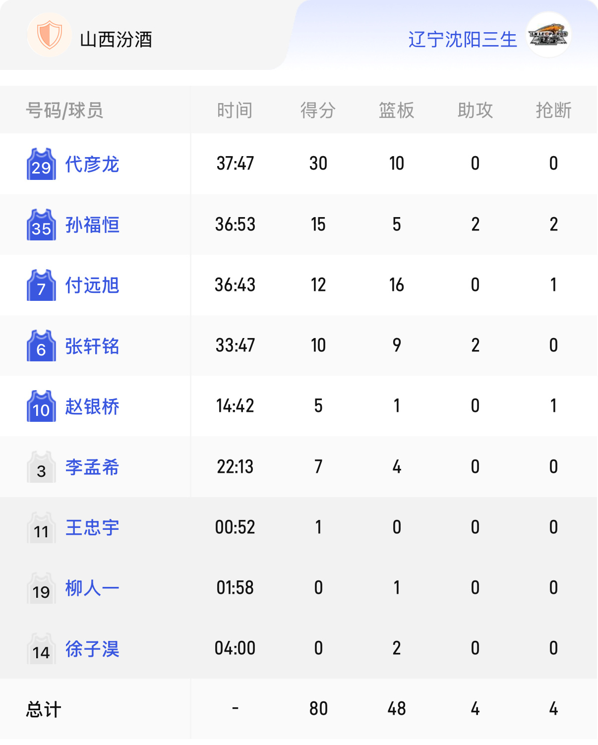 代彦龙解禁复出,轰下30分10篮板,辽宁U19男篮83-77战胜山西U19男篮。孙福恒15分5篮板,付远旭12分16篮板,张轩铭10分9篮板。