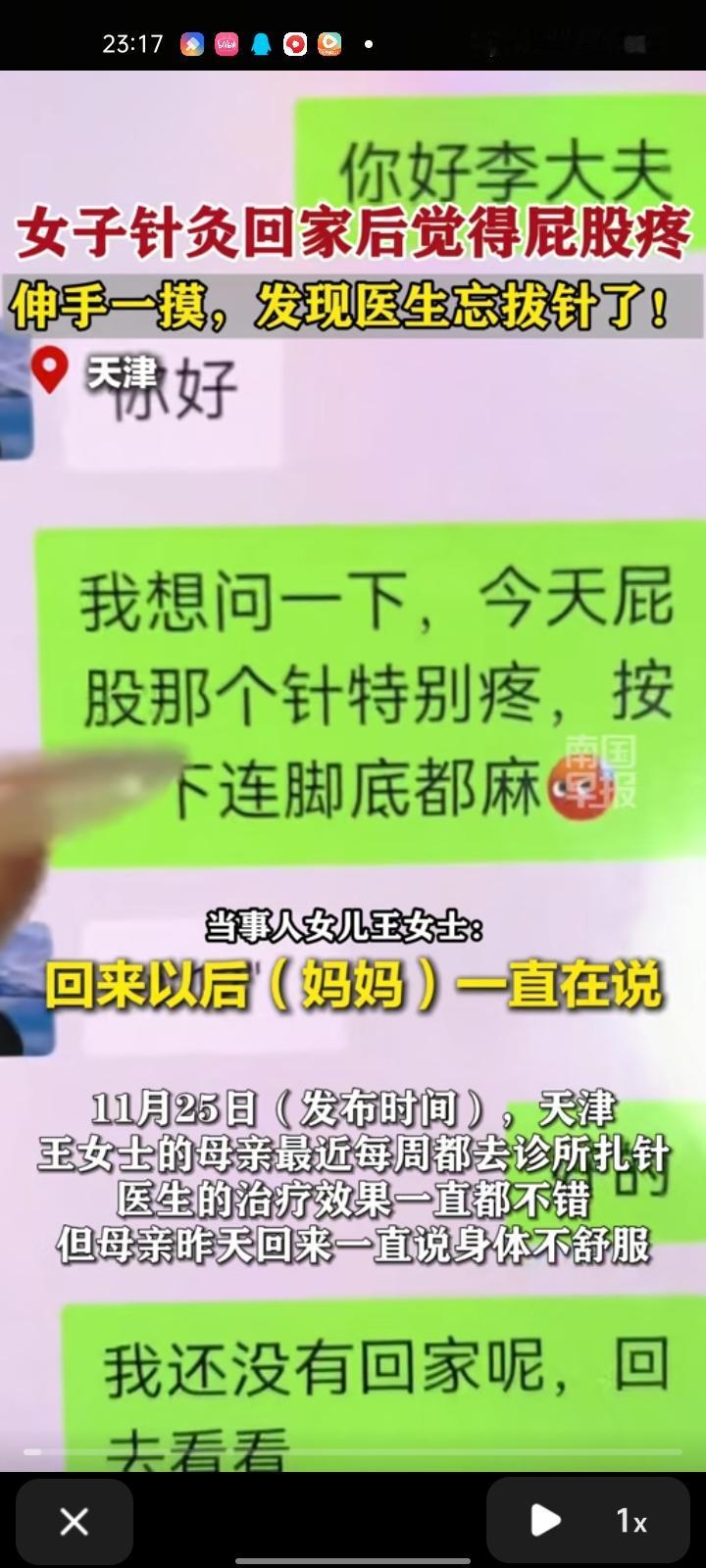 11月24日,天津。王女士的母亲最近每周都去诊所扎针,医生的治疗效果一直都不错,但母亲昨天回来一直说身体不舒服。医生回应称,应该是起针起太快了,摸摸是不是有硬疙瘩。王女士伸手一摸,还真有这么长的针,医生当即表示歉意。 事后,王女士的母亲敷了一下患处,身体无大碍。提醒大家,针灸后要注意检查