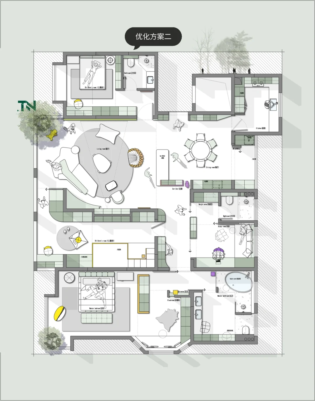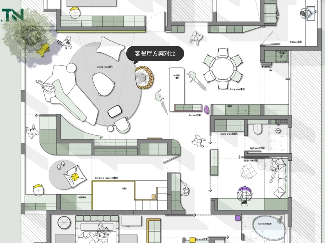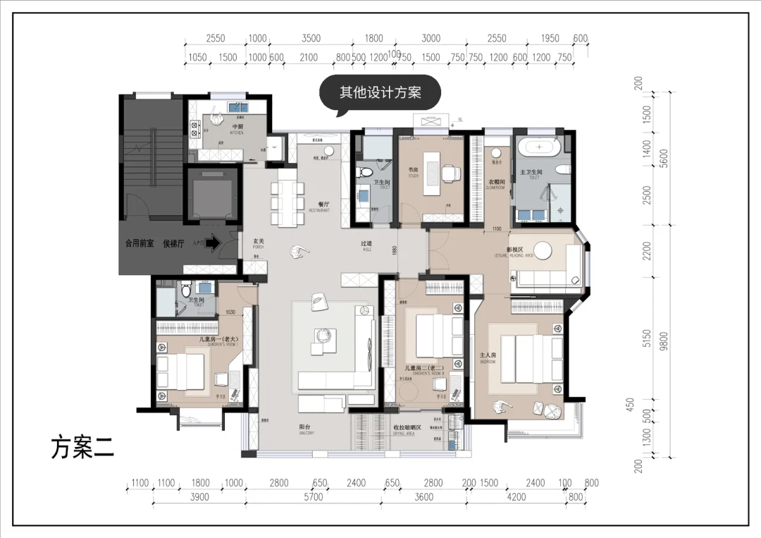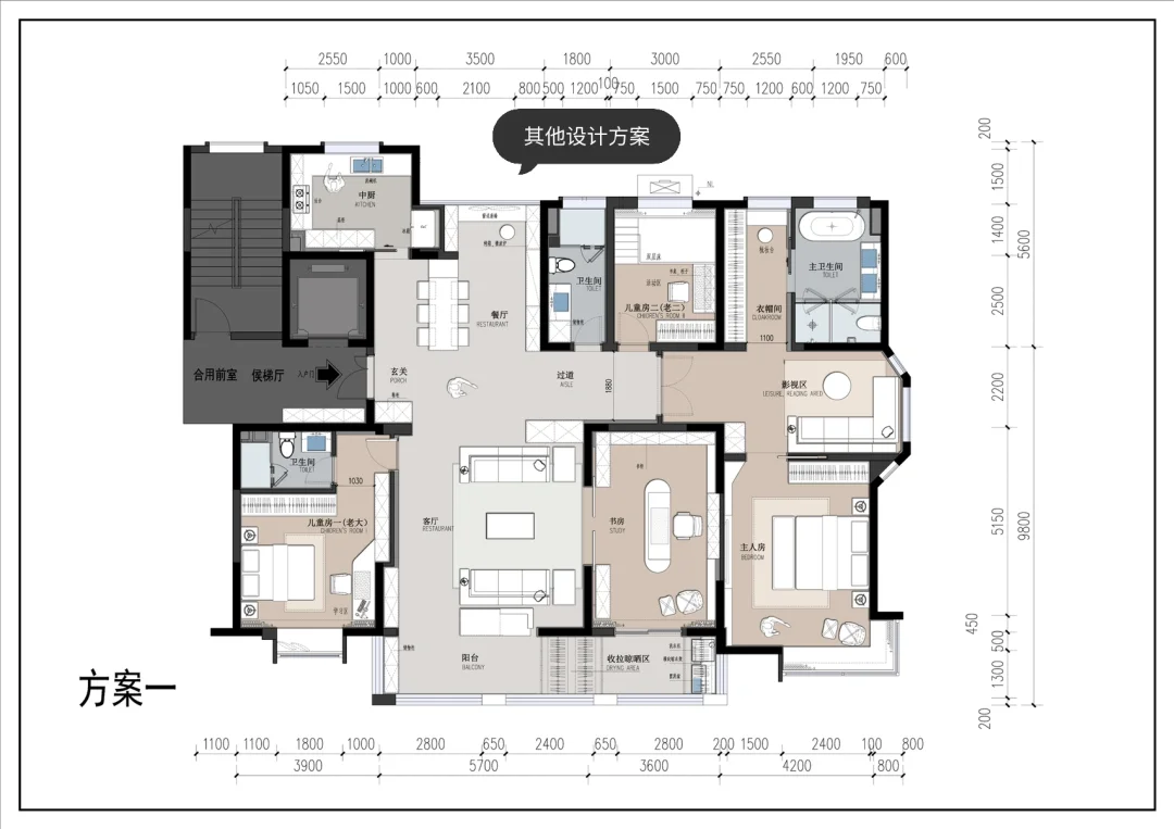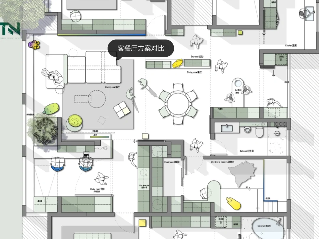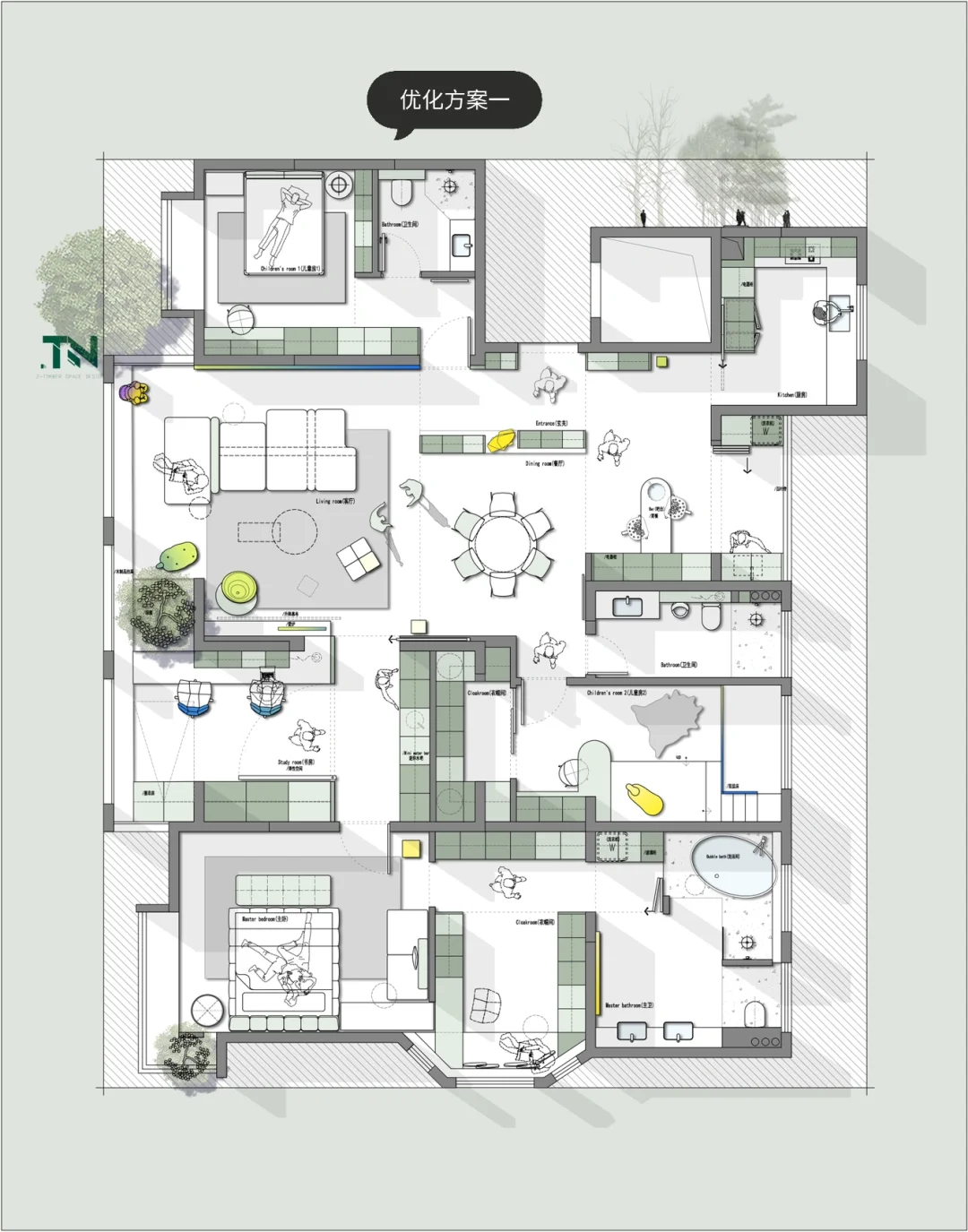 3、大儿子房间初步安排在入户门右首,需要尽可能大的书柜和一个写字台、衣柜。小儿子房间初步打算在南向阳台房,需要双层床。厨房考虑冰箱进里面。书房初步考虑北次卧,敞开式。主卧需要浴缸,储物,但尽可能显大(主卧飘窗理论上可砸)。走廊双开门尽可能保留。客厅尽可能把阳台融进开,沙发摆放可以不常规。室内尽可能透光。
