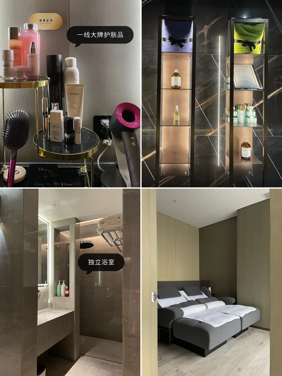 晚上8点泡个汤、蒸个桑拿(这时人不多,有种包场的感觉),独立浴室好评,私密性很好,泡完澡再化个美美的妆容,全是国际一线大牌的洗护用品:法儿曼、欧舒丹、卡诗、兰蔻、香奈儿、迪奥、茱莉蔻等,以及戴森吹风机,随便用!