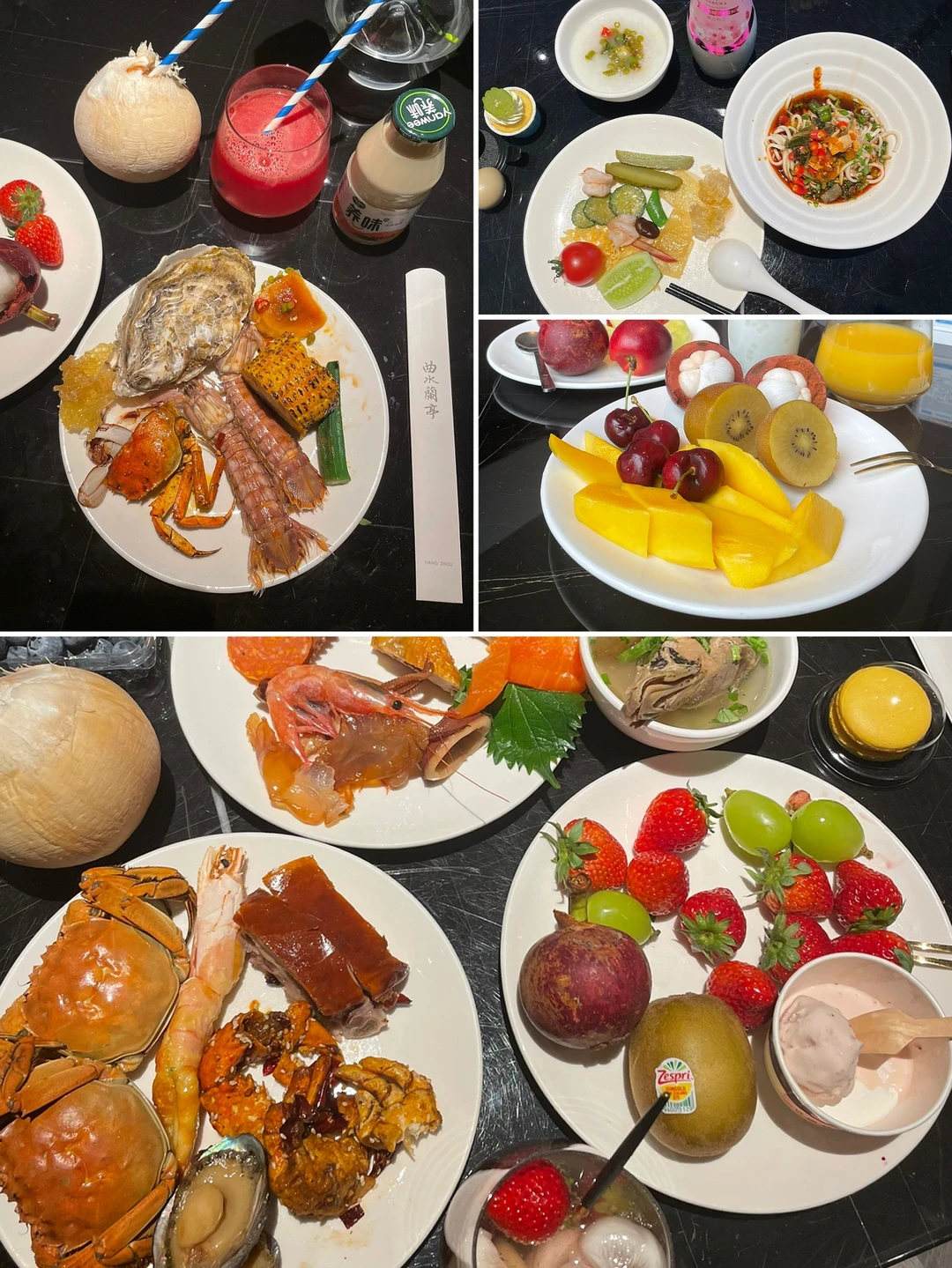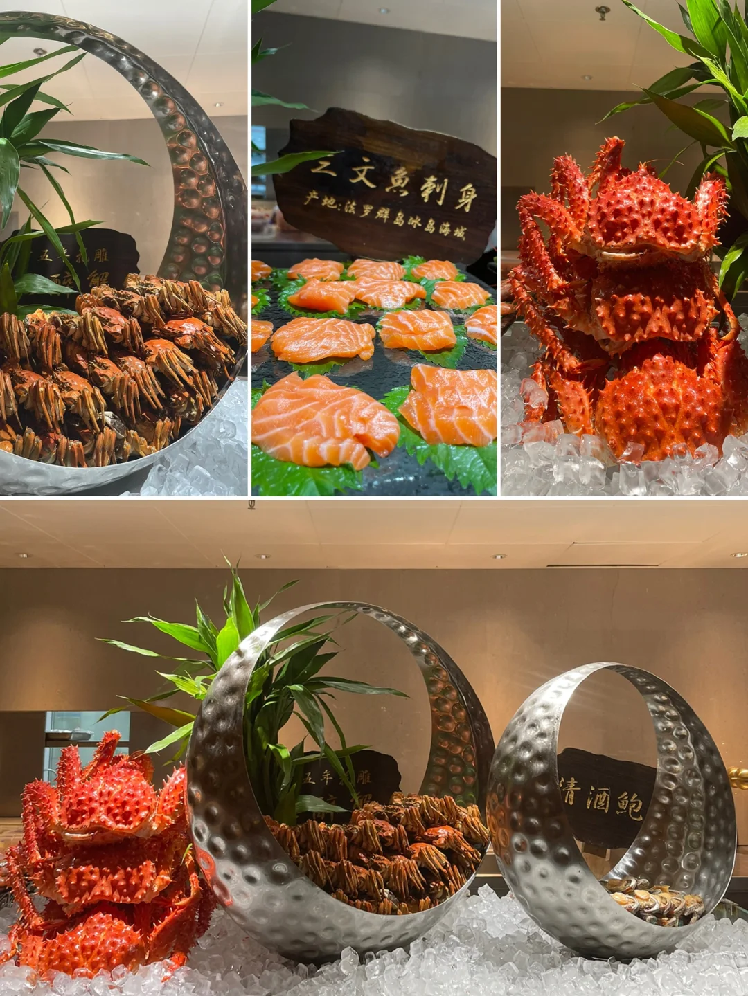 10:00-3:00宵夜时间:三文鱼🍣、帝王蟹、大闸蟹、超大皮皮虾……各种不限量美食!随便吃!超喜欢那个香辣蟹和鲍鱼,太美味了!服务员见不得桌上有垃圾,不一会儿就来帮收掉,非常贴心。