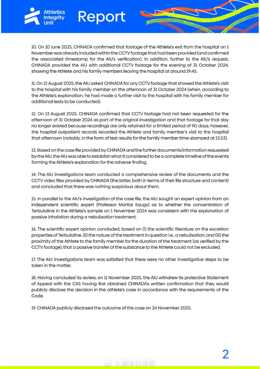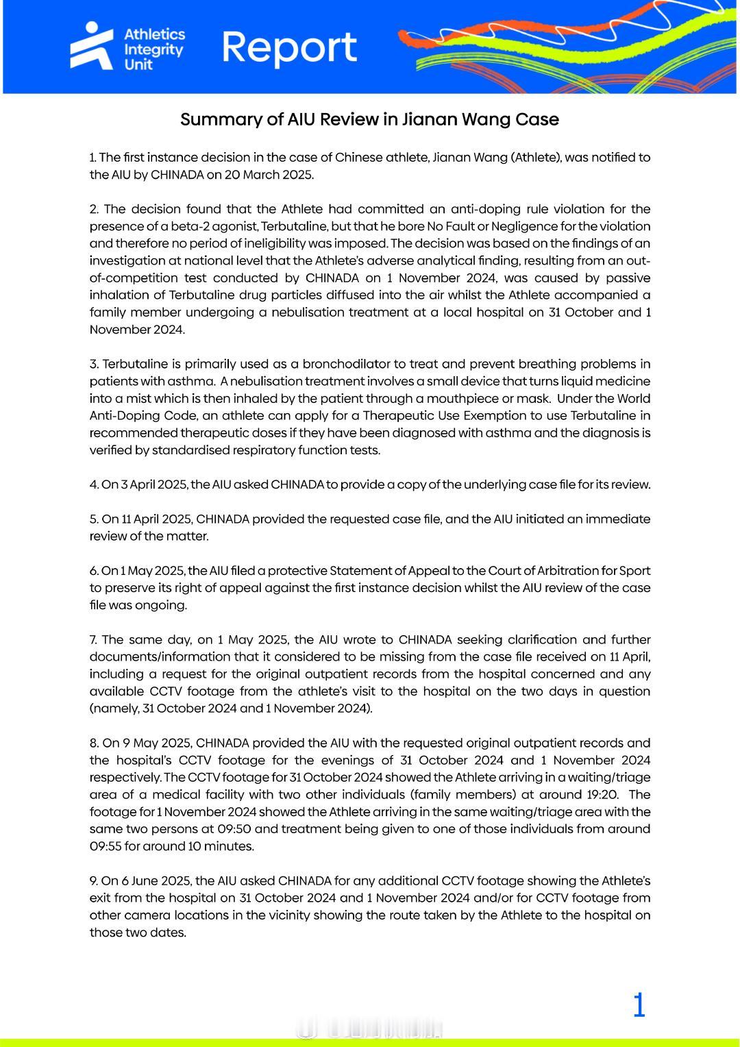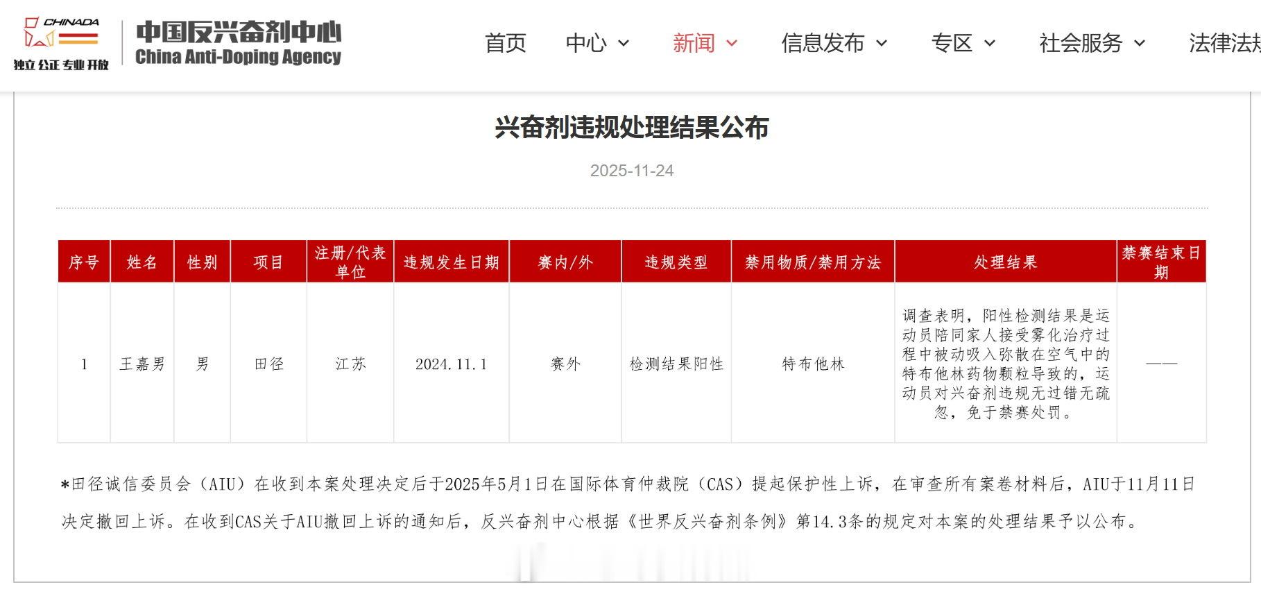 世界田径诚信委员会 AIU 宣布认可中国反兴奋剂组织 CHINADA 的决定,不对赛外药检中体内查出 beta-2 agonist, Terbutaline(β2受体激动剂特布他林)的运动员王嘉男进行处罚。该案件CHINADA于2025年3月20日通知AIU。CHINADA的赛外药检发生于2024年11月1日,自诉2024年10月31日和11月1日陪同家人在当地医院接受雾化治疗期间,被动吸入了扩散到空气中的特布他林药物颗粒所致。2025年4月3日始,AIU要求CHINADA提供相关案件档案副本及相关证据调查核实,并经过独立科学家 Professor Martial Saugy 对相关科学数据的验证。2025年11月11日,AIU完成审查后,撤回了其向国际体育仲裁法庭 CAS 提交的保护性上诉声明。2025年11月24日,CHINADA根据承诺公开披露了该案的结果。王嘉男目前在世界田联登记的最后一场比赛是今年2月1日全国田径室内大奖赛成都站,他无成绩。王嘉男是2022俄勒冈世锦赛跳远冠军 PB是8.47米的平国家纪录。