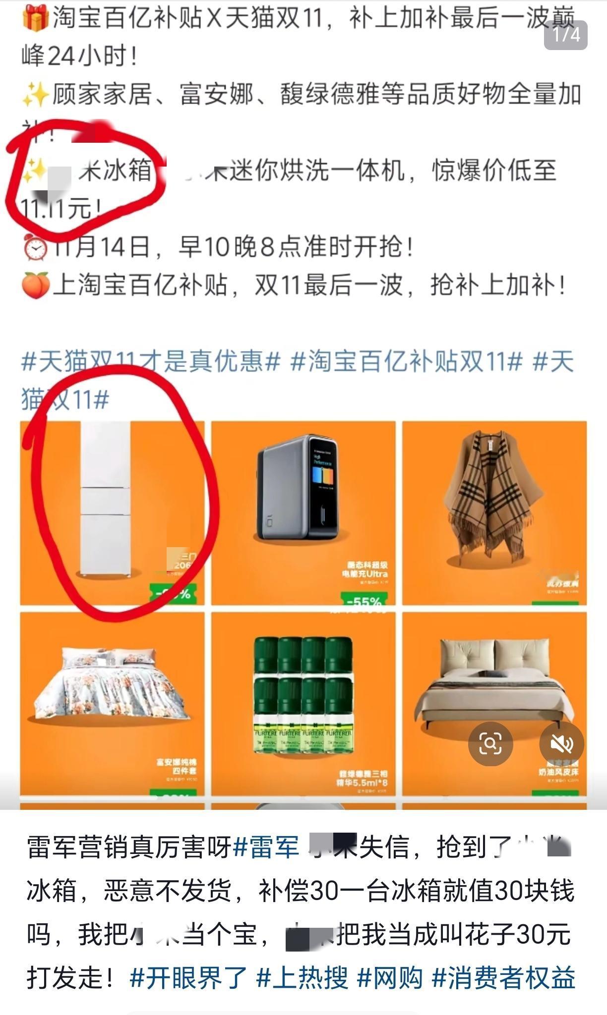 11.11元抢到某品牌冰箱的这哥们还在平台维权,订单一直未发货,客服联系说补他30元补偿款,这哥们就觉得品牌方做不起活动,如果活动不是真实有效可以承认,但人品牌就是一口咬定“活动真实有效”,但就是系统问题,发不出货,只能抱歉了! 听他视频里的描述,他说“当时该品牌是做了3天这样的活动,9号,自己没抢到,11号,自己没有去抢,14号是最后一天活动日,当晚8点准时去抢,没想到抢到了”,可开心了! 可第二天官方就给他发了短信“由于系统问题,发不了货”,自己也积极的联系了他们客服,除了给出30元补偿款,没有其他更好的处理方案给他这位大哥。 这位大哥现在的疑问就是,如果他想要得到这台冰箱的话,他应该通过什么途径去得到,能不能维权成功?希望大家能给他一些建议。 刷到这个视频,我第一反应是这个大个公司不至于做不起活动啊,毕竟雷布斯当年说的“这个免费送,那个免费送”,几百块钱的冰箱都不发货给人家,实在想不明白,而且这种大公司一般注重名誉权,肯定会发货的,反正我是这样想的哈,至少我刷到过有网友抢到美的冰箱,人家品牌方就送货了! 网友说“自己刚才在该品牌官方冰箱直播间,问她们冰箱问题她们怎么解决的,结果秒被拉黑,这格局也只有这个品牌了”! 其实要真是系统问题就不可能会搞三次活动,对吧? 很多哥们在评论区说“必须硬刚到底,这个品牌太欺负人了,争的就是一口气”,我倒希望这哥们能维权成功了,毕竟事儿都过去那么多天了,至少要给人一个满意的答复,而不是一直这么拖着,给人道个歉也不是不可以对吧! 我个人的小建议哈,要是真维权不成功,也没必要一直耗下去,消耗自己,感觉每天心里都搁着事,扛不住了就直接开直播,一台冰箱的钱很快就回来了,你们觉得呢?