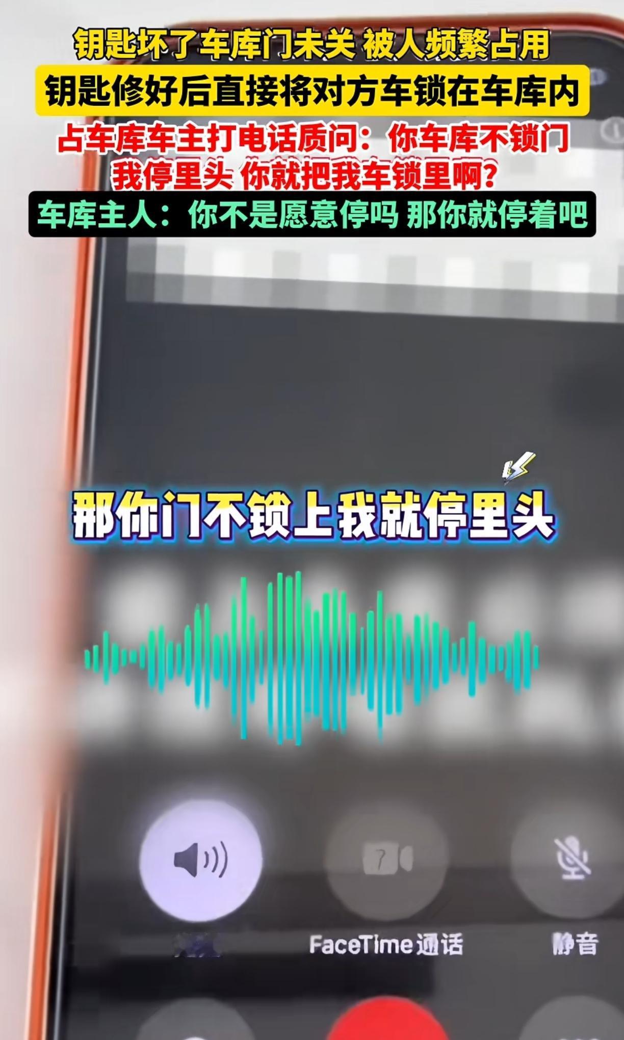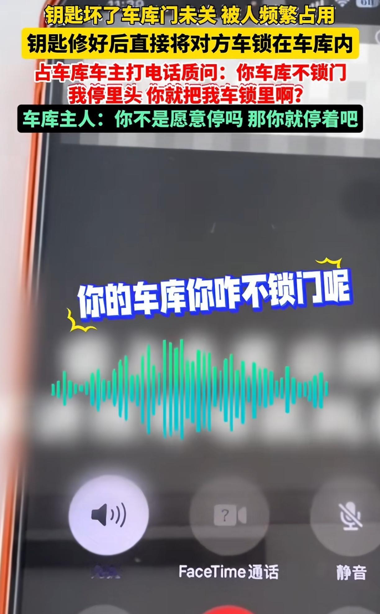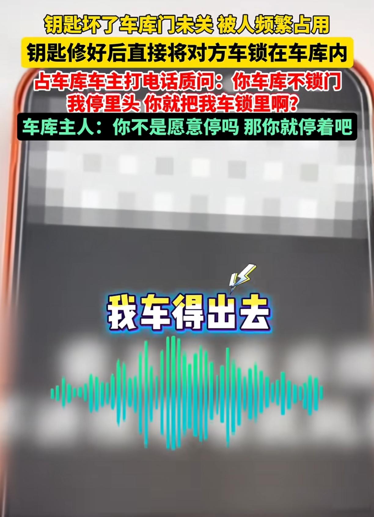 私家车库屡次被占用,车库主人称车库钥匙坏了没锁门,人家就顺理成章的停进车了,搞得自己都没得位置,这不忍不了,决定治治车主的这臭毛病,没想到人占车位的车主脾气比车库主人还大! 听听这说的啥话“我有急事,我车得出去,那你的位置你怎么门不锁上呢,你不锁我就停里头,是你的车库你咋不锁门呢”? 这话说的态度真不像求人去开门,好像人必须给他开门一样,听着口音,反正把车停人车库里头一切都是那么的合理,还好最后这车库主人也不惯着他,“我出差了,等我回来再开,你就等着吧”! 说实话,这要是我的车,我怂了,说说软话,道个歉,送上香烟好酒,给人包个红包就当交停车费了,人家肯定不会为难你的。 按这车主现在这说话态度,这大哥没关他个10天半个月都不合理了!