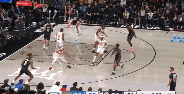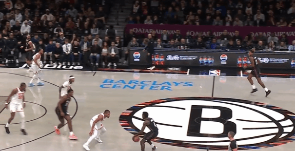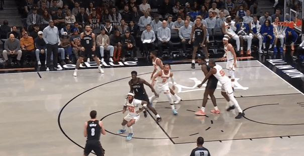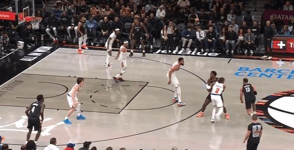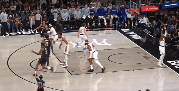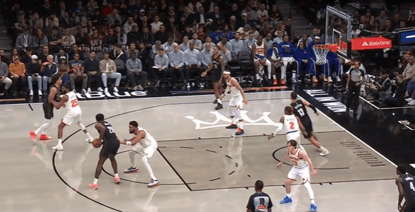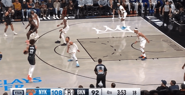 诺阿-克劳尼在今天对阵尼克斯的比赛中打出了自己的生涯之夜,爆砍31分4板3助。作为三年级首轮秀,克劳尼终于在本赛季坐稳了球队轮换,并从G7的比赛开始进入首发阵容,与波特、赵四二位核心一起搭档首发前场。篮网对克劳尼的定位是将其大量固定在大前锋的位置,走无球空间型内线路线。克劳尼也会大量出手三分,但矛盾的点在于三分命中率完全无法得到保证,这也是克劳尼效率一直比较糟糕的重要原因。所以本场比赛克劳尼之所以能够砍下31分,很大的原因自然是因为三分线外火热的手感——登场39分钟,疯狂出手13记三分,命中7颗。比如图1这个回合,转换进攻沉至底角抓尼克斯防守沟通失误获得空位出手机会。图2鲍威尔与夏普早期进攻阶段的边路挡拆配合,吸引克拉克森回收封堵中路空间,克劳尼“拖车跟进”(Trailer)至弱侧45°接应。图3马丁和夏普的高位挡拆, 威尔逊沿底线向弱侧空切优化空间,克劳尼强侧接应三分命中。图4底线球回合, 克劳尼先是无球上提佯装为威尔逊设置无球掩护做第一道佯攻,随后二人同时迅速转身反跑,威尔逊的反跑空切成功吸引亚布塞莱防守注意力,克劳尼空手移动借助夏普无球掩护兜至45°接球,抓前来补救的唐斯换防的间隙出手三分。图5弱侧底角接传导球回应空位,惩罚尼克斯的轮转。图6篮网会给克劳尼设置的一个小战术配合:接外线队友的手递手后抓防守间隙立即出手三分。图7接鲍威尔手递手瞄篮后转身启动右路突破,躲过布伦森刷卡后合球双脚起跳,挑篮打进。图8借助马丁“Flex Screen”成功要到小麦错位,内线背身要球和夏普的高低位配合,小麦体型本就吃亏的情况下为了防接球还失去了防守重心,克劳尼顺势向右侧转身衔接勾手终结。图9和夏普发起边路挡拆,与此同时强侧的鲍威尔、威尔逊沿底线、三分线进行空手移动。克劳尼吸引唐斯上提后弱侧底角的科莱克回收垫防顺下的夏普,上提的威尔逊带走弱侧一防二的大乔,克劳尼立即找到底角出机会的鲍威尔,为其创造了一次攻击Close out的机会。 nba午时已到