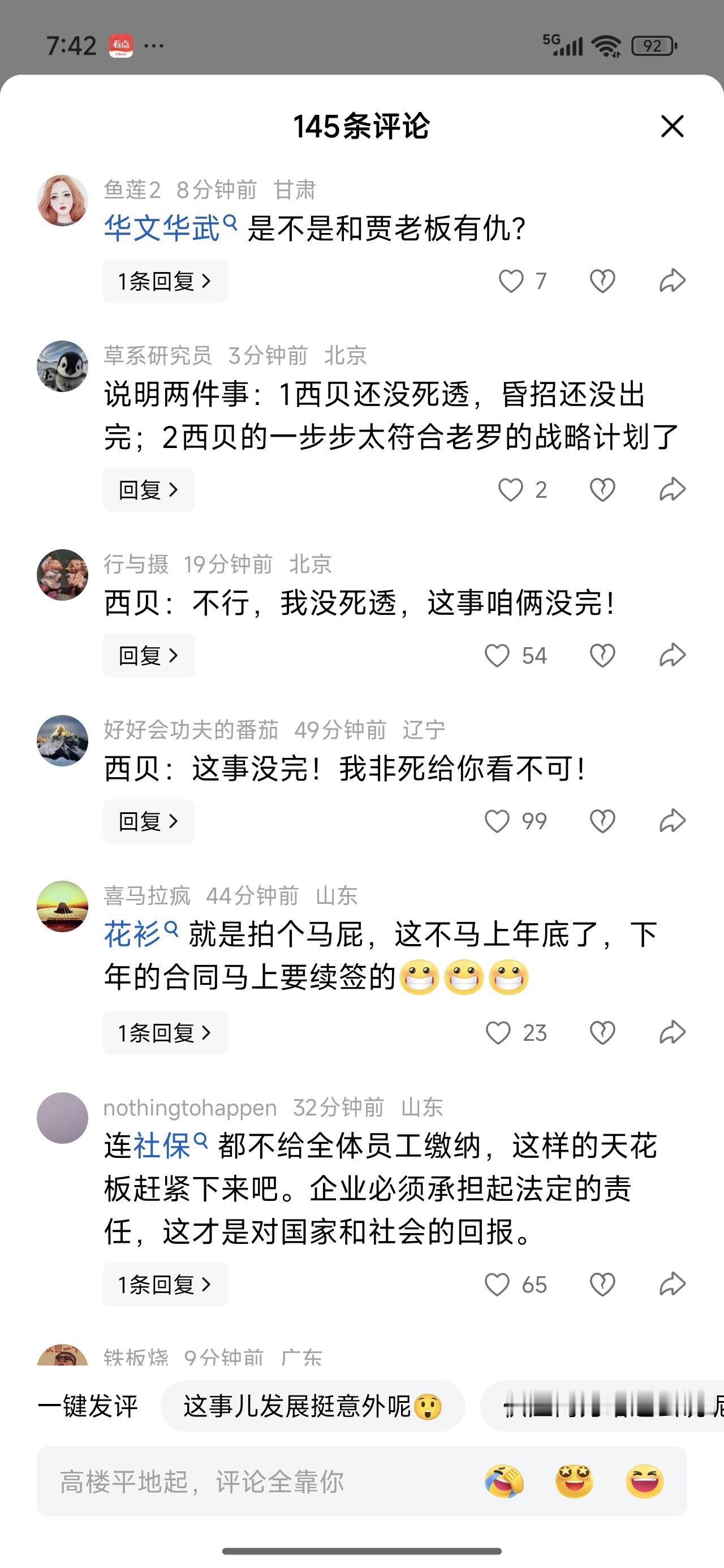 西贝这是嫌自己还没死透!又来招惹罗永浩了! 从来没有如此心疼一个资本家。按说资本家,能收割大众到什么程度,是由它的能耐和讲故事的本领决定的。与我无关。 我也没什么米去吃它的饭。倒是它,放着好好的韭菜不愿意割了,一天天的拿刀对准自己的胸口,有时候刀背朝内,夸夸就是砍,你不惹它了,它又拿刀尖儿一个劲儿的扎,还问,死给我看我看不看! 我看够了都。你爱咋咋吧!去过西贝的倒闭是贾国龙一个人的事,它倒倒去!它还有加盟商,还有厨师服务员。有万千个家庭在后面,泪眼婆娑的看着它。老罗啊,算了吧!吃点脏东西死不了人。多贡献点医疗届的Gdp罢了。西贝现状 西贝餐厅事件