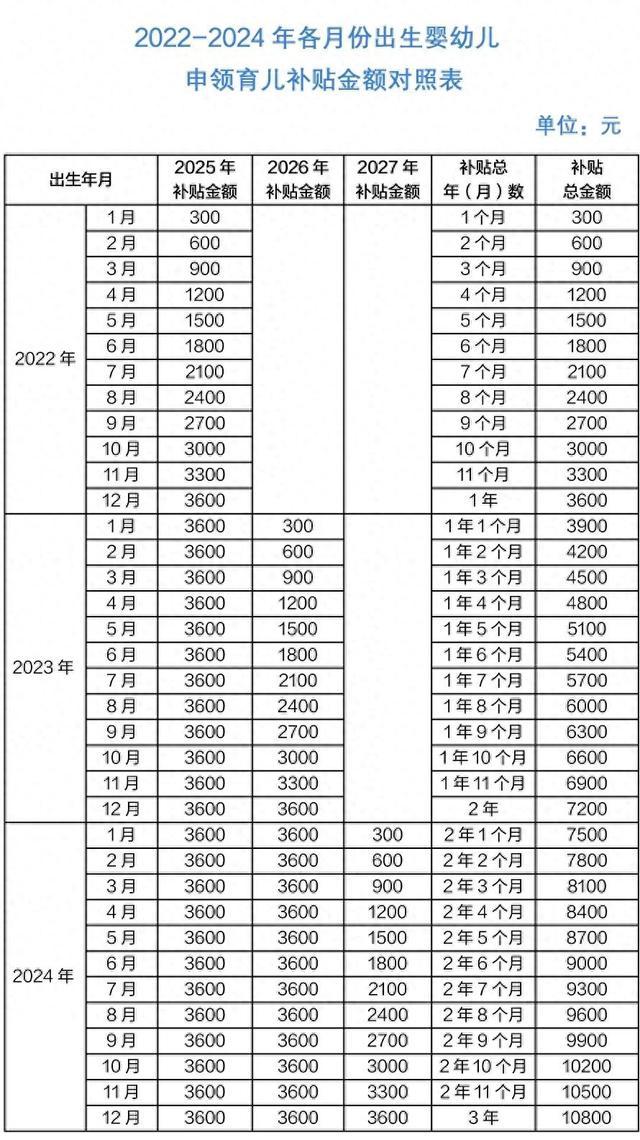 2022-2024年各月份出生婴幼儿育儿补贴金额(详见下表):