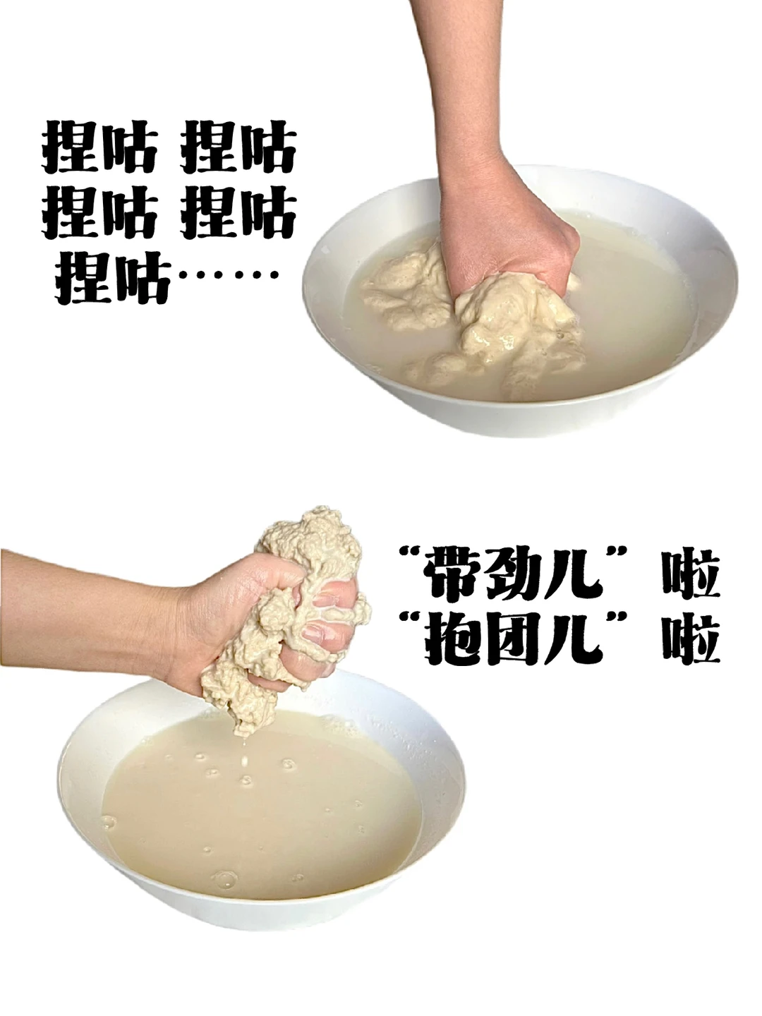 3.用手反复捏咕泡过水的饼皮