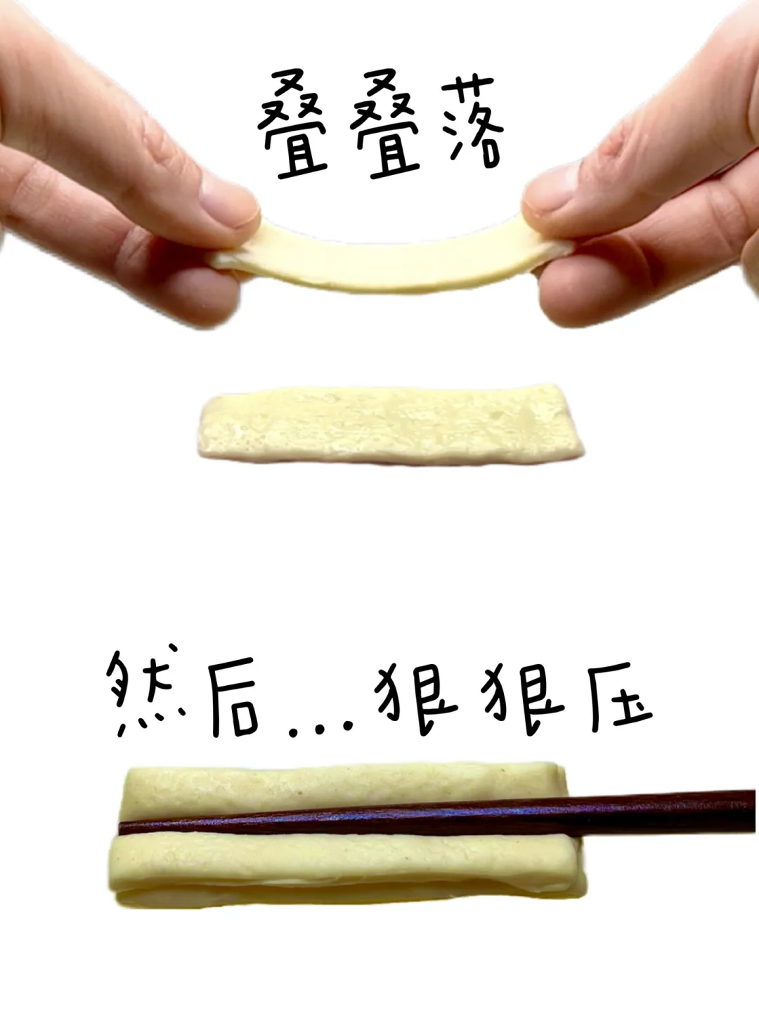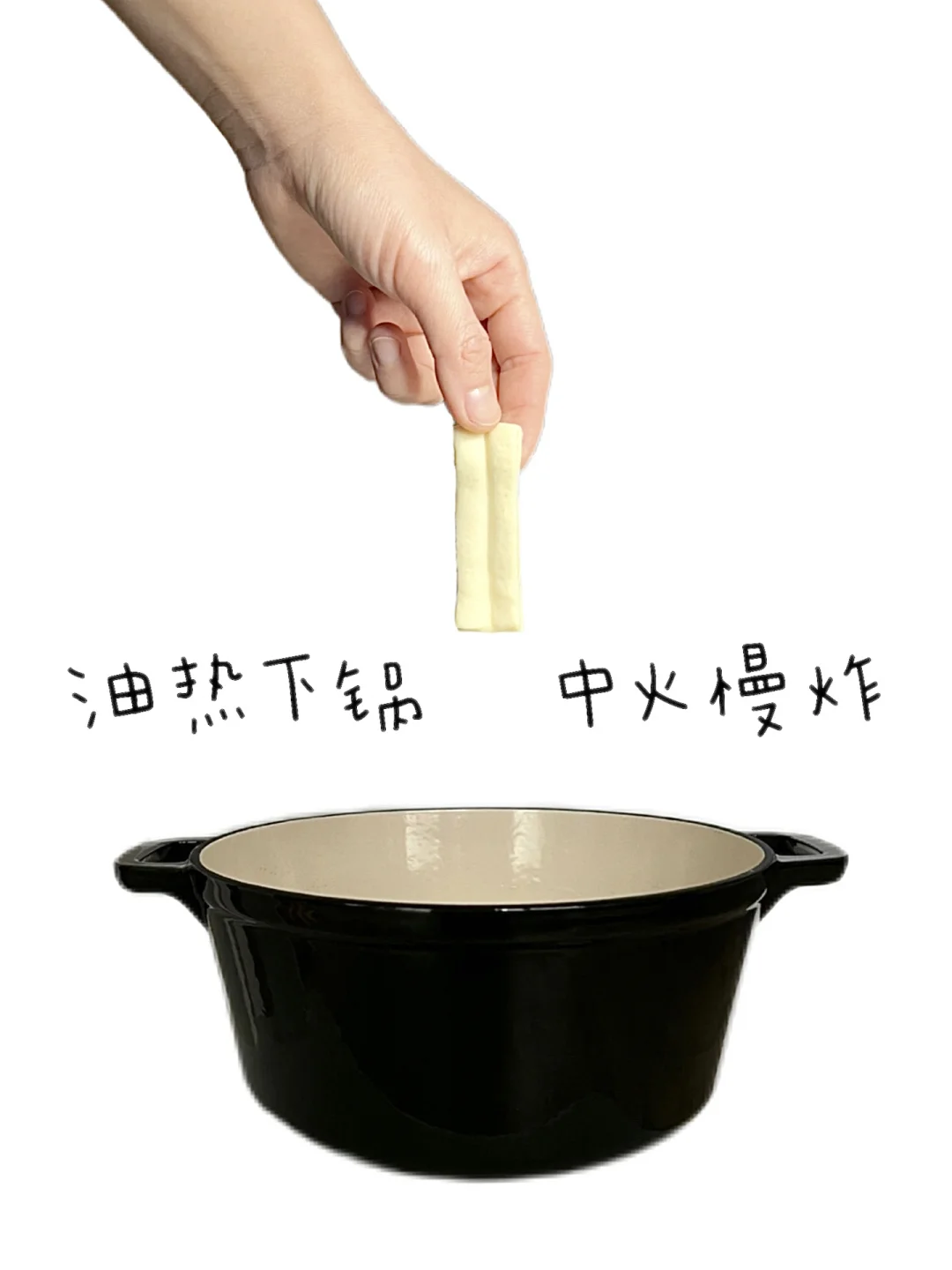 炸大油条要用大锅才炸得开 一次下来要倒大半瓶油 做这种小油条 用小锅炸 比炸大油条用油少很多 剩下的油刚好泼了一碗辣椒油 步骤: 1.切条 2.取两条叠在一起 3.用筷子在中间压到底 4.油热后下锅并用筷子不停翻动 5.中火炸至金黄即可 👉Tips: 披萨皮从冰箱取出后直接制做