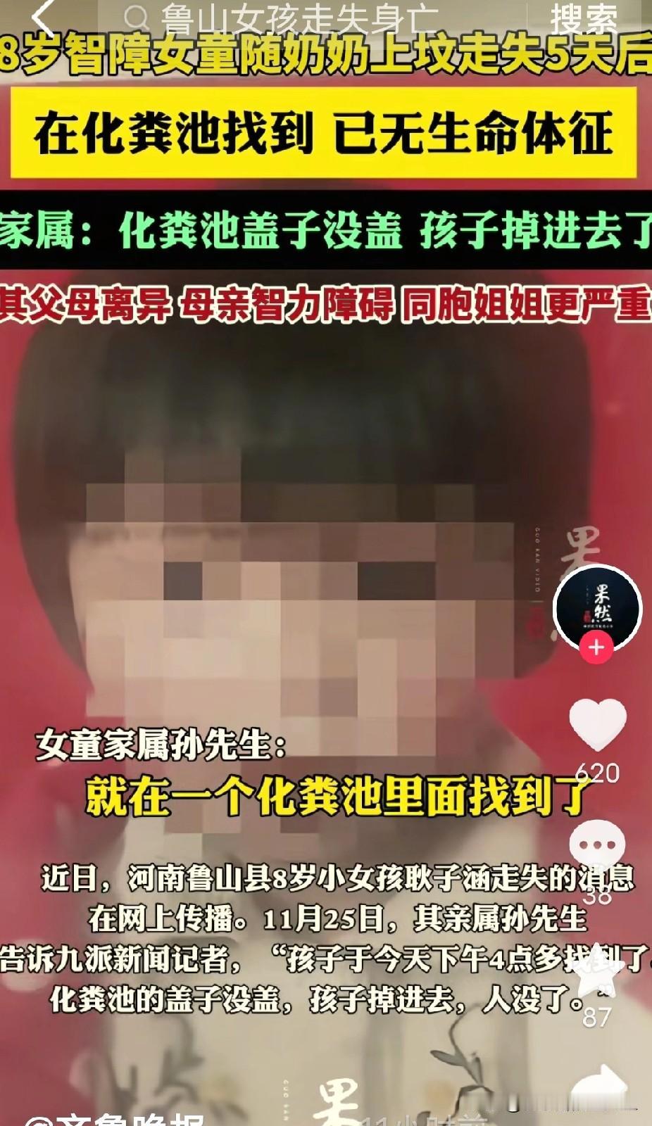 奇了怪了!河南一8岁小女孩和奶奶骑着电动车去上坟,不料回家途中短暂停了一会儿,小女孩就不见了。家属和救援队、民警在寻找了3天,小女孩就像人间蒸发一般,不见踪影! 最让人背后发凉的不是“找不到”,而是明明有了线索,结果却是一个无法解释的死循环。 搜救队带来的警犬在现场嗅了小女孩的气味后,一路追踪,你猜怎么着?这狗不是往远处跑,反倒是顺着小路一直追到了几公里外小女孩自己的家里。更邪乎的是,从监控最后拍到孩子的点再次让警犬嗅探,结果还是一样,转了个圈又追回了家。这简直像个鬼打墙的怪圈,线索明明就在眼前,却把人引向一个解不开的死结。专业的搜救人员都直说“有点弄不会了”。天上飞的无人机、地上拉的搜救队,把方圆十公里翻了个底朝天,可小女孩耿子涵就像凭空消失了一样。 谁能想到,最终打破这个死循环的,竟是一个没盖盖子的化粪池。五天后,孩子的遗体在距离最后被看见地点不远的一处化粪池中被发现。那个池子大部分盖着,偏偏就留了一个要命的口子。一切似乎都有了答案,警犬追踪回家的迷惑行为也说得通了——或许风向、地形或者气味的残留,给了一个错误的指引。 但这结局,比找不到更让人心碎。它暴露的问题一箩筐:农村地区那些危险设施的安全管理是不是形同虚设?一个有着智力障碍、需要特别看护的孩子,交给一位70多岁的老人独自照看,这个家庭的支撑体系是不是太单薄了?奶奶用绳子把孩子拴在电动车上的无奈之举,背后是多少类似困境家庭的辛酸与无力。 说一千道一万,安全这根弦时刻不能松。对于年幼、特别是像耿子涵这样有特殊需求的孩子,看护时真的不能存有丝毫侥幸心理,务必确保孩子不离开视线范围。同时,社区和社会也需要给这些家庭更多关注和实际的支持,避免悲剧重演。 各位读者你们怎么看?欢迎在评论区讨论。