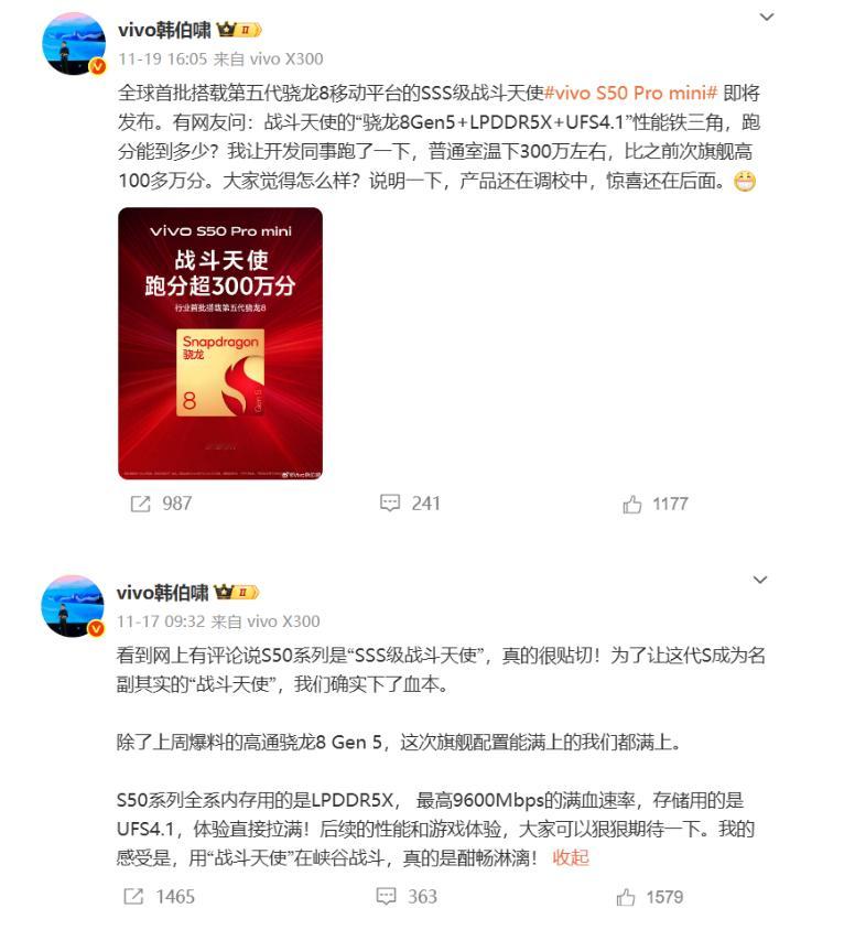 提前分析下骁龙8Gen5,先说结论吧,基本就是上代骁龙8elite的"降级版"以骁龙8至尊5和骁龙8至尊作为对比,三款芯片都是第二代3nm工艺,不过在架构上,这三款除了Oryon(2+6)全大核之外,其他刀法相当精准,骁龙8Gen5是2x3.8GHz 超大核和6x 3.32GHz大核,不如骁龙8至尊5,但是接近骁龙8至尊的2x 4.32GHz 超大核和6x 3.52GHz大核。其他部分,比如GPU这块,骁龙8Gen5是Adreno829(不如骁龙8至尊的830),但是内存和基带都是一样的,都是LPDDR5X 5300MHz和SnapGragon X85,至于跑分,没有实际跑过,还不能得出具体结论,但是预计可能只比骁龙8至尊稍逊一点点。最后就是各友商上机,其中自己还是最期待vivo S50系列,毕竟之前蓝厂的S系列更偏向好看的外观和不错的人像拍照,性能部分还是稍加欠缺,这次首批搭载骁龙8Gen5,无疑就是把性能和游戏这块补齐了,更别说这次S50系列的影像只会比之前更强,感觉唯一能限制这款手机的只有定价了,希望蓝厂给个惊喜呗。