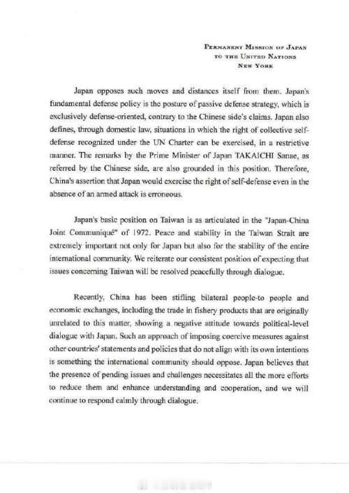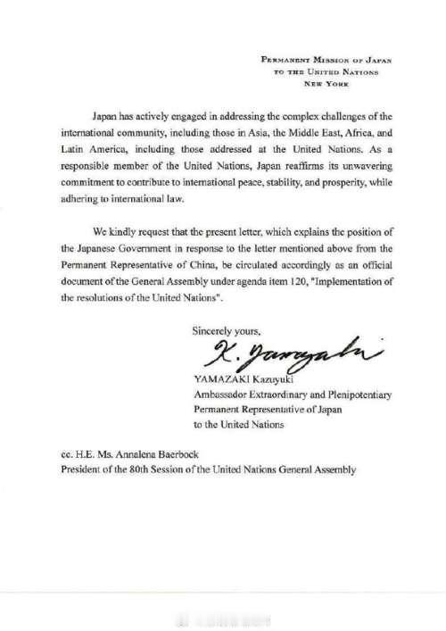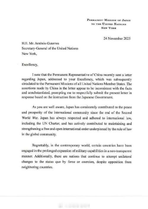 日本还真有脸给古特雷斯写信!?[酷拽][灵光一闪][惊呆] 嗨!自从中国特信给联合国秘书长阐述中国对“日本首相走钢丝”的批判观点后,万万没想到日本驻联合国代表居然也给古特雷斯写信了! 信中,日本不仅暗戳戳的污蔑中国,而且还胡扯八扯,居然大咧咧的插手台海事宜!日本常驻联合国代表、特命全权大使山崎和之更是有脸说:“作为联合国负责任的一员,日本重申其坚定不移的承诺,即在遵守国际法的同时,为国际和平、稳定与繁荣作出贡献。” 真是滑天下之大稽! 笔者从网络抄选“日本函件”全文,供友友们参阅! “致: 联合国秘书长安东尼奥·古特雷斯阁下 阁下: 我注意到,中国常驻代表最近就日本问题致函阁下,该信函随后已分发给联合国所有会员国的常驻代表团。中方在信函中所作的断言似乎与事实不符且缺乏根据,促使我根据日本政府的指示,恭敬地提交本信函作为回应。 如您所知,自第二次世界大战结束以来,日本一直为国际社会的和平与繁荣作出贡献。 日本始终尊重并遵守包括《联合国宪章》在内的国际法,并积极为维护和加强全球社会中以法治为基础的自由开放的国际秩序作出贡献。 令人遗憾的是,在当今世界,某些国家一直以不透明的方式进行长期的军事能力扩张。此外,尽管遭到邻国的反对,仍有一些国家继续试图通过武力或胁迫单方面改变现状。 日本反对这些举动并与之保持距离。日本的基本防卫政策是被动防卫战略的姿态,这完全是以防御为导向的,与中方的声称恰恰相反。 日本还通过国内法,对根据《联合国宪章》承认的集体自卫权可被行使的情况作出了限制性的界定。中方所提及的日本首相高市早苗的言论也是以这一立场为基础的。因此,中方关于日本即使在没有遭受武装袭击的情况下也会行使自卫权的断言是错误的。 日本在台湾问题上的基本立场,已在 1972 年的《日中联合声明》中阐明。台湾海峡的和平与稳定不仅对日本,而且对整个国际社会的稳定都至关重要。我们重申一贯立场,即期望台湾相关问题能够通过对话和平解决。 最近,中方一直在阻碍双边的人文和经济交流,包括与此问题本不相关的渔业产品贸易,并对与日本的政治层面对话表现出消极态度。这种针对不符合自身意图的他国言论和政策而施加胁迫措施的做法,是国际社会应该反对的。 日本认为,现有未决问题和挑战的存在,更需要我们加倍努力来减少它们、增进理解与合作,我们将继续通过对话冷静地应对。 日本一直积极参与应对国际社会的复杂挑战,包括亚洲、中东、非洲和拉丁美洲的挑战,以及在联合国处理的那些问题。作为联合国负责任的一员,日本重申其坚定不移的承诺,即在遵守国际法的同时,为国际和平、稳定与繁荣作出贡献。 我们恳请将本信函(解释了日本政府对上述中国常驻代表来信的回应立场)作为大会议程项目 120 “执行联合国决议” 下的正式文件予以分发。 您真诚的, 山崎和之 特命全权大使 日本常驻联合国代表” 笔者观点: 看看!小日本还是太嚣张了点![惊呆][灵光一闪][抠鼻][抠鼻]