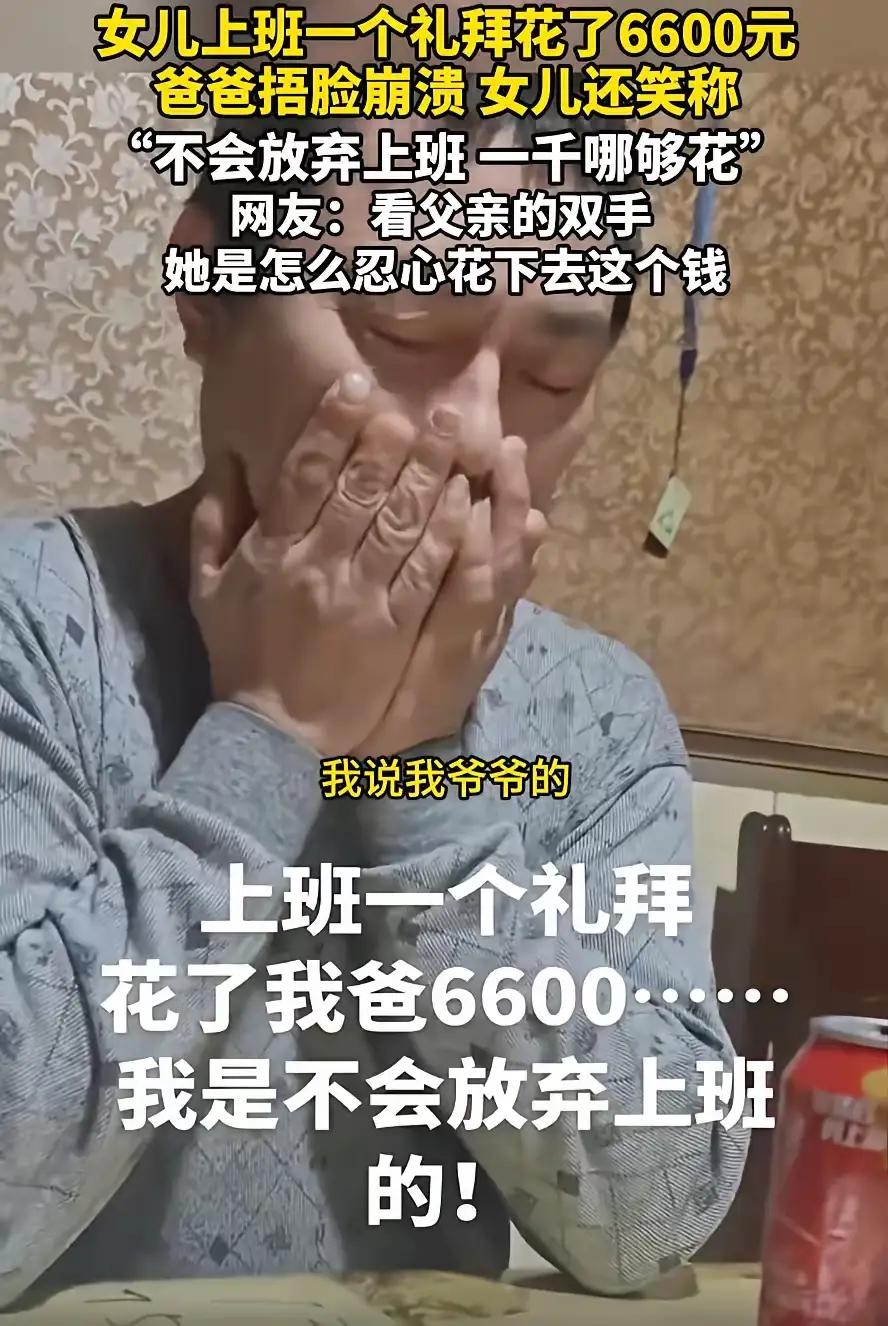 没有公主命却得了公主病!上海,一位女生上班一个礼拜辞职了,虽然自己只挣了1000块钱,却眼睛都不眨花了父亲6600块钱,当她向父亲炫耀自己1000元根本不够花时,父亲捂着脸崩溃痛哭。 我说不同情,会有人驳斥吗~钱在大人手上,怎么会被这样消费出去的,有没有觉醒,自己宠的后果,自己承担~闺女想要增加零花钱,我说每天咕咚三公里,五百,她不肯,我正好省钱~ 父母从来没教育过小孩如何过生活,长大养成吸血鬼太正常不过了。 这批孩子没吃过苦,以后也没有什么好的就业机会,如果不培养好还是大麻烦[呲牙]。 我以前有个同事每个月工资五千多,每个月花一万多,工资花完了就叫他爸转钱[捂脸]。 好多孩子都是这种毛病!没有公主的命,却有公主的病,躺平又发财,花钱心不疼。[灵光一闪][灵光一闪]