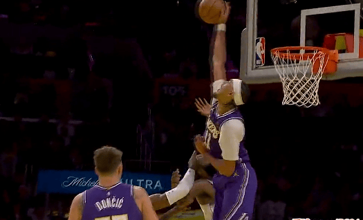 第三节比赛中,哈登过掉詹姆斯抛投出手,海斯篮下高高跃起送上排球大帽。