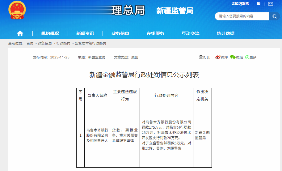 具体为:新疆金融监管局对乌鲁木齐银行股份有限公司罚款175万元,对昌吉分行罚款25万元,对乌鲁木齐经济技术开发区支行罚款20万元等。