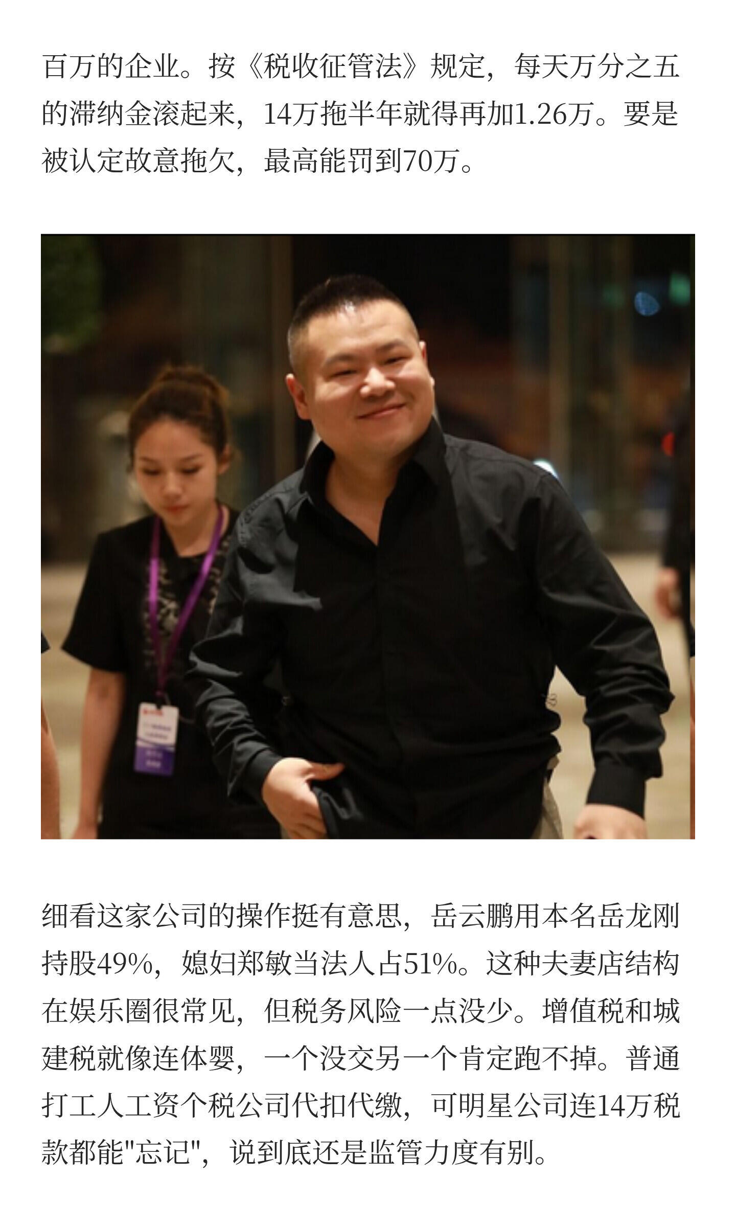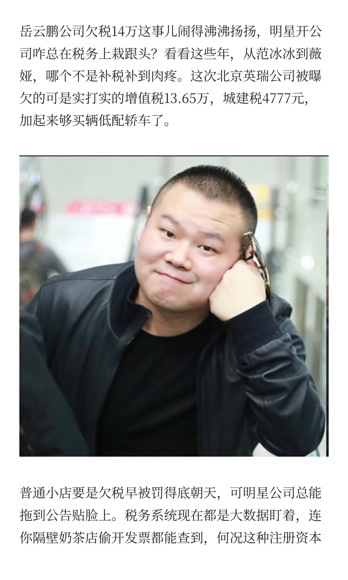 岳云鹏夫妇公司14万欠税!11月26日,企查查APP显示岳云鹏夫妇持股的北京英瑞国际贸易有限公司因欠缴城市维护建设税4777元、增值税13.65万元被国家税务总局石景山区税务局公告。该公司由郑敏(持股51%)任法人,岳云鹏(本名岳龙刚)持股49%任监事,欠税总额超14万元引发公众对明星税务合规性的关注。事件曝光后,“明星形象与纳税责任反差”成为热议焦点,网友调侃“德云社包袱没税务单实在”。该案再次凸显文娱行业税收监管必要性,公众呼吁艺人强化法律意识,税务部门“公告即追缴”的透明化举措获舆论支持。