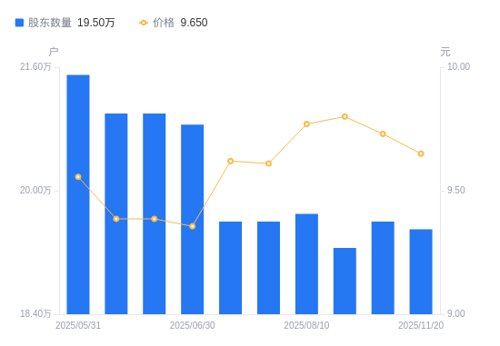 日期A股户数(户)流通A股户均持股数(股)户均持股市值(万元)2025-11-2019500023073.3222.272025-10-3119600022955.5922.342025-09-3019258023363.2622.902025-08-1019700022837.5622.312025-08-0219600022954.0822.062025-07-3119600022954.0822.082025-06-3020856921570.8020.182025-06-2921000021427.0420.112025-06-2721000021427.0420.112025-05-3121500020928.7320.00